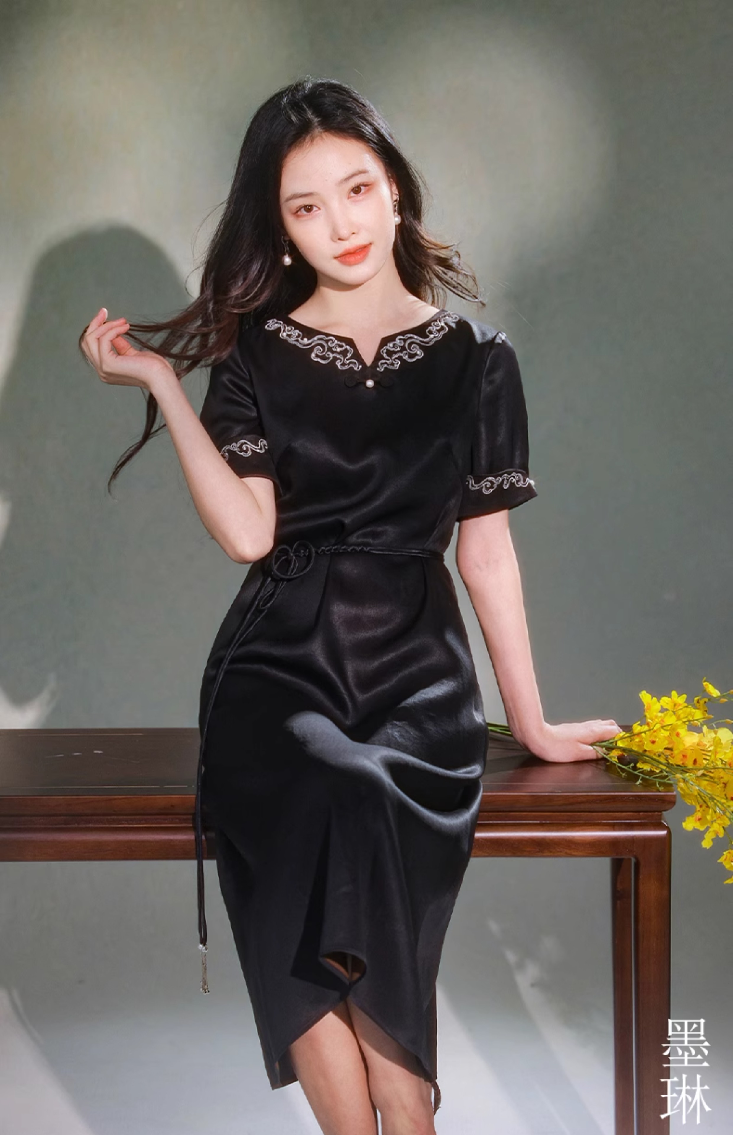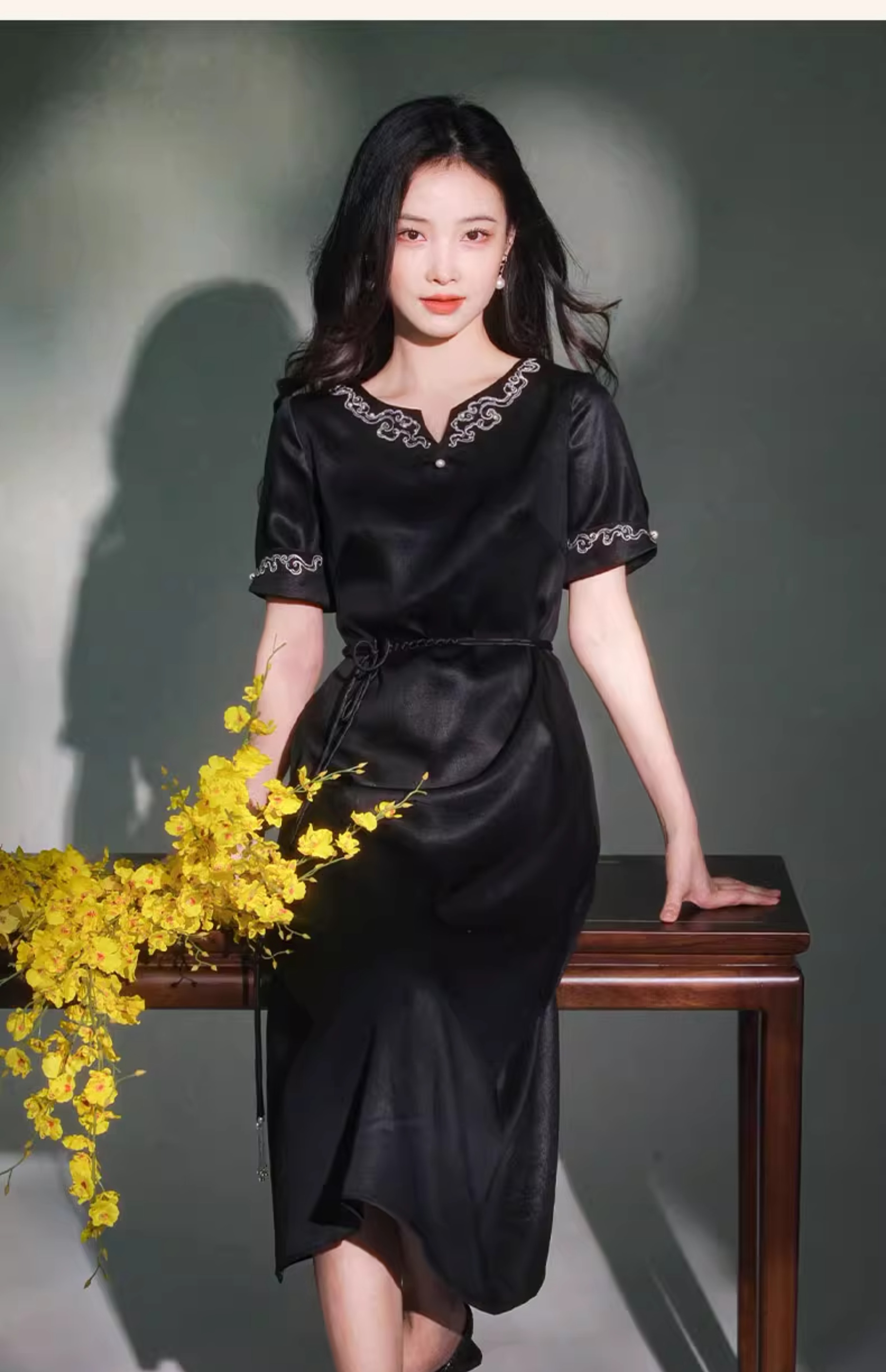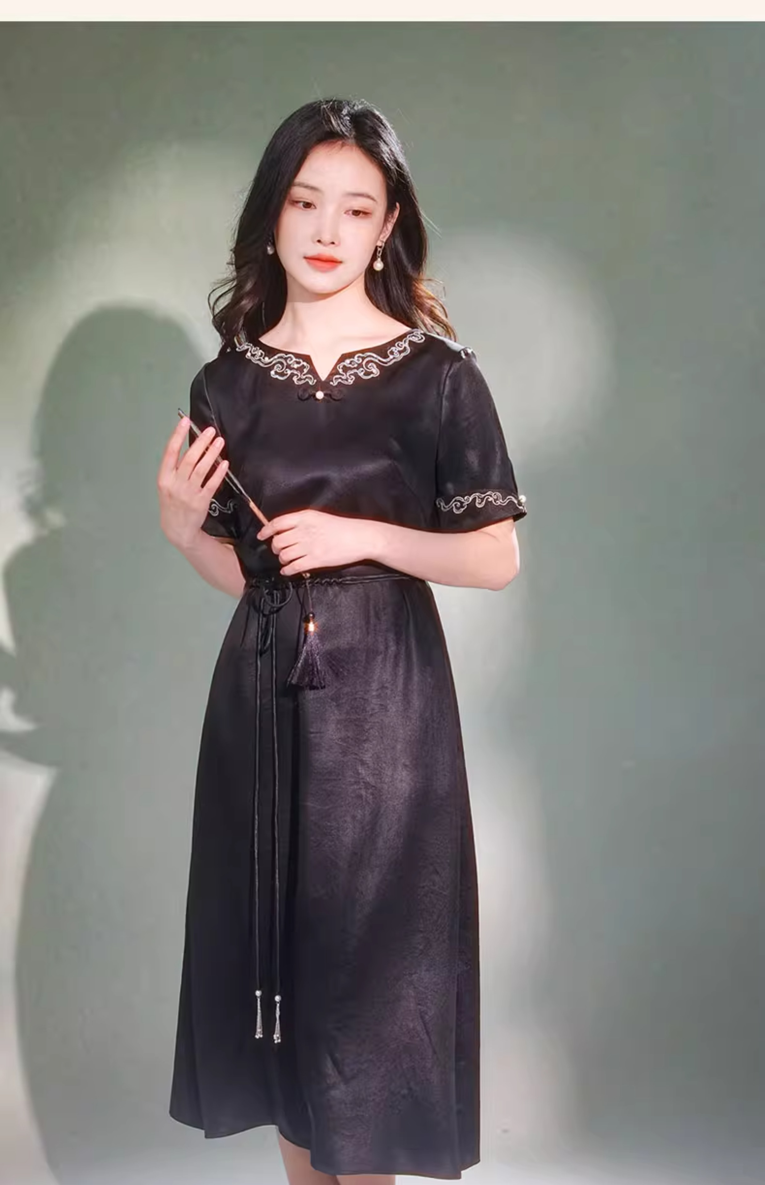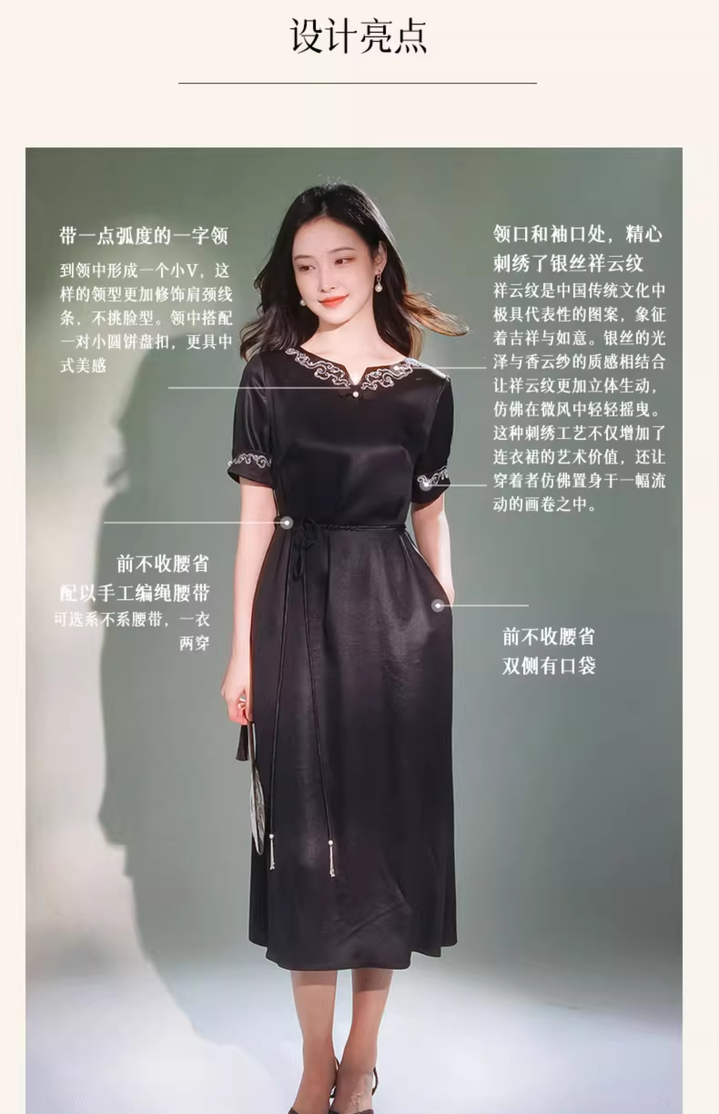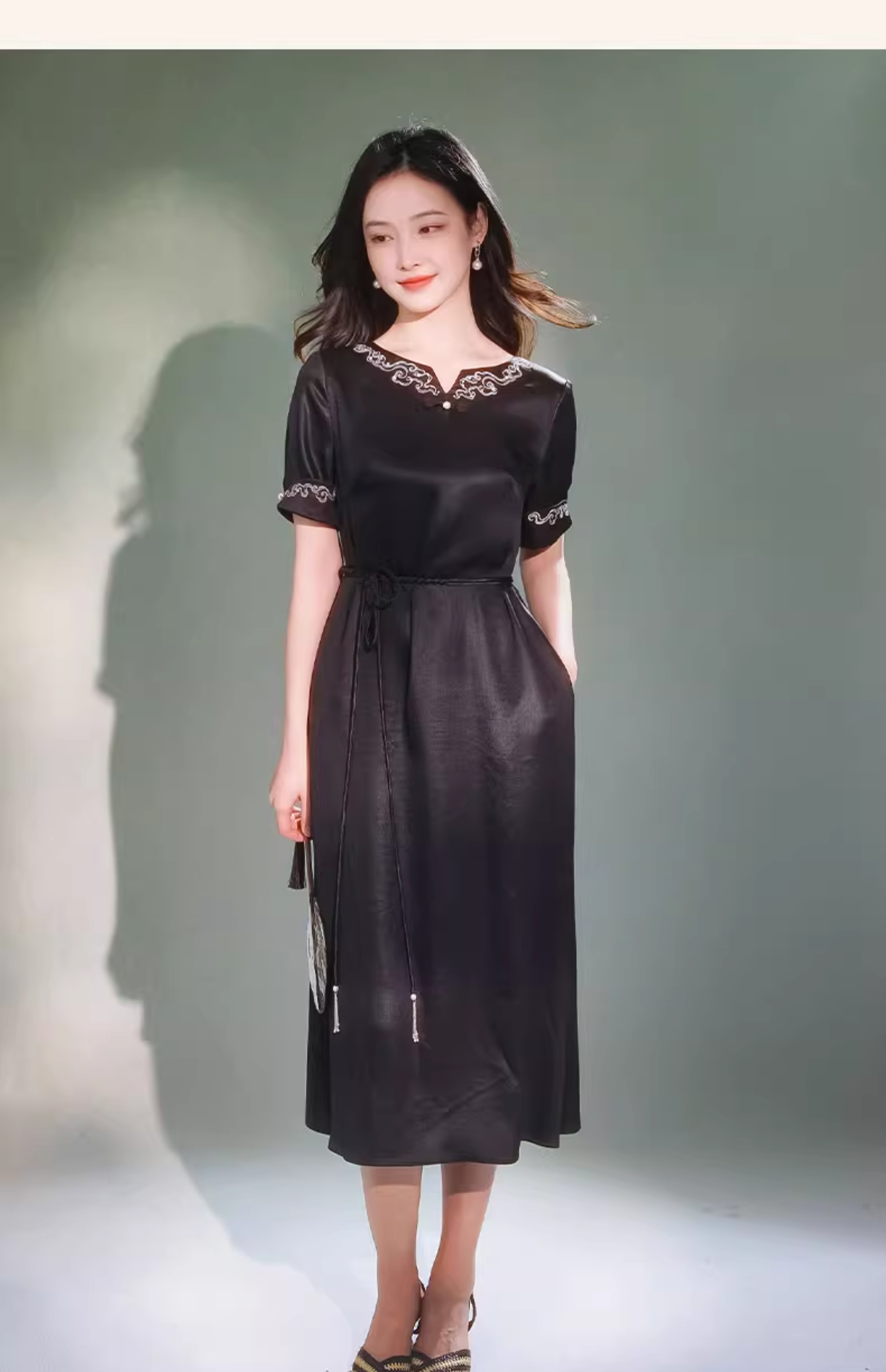 逸红颜墨琳2025夏新款25姆弹力真丝香云纱刺绣钉珠新中式连衣裙女