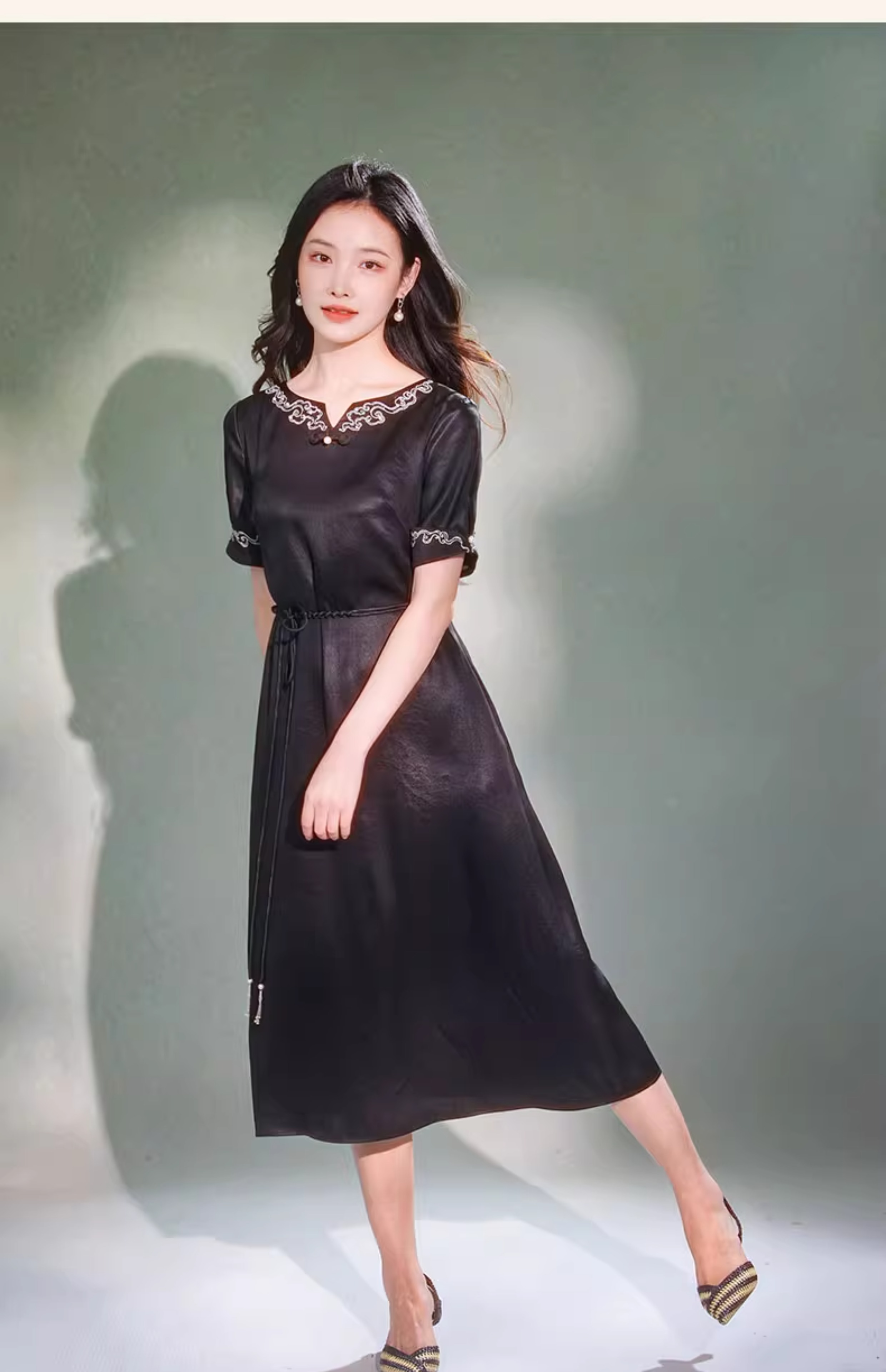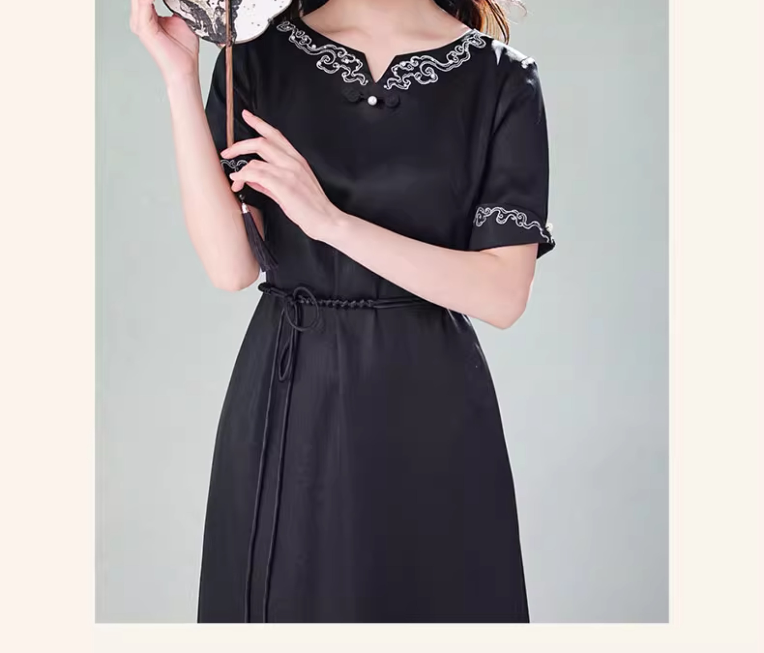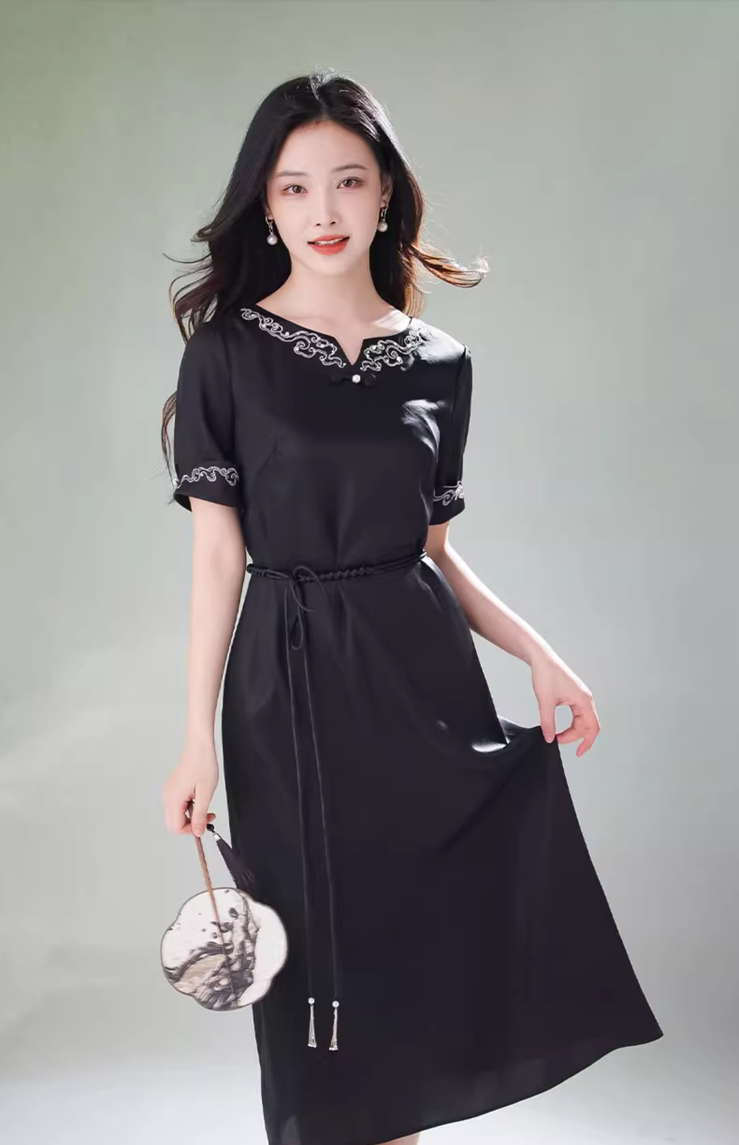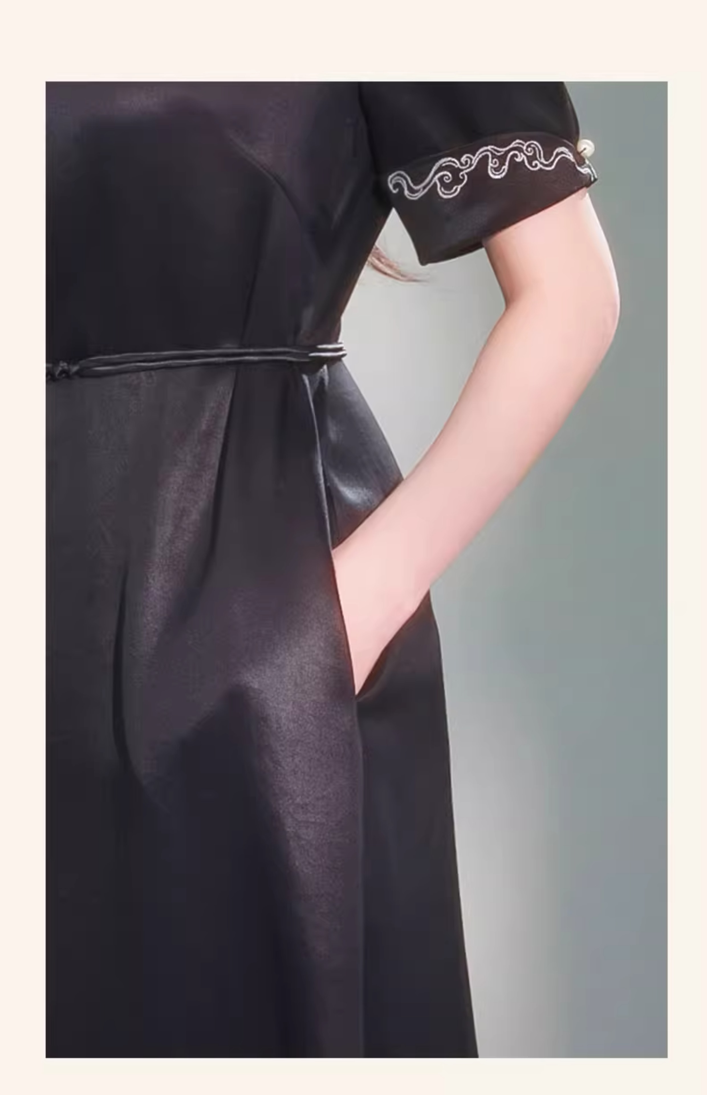 逸红颜墨琳2025夏新款25姆弹力真丝香云纱刺绣钉珠新中式连衣裙女