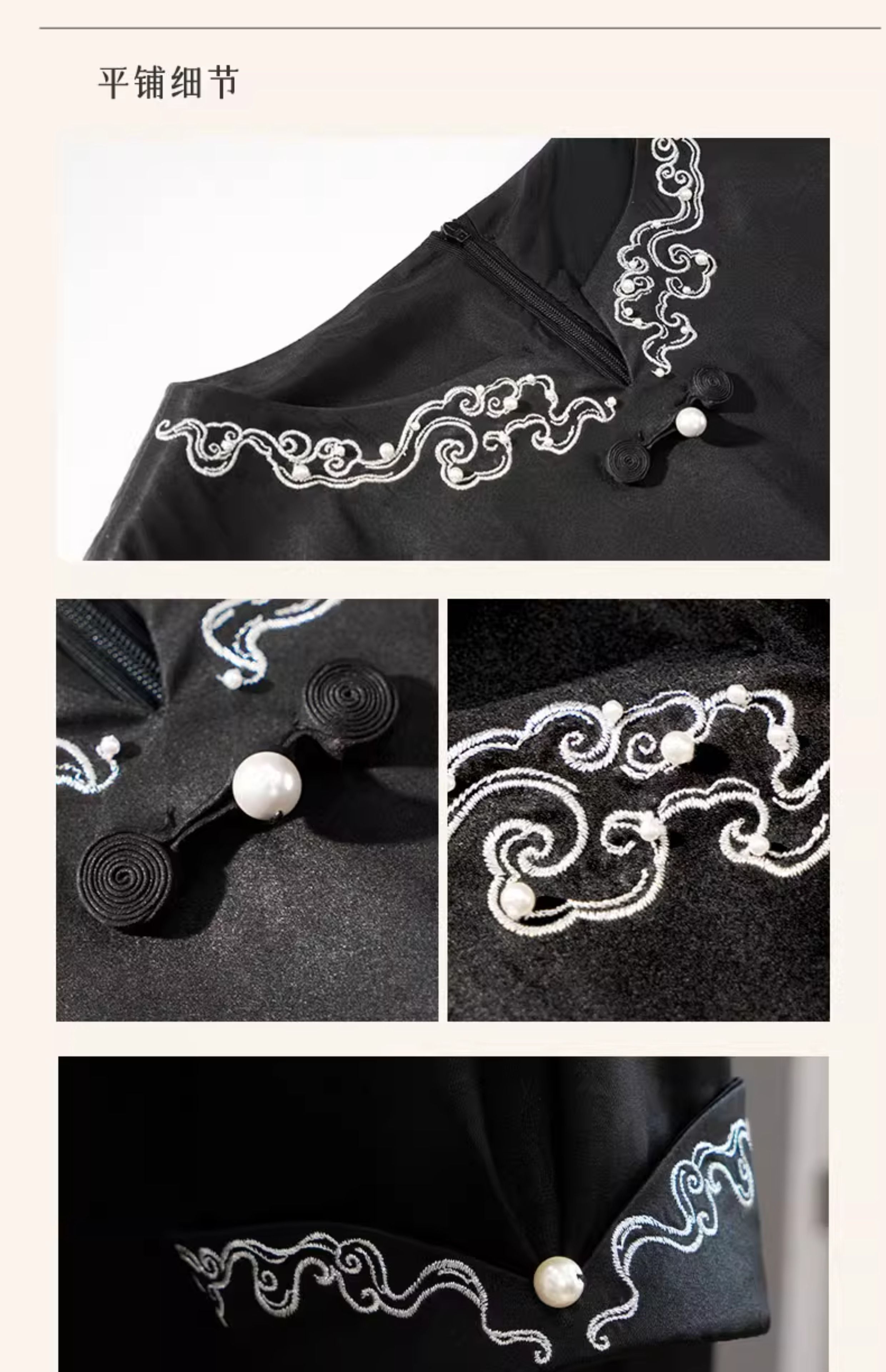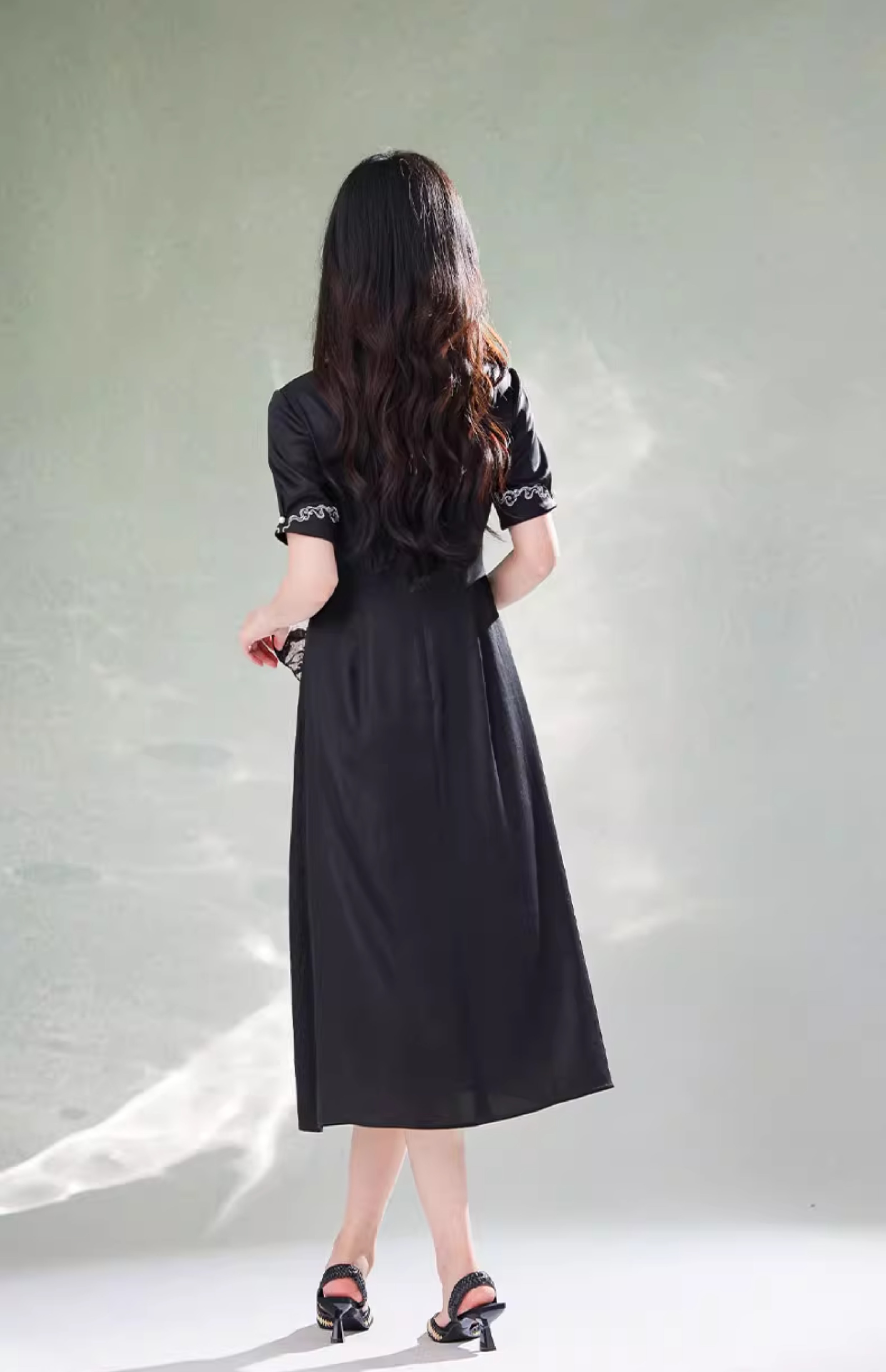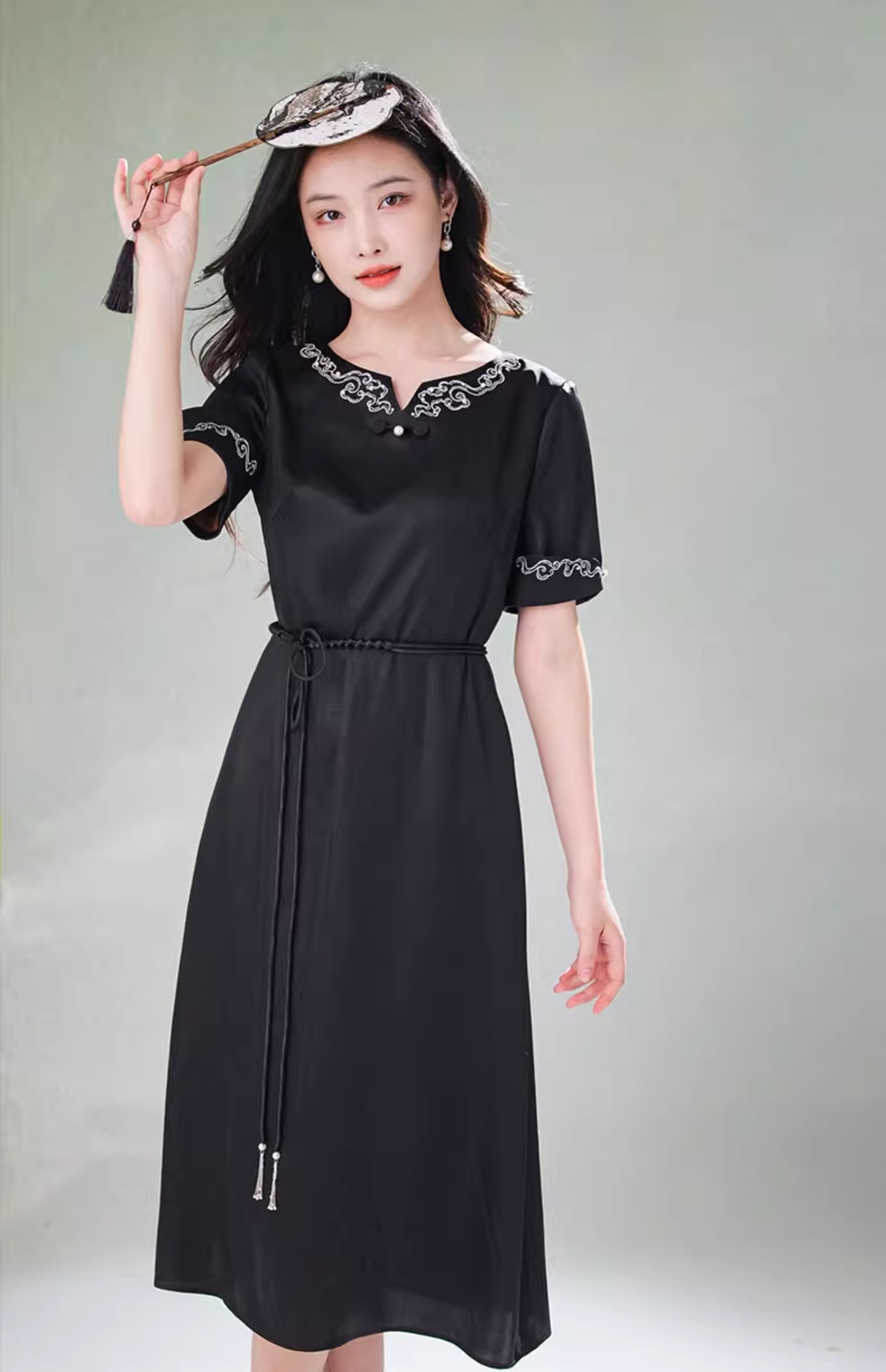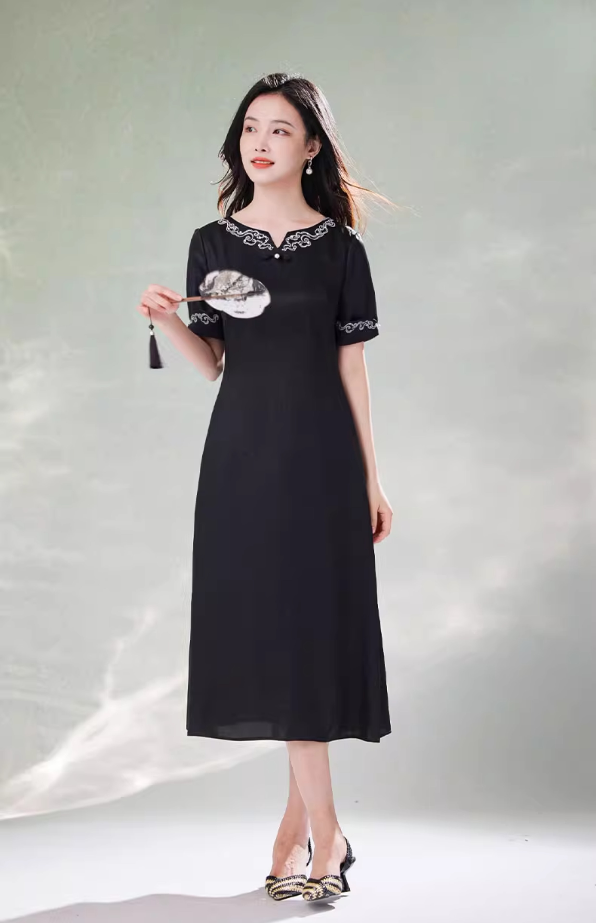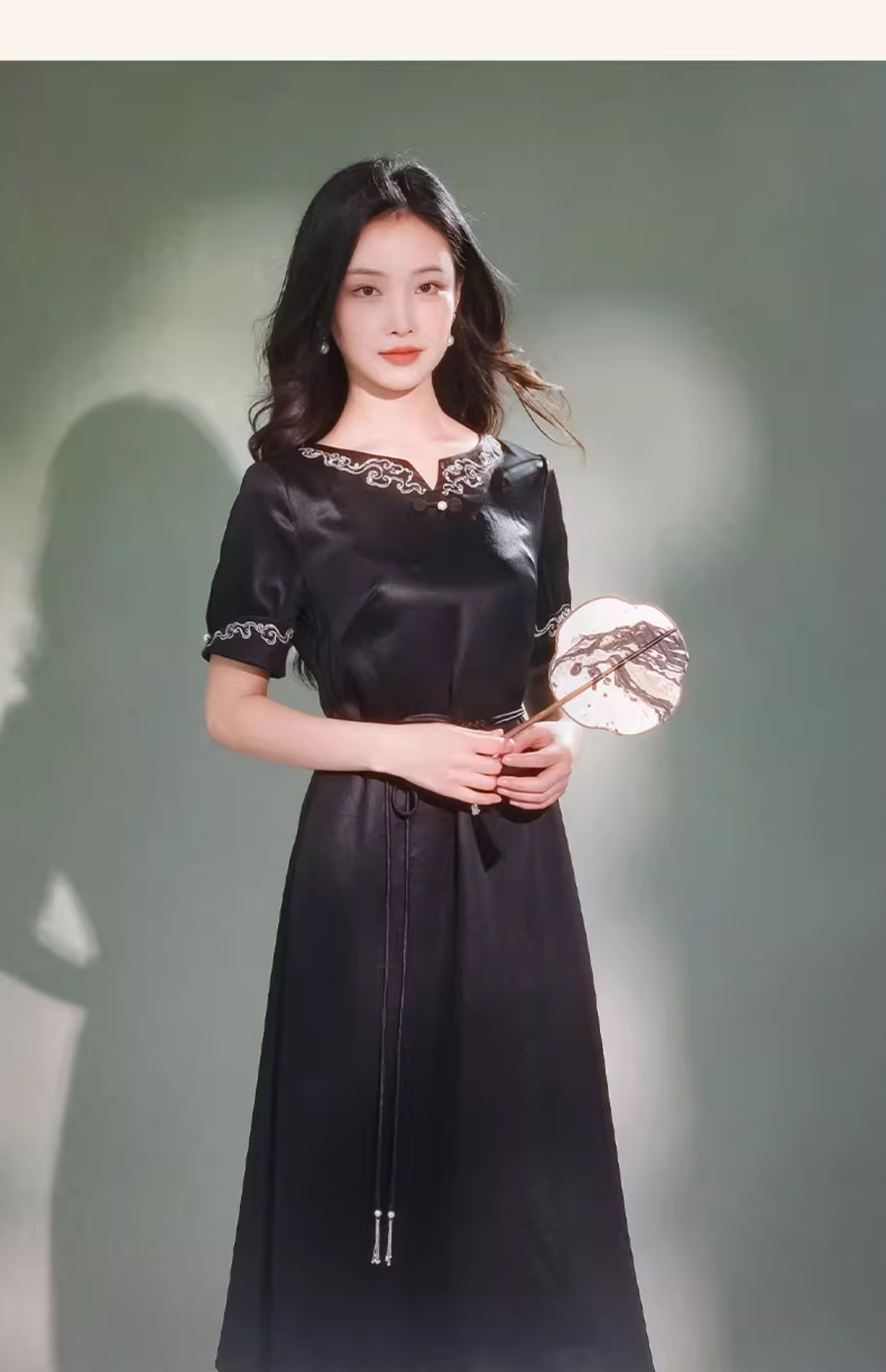 逸红颜墨琳2025夏新款25姆弹力真丝香云纱刺绣钉珠新中式连衣裙女