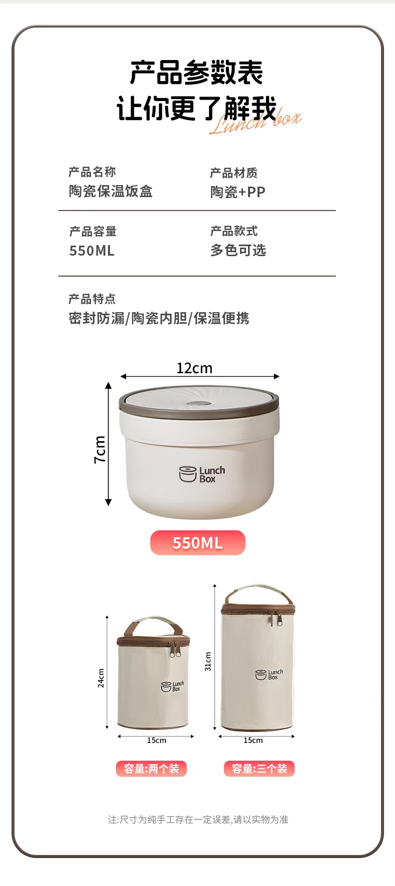 【品名】陶瓷内胆保鲜饭盒 可微波 耐高温耐腐蚀 双层装/三层装 【规格】红白、黄蓝、灰白、蓝白 【产地】国内 【发货包装】独立包装 【发货地】广东 【发货快递】中通 【不发货地区】新疆、西藏、港澳台 【发货时效】48-72小时,周末节假日顺延 |