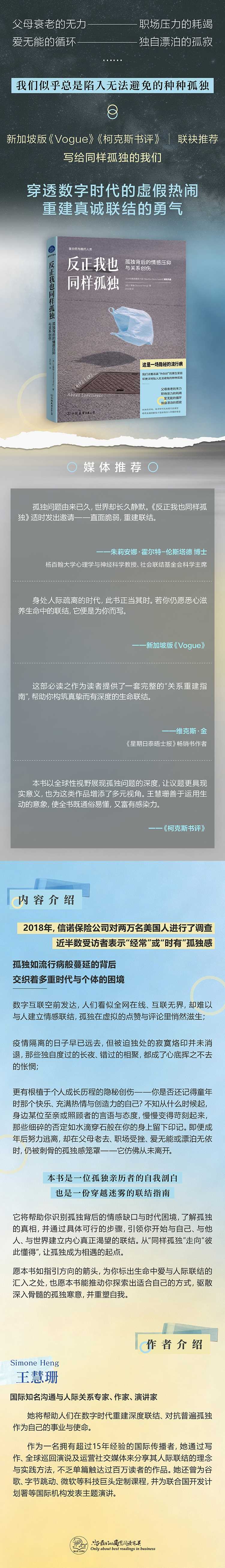 本书以全球性视野展现孤独问题的深度,让议题更具现实意义,也为这类作品增添了多元视角。王慧珊善于运用生动的意象,使全书既通俗易懂,又富有感染力。