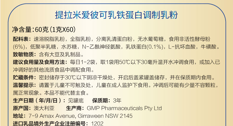 【源码】TLAMEE/提拉米 爱彼可乳铁蛋白粉 60g(1g*60条)