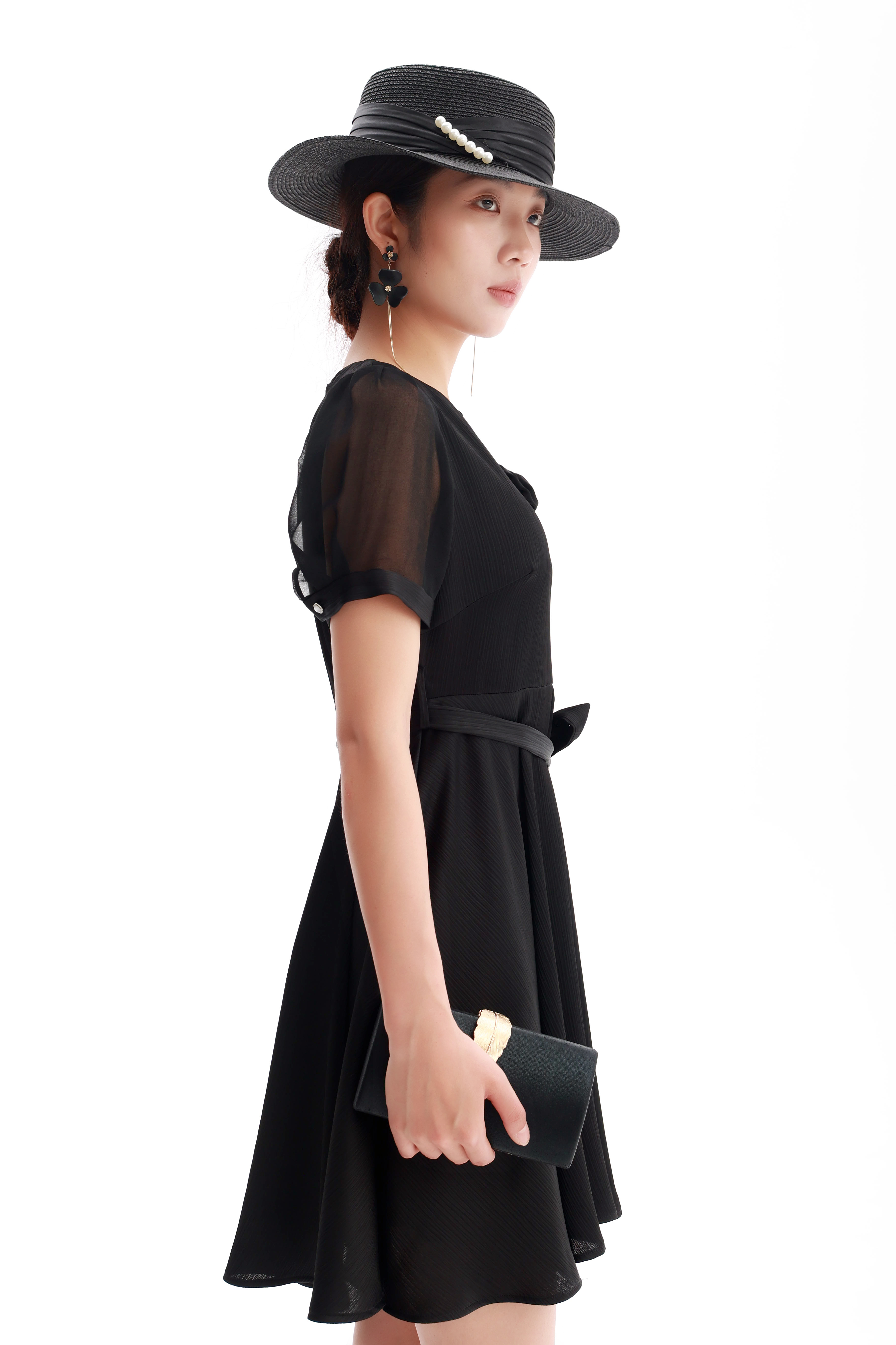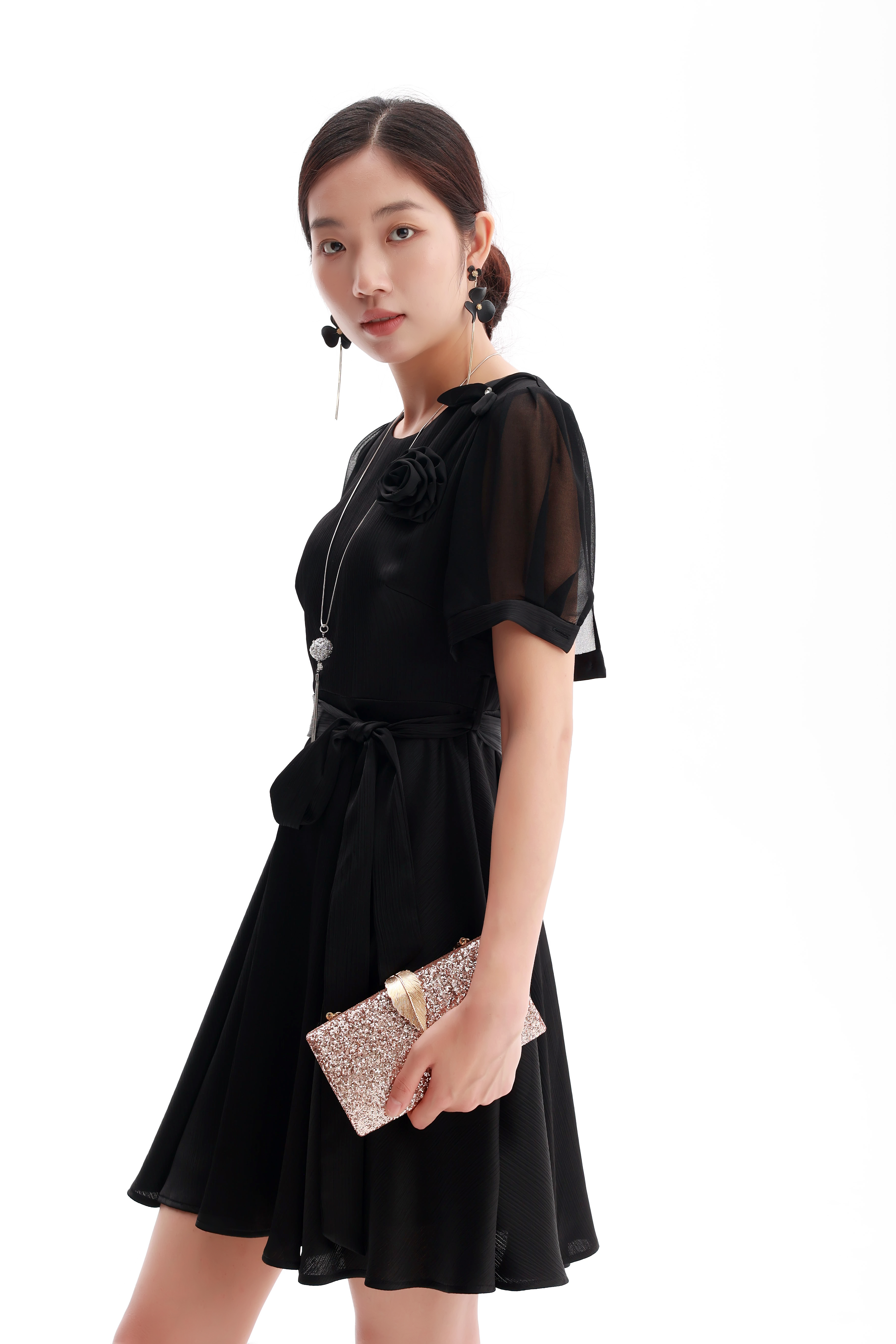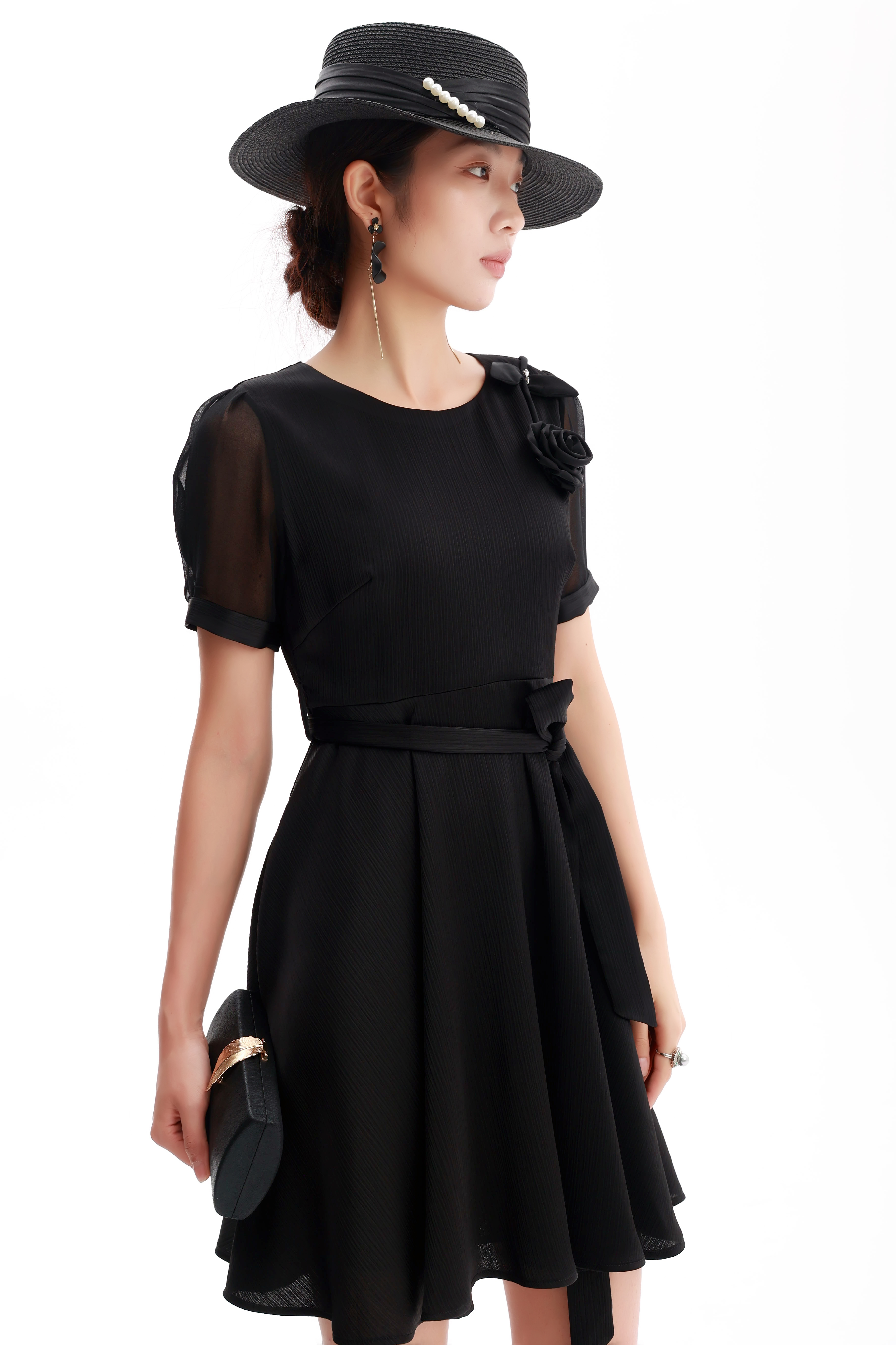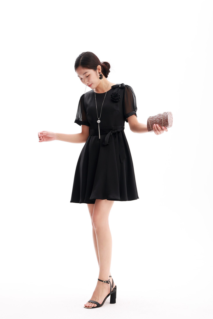 HJ2S32_漆黑色_连衣裙_四季_气质优雅立体花朵网纱袖收腰系带显瘦 A 字短裙_高级女装_BERNIEELEN 伯妮斯茵
