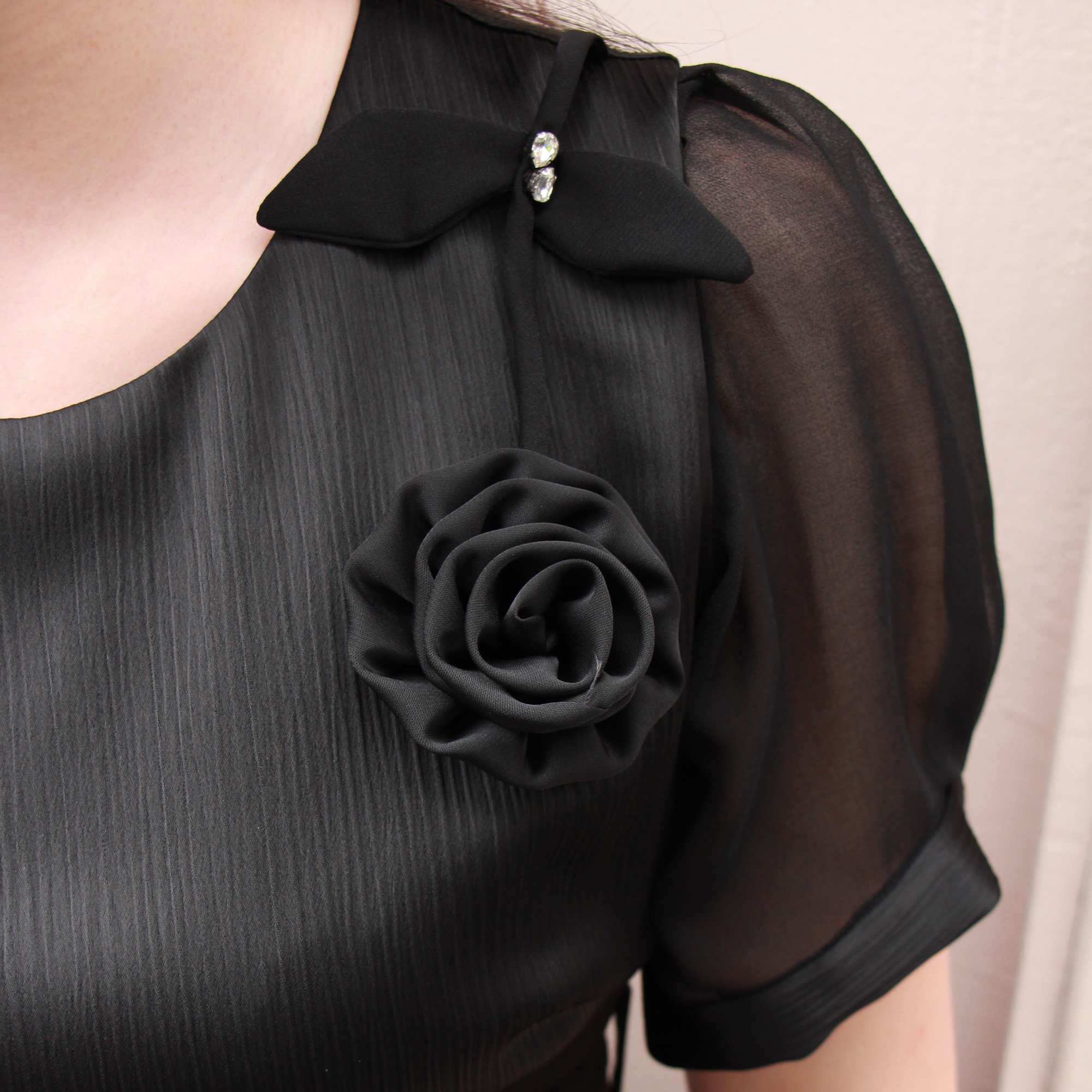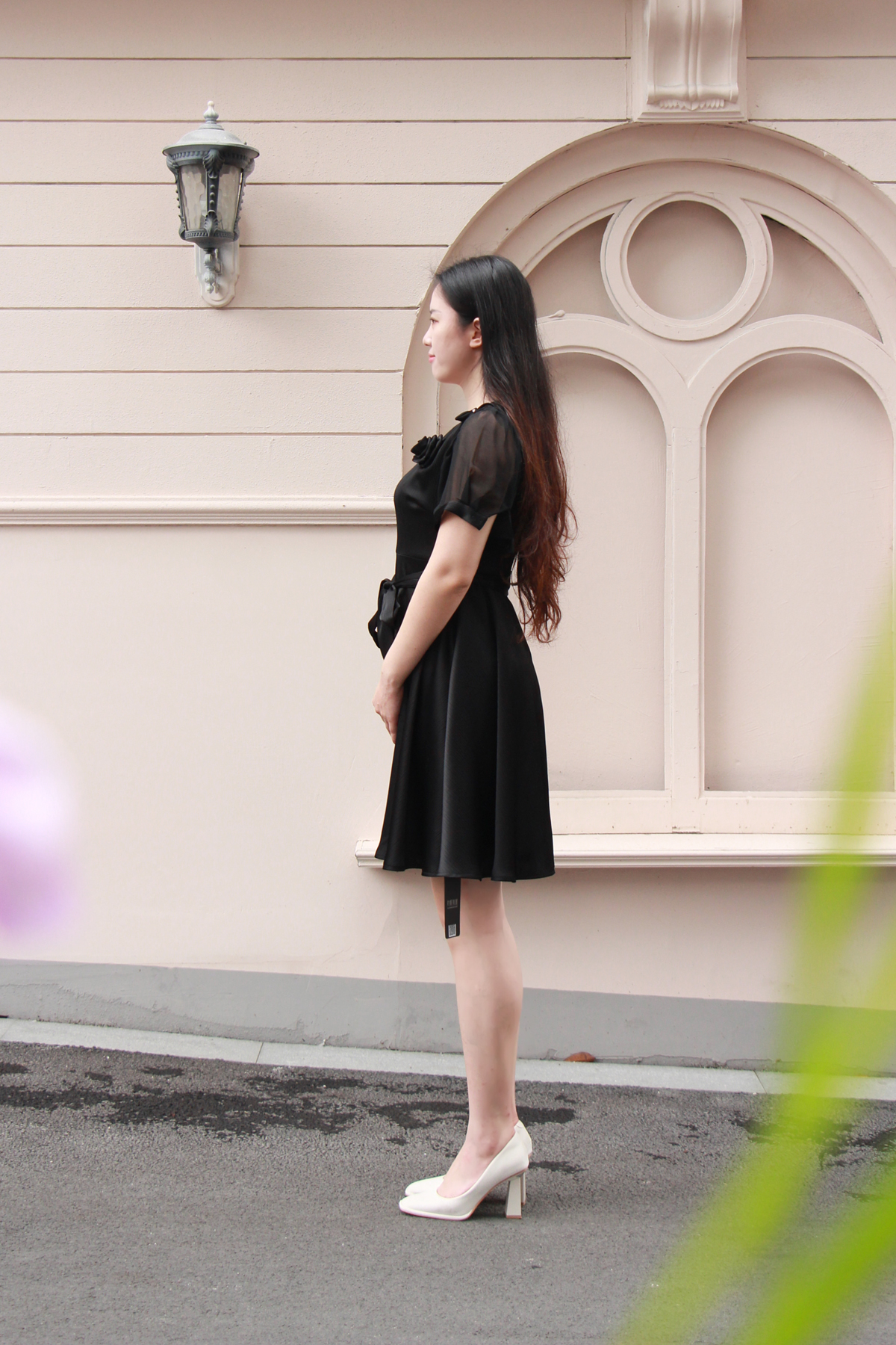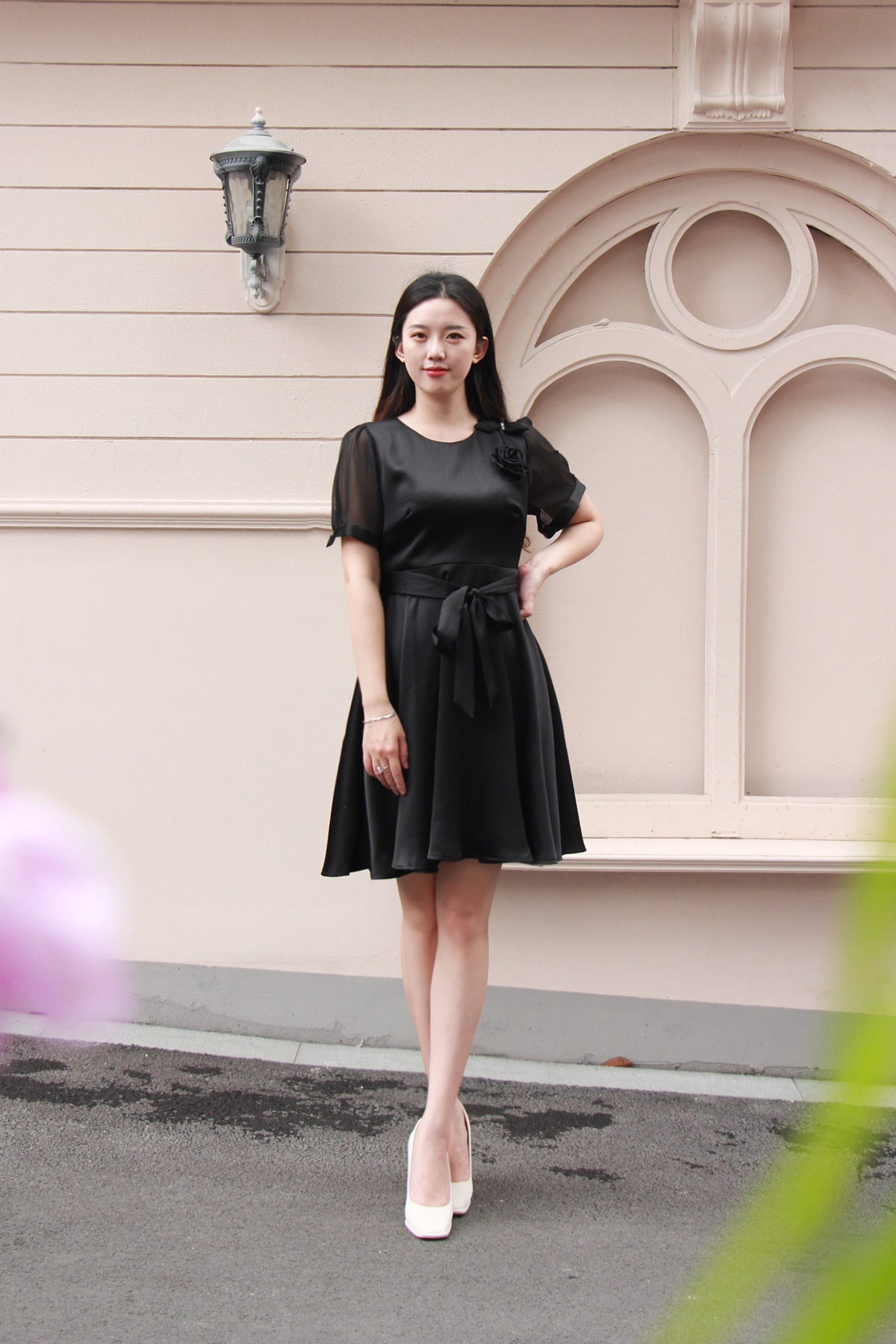 HJ2S32_漆黑色_连衣裙_四季_气质优雅立体花朵网纱袖收腰系带显瘦 A 字短裙_高级女装_BERNIEELEN 伯妮斯茵