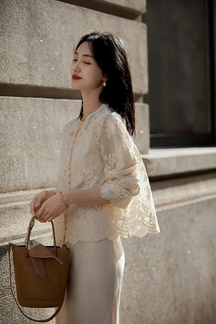 搭配我们的刺绣小上衣,新中式的味道不就来了,温柔典雅的气质一下就出来了。