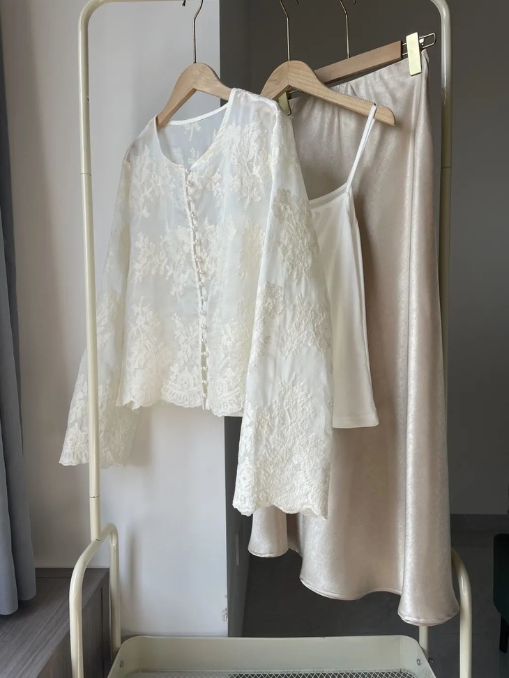 超美新中式三件套=温柔小圆领波浪边天丝刺绣小上衣+内搭小吊带+搭配缎面流光半裙