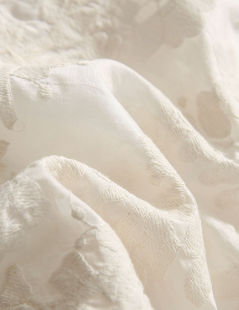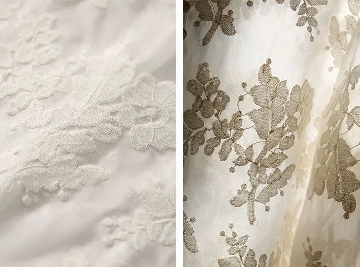 光滑柔美的布料上,用同色的细线精心刺绣了满布繁花,每一朵花儿都绽放着精致而生动的姿态。