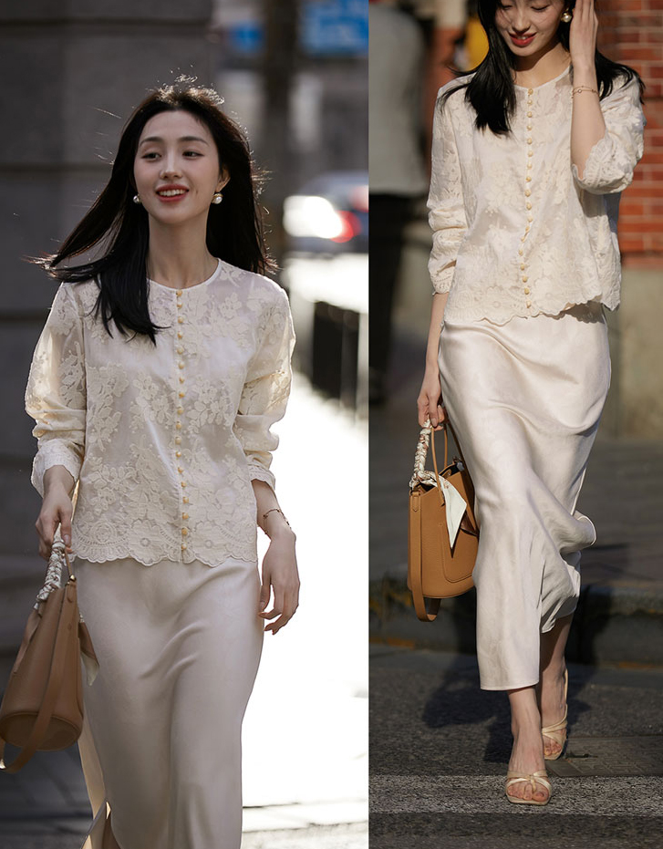 穿上它,转身间,光泽在柔和的阳光照射下流转,刺绣的花朵仿佛随着你的舞动而生动起,将法式浪漫感体现的淋漓尽致,像是油画里走出来的少女。