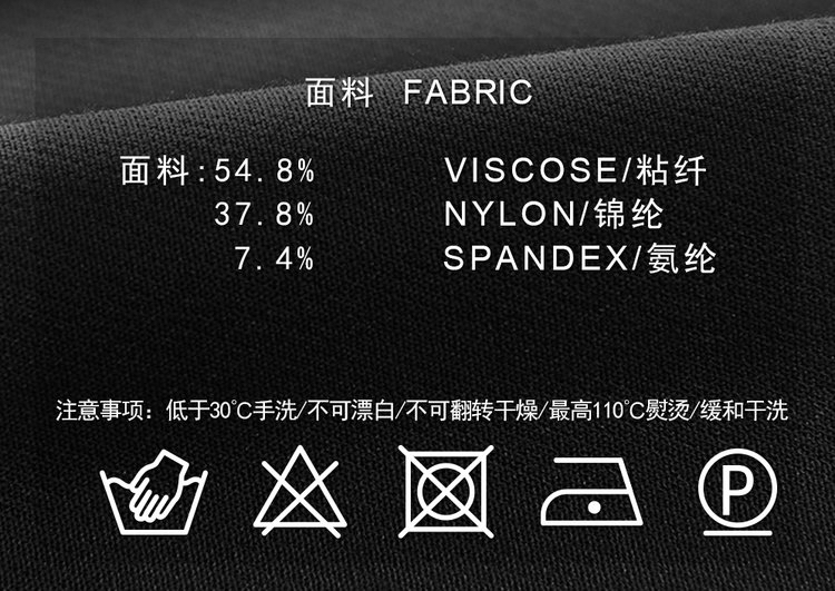 氨纶(Spandex) 强力加持,提供恰到好处的四面弹力!活动自如无束缚,形成温柔却坚定的支撑力,久坐不皱、久穿不垮,时刻保持利落廓形。天然垂坠感 + 智能回弹性 = 行走的高级感!