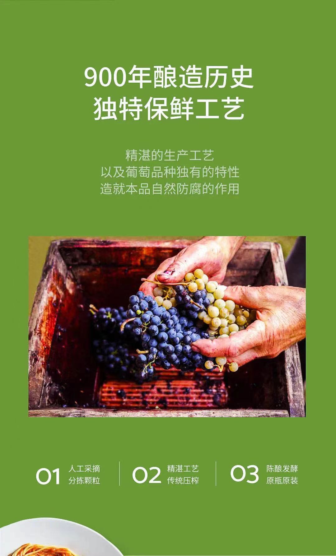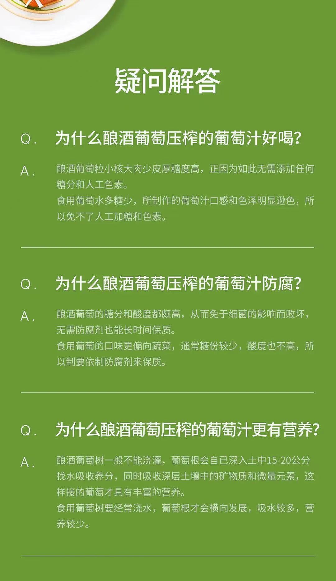 每一瓶葡萄汁约有500颗葡萄在跳跃。采用酿酒葡萄原汁压榨而成,精湛的生产工艺以及葡萄品种独有的特性造就本品自然防腐的作用。不含任何人工糖份、防腐剂和人工色素。葡萄汁香甜可口、果香充盈,酸甜适中,是古老工艺和现代科技的完美结合。