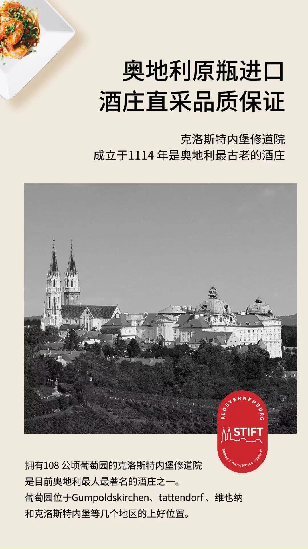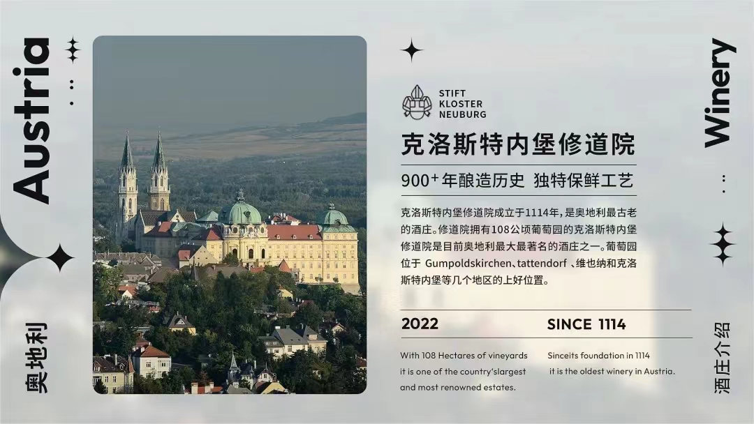 克洛斯特内堡修道院成立于1114年,是奥地利最古老的酒庄。修道院拥有108公顷葡萄园的克洛斯特内堡修道院是目前奥地利最大最著名的酒庄之一。葡萄园位于 Gumpoldskirchen、tattendorf 、维也纳和克洛斯特内堡等几个地区的上好位置。