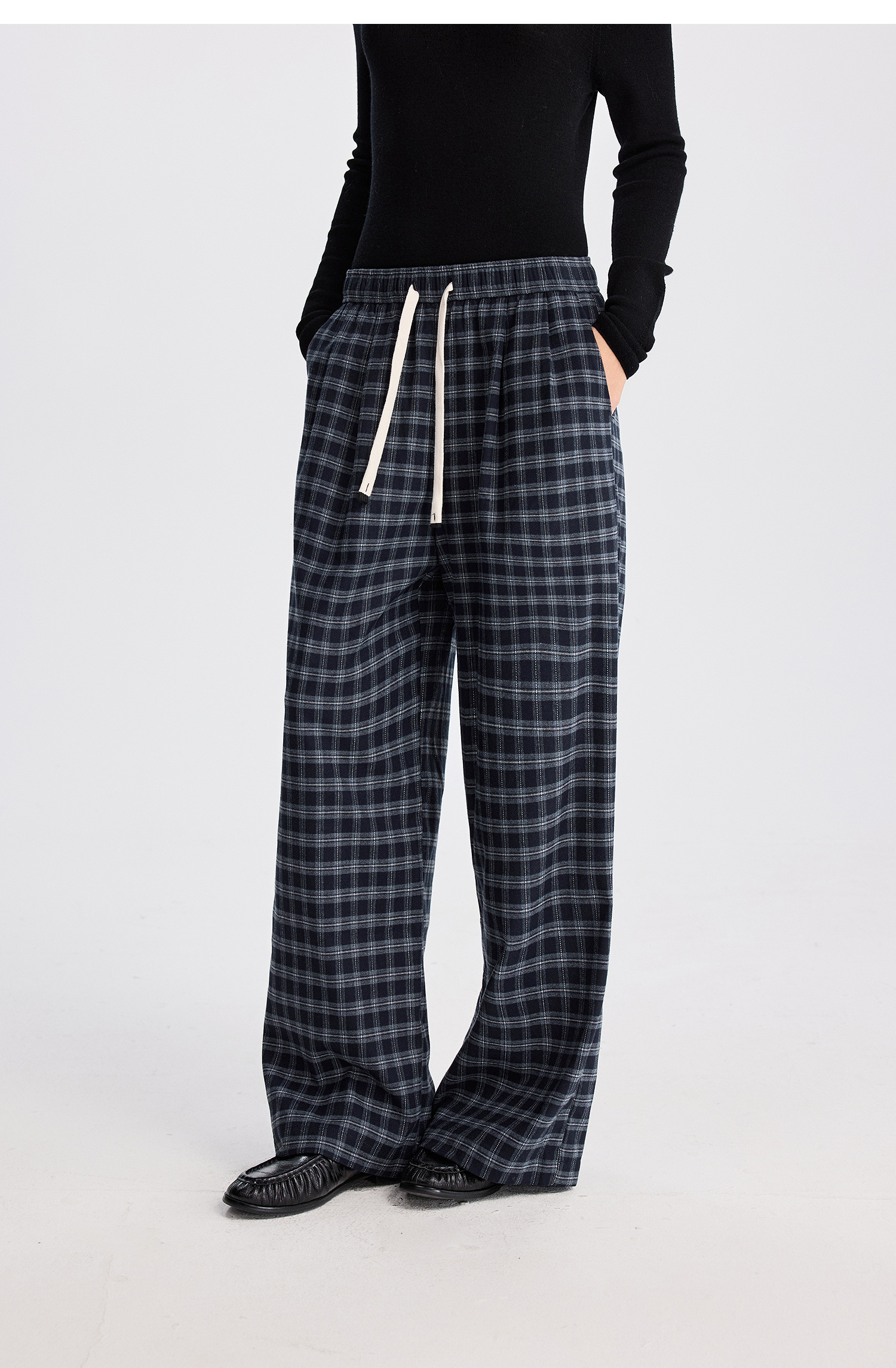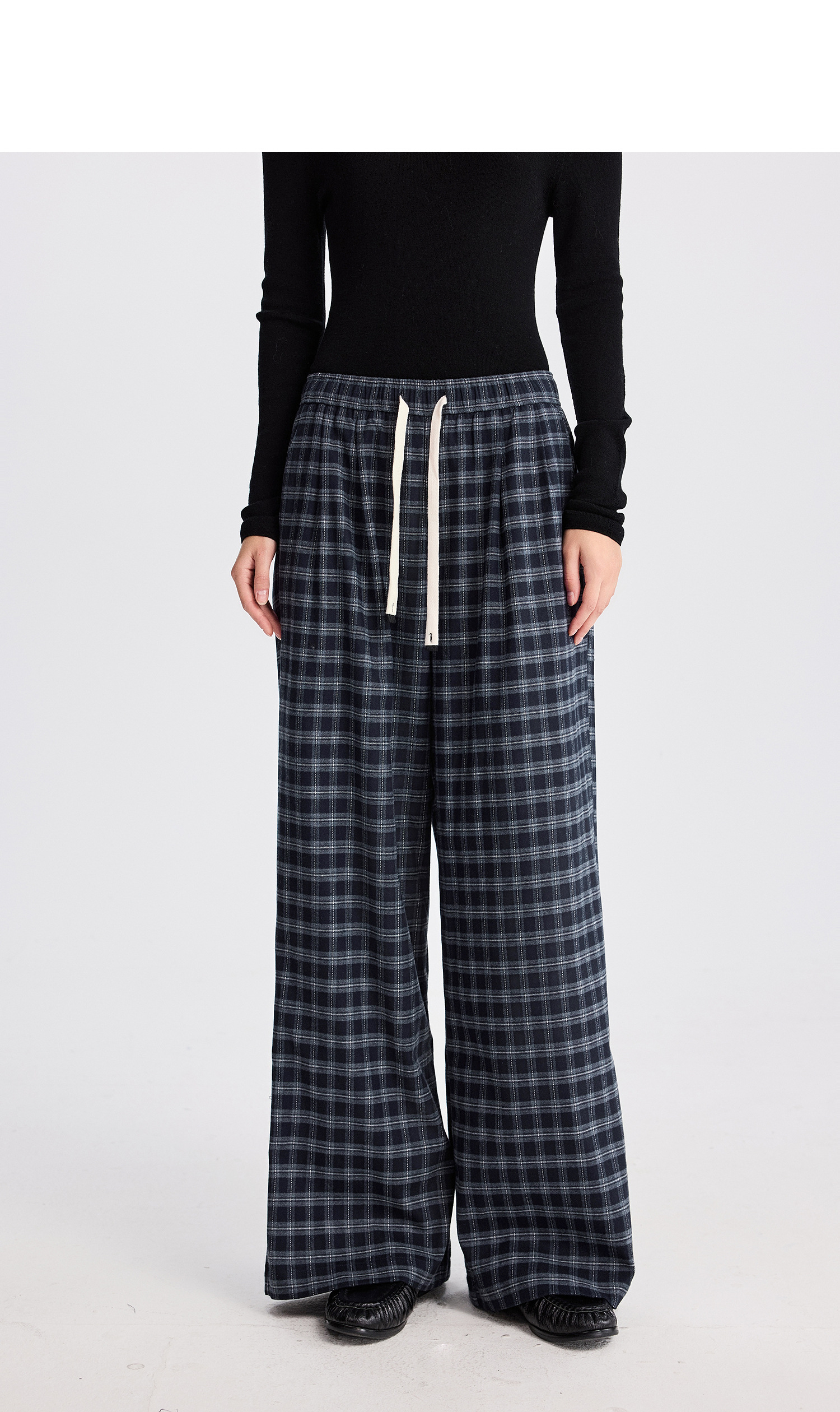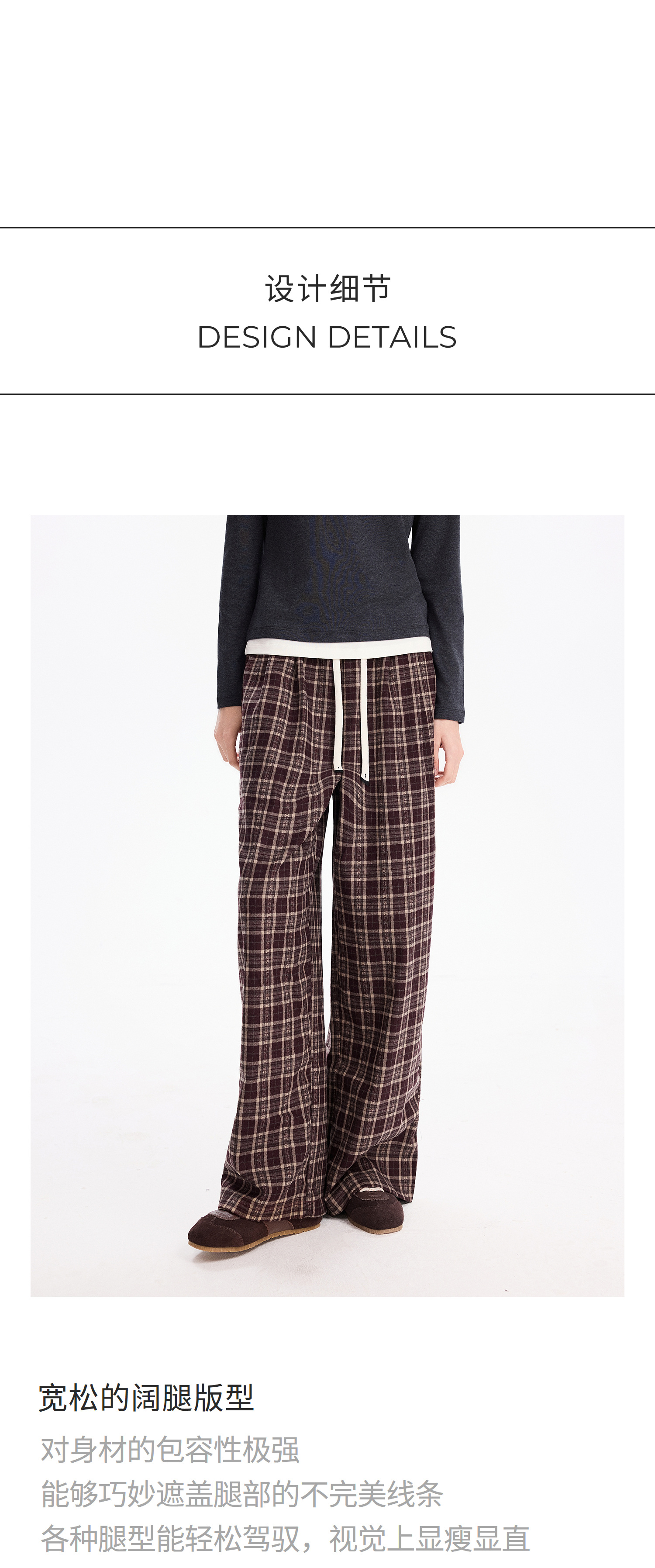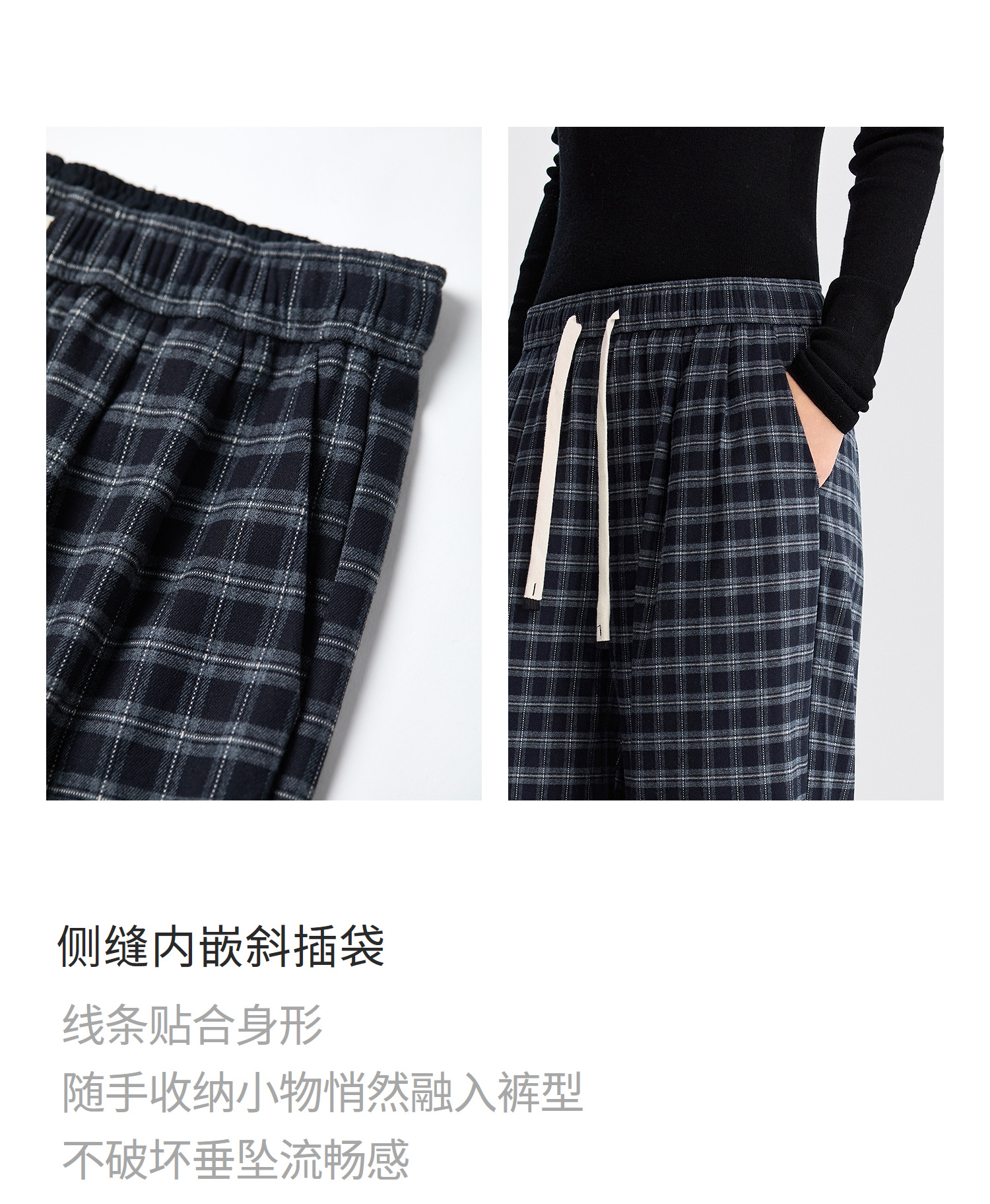 棉仓366618036-微磨毛感格子裤女松紧腰抽绳25秋冬微宽松直筒显瘦长裤阔腿裤