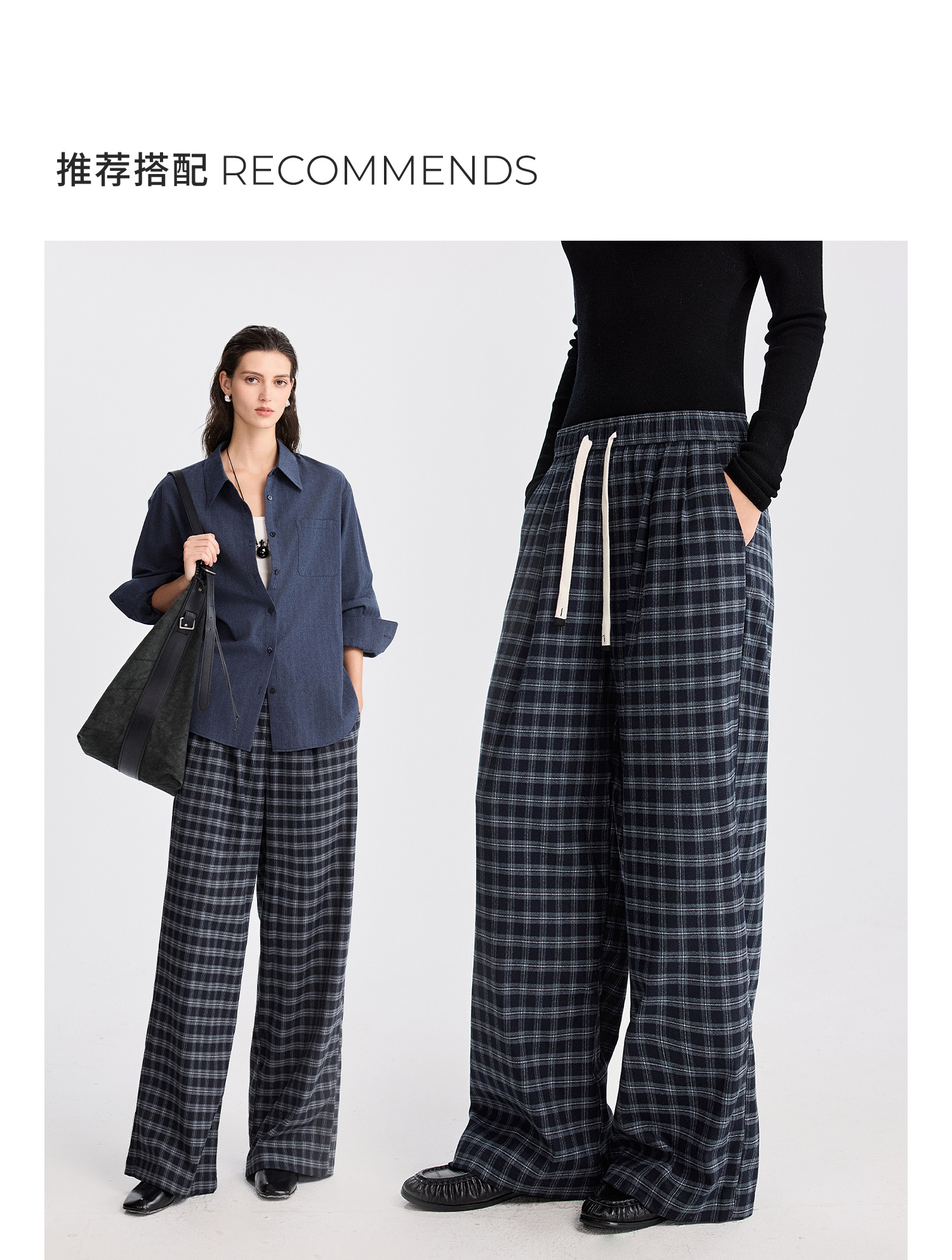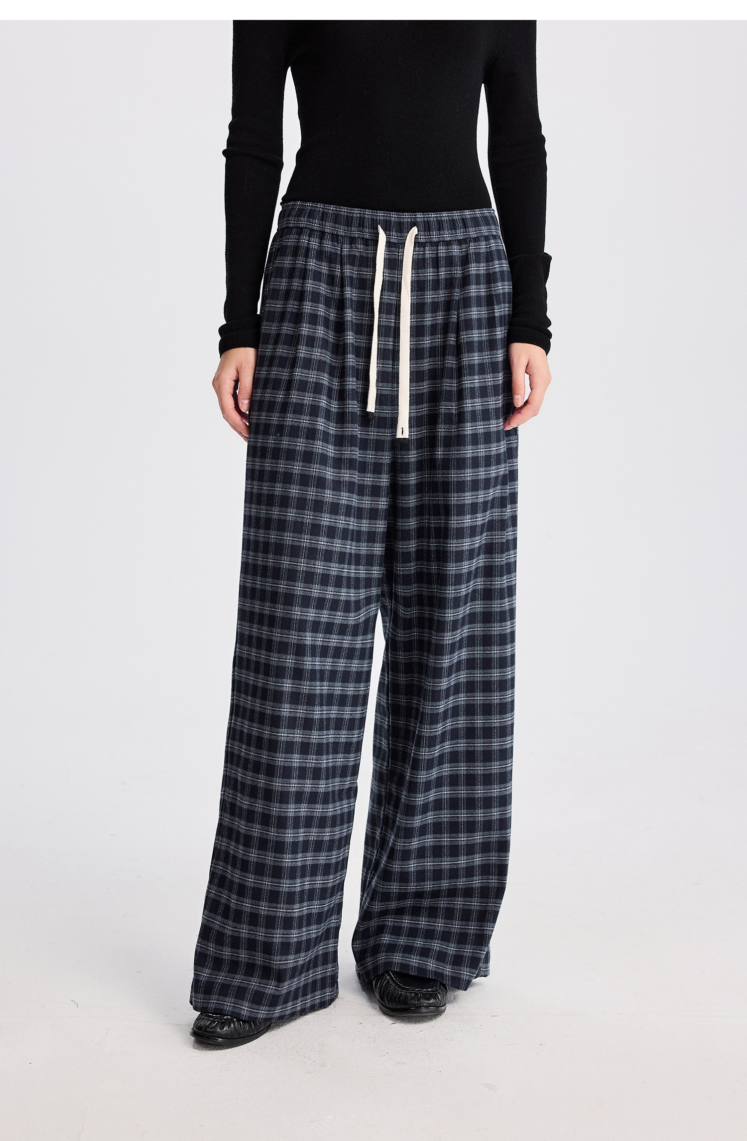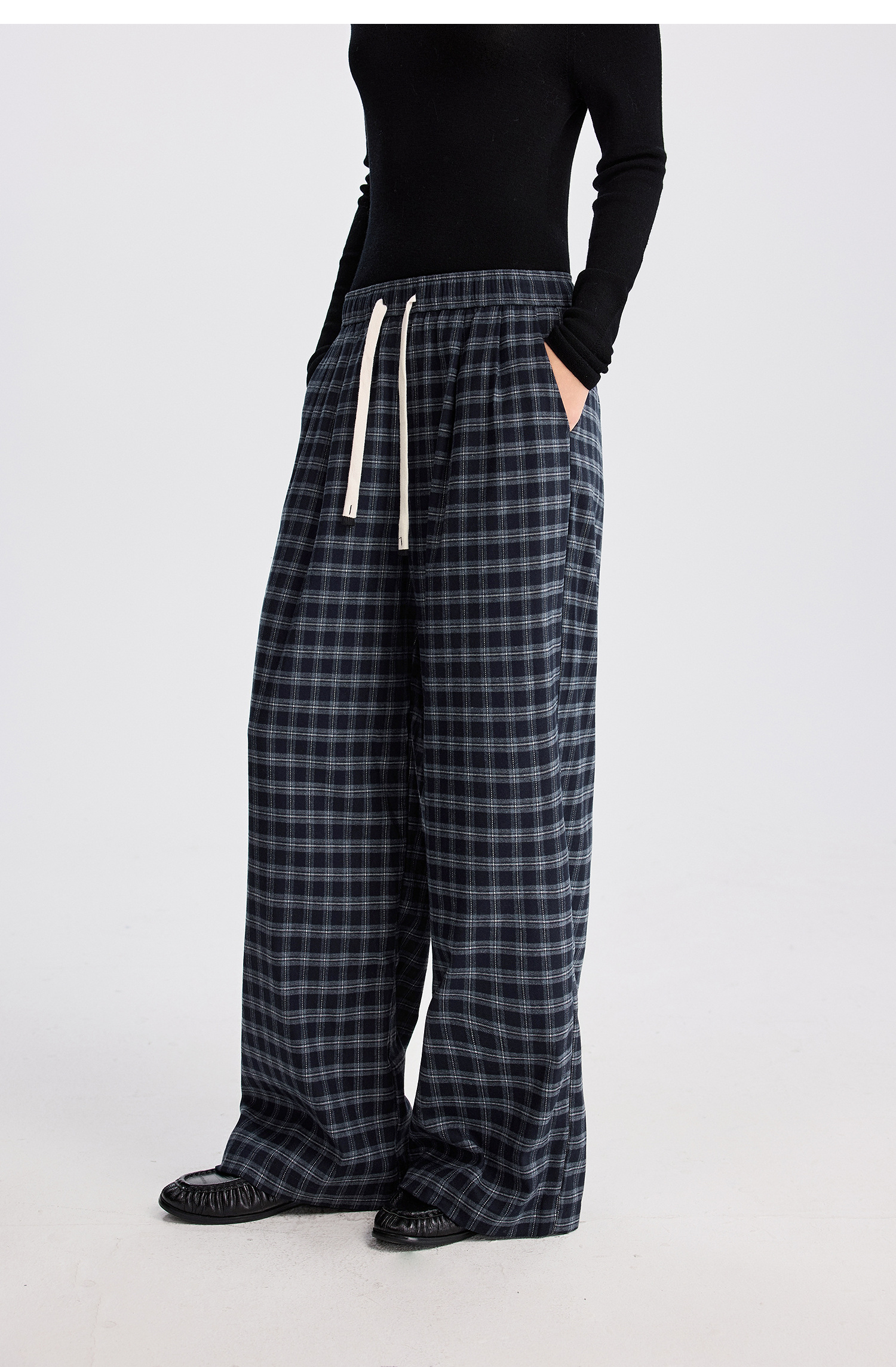 棉仓366618036-微磨毛感格子裤女松紧腰抽绳25秋冬微宽松直筒显瘦长裤阔腿裤