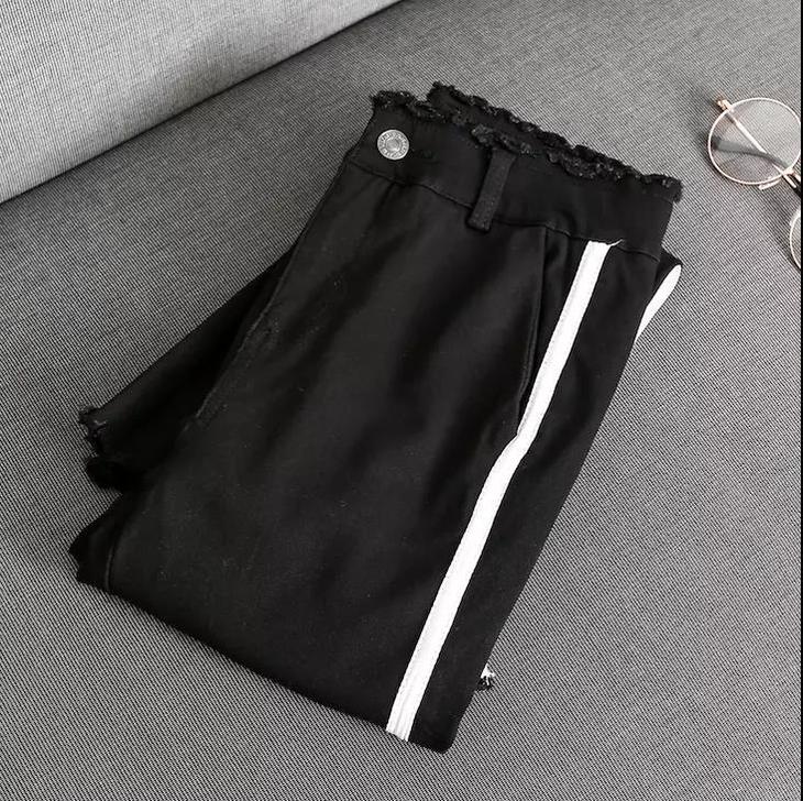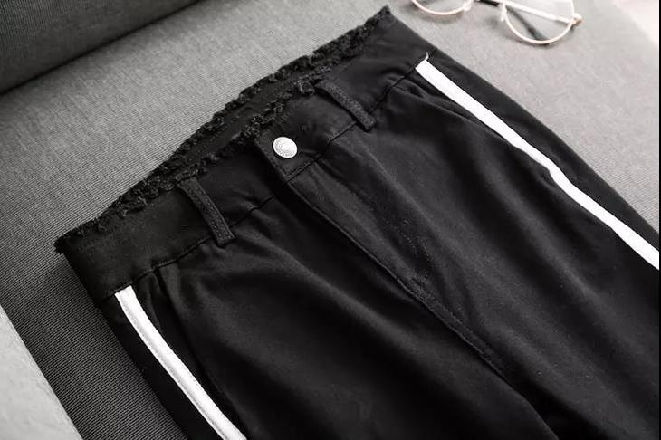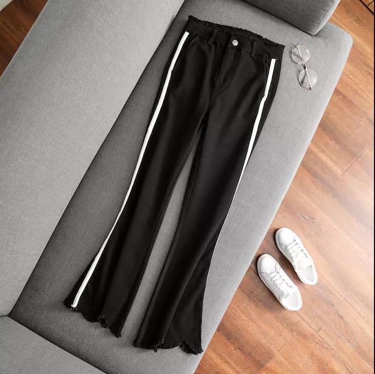 【服饰】高腰白色镶边修身显瘦不规则裤脚微喇叭牛仔裤女
