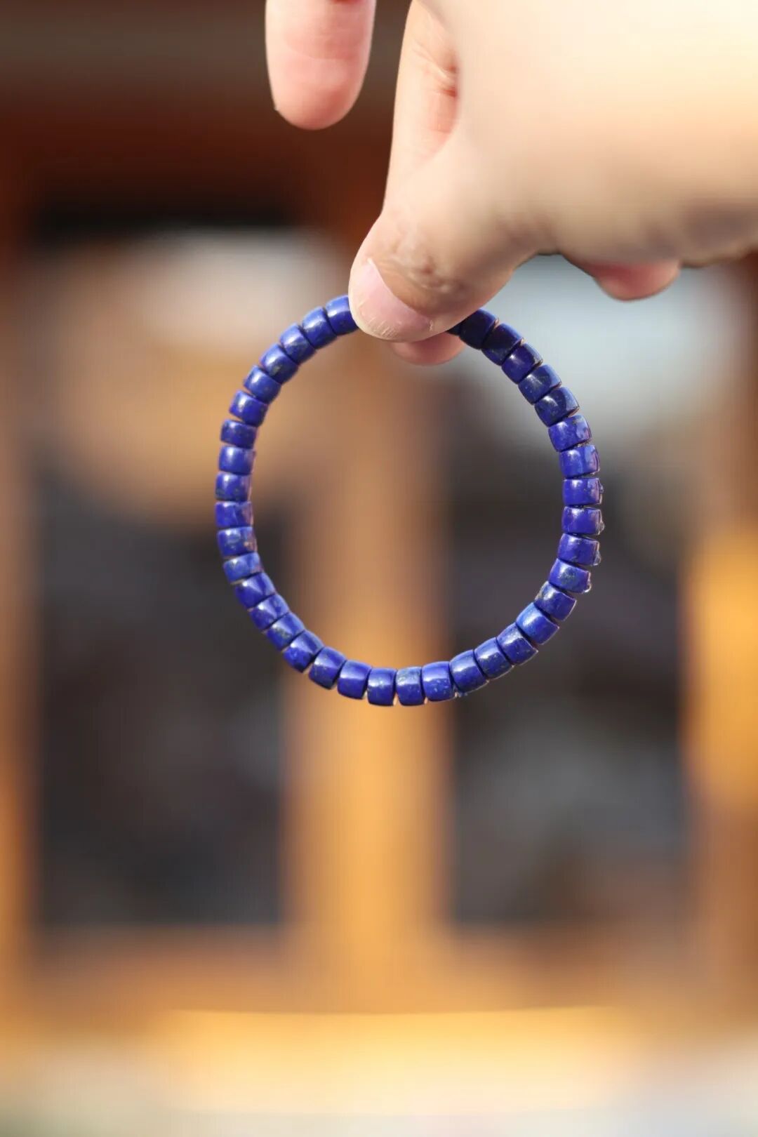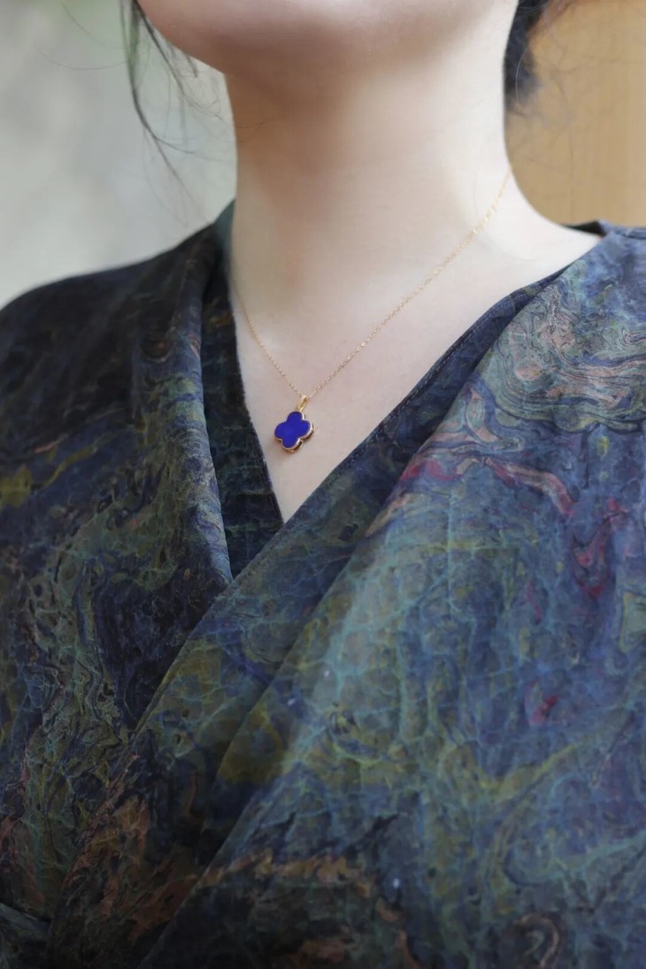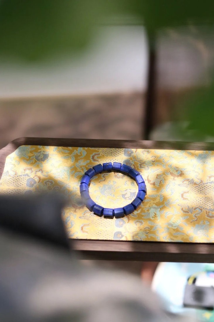 上好的青金石,介于宝蓝与紫蓝之间,黄铁矿均匀分布,似闪闪星光,如若细赏,仿佛夜空在眼前铺开,神秘、幽远,有着永恒的美。