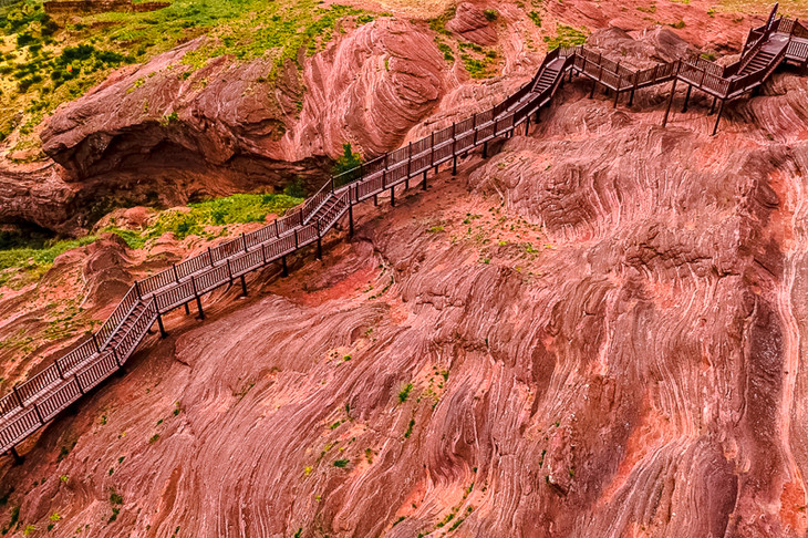- 早上继续出发,下午到达公格沟丹霞地貌,这里是一个神秘而小众的打卡地。我们可以沿着栈道一直往里面走,丹霞地貌就越来越明显,里面还有一条小溪,沿着小溪一路行走,就到了山谷里,在里面的感觉和外面是不一样的,由于在山谷深处,还有流水,所以让人感觉到神清气爽,有一种近距离亲近大自然的感觉!这里的丹霞地貌真的是很不一样,蜿蜒曲折的山势,一层层的红色岩石纹理清晰。丹霞形态多样、色彩丰富的奇特地貌,错落交替的石头层层叠叠、有序排列,以红色为主色,还有淡红、紫红等颜色,在碧水蓝天的映衬下,如诗如画,如同把彩虹踩在脚下一样,令人不得不感叹大自然的鬼斧神工!
