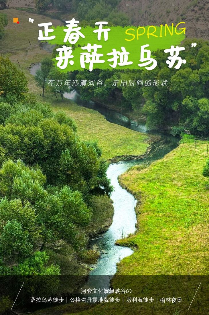 - 早餐后,前往萨拉乌苏峡谷徒步起点,走沙漠穿峡谷,跋山涉水,一步一景。行走尚未人知的峡谷秘境,感受毛乌素沙漠腹地的璀璨妙景。萨拉乌苏是7万年前的古人类河套人居住地、是无定河的发源地、是西夏王国存世的都城遗址、是沉睡了万年的中国版科罗拉多大峡谷,是中国内陆尚未人知的峡谷秘境。全程约14公里,爬升约280米。我们走的是萨拉乌苏峡谷的精华路段,大峡谷里徒步,偶尔穿插在两边的沙漠里,沙漠峡谷初体验,难度适中,峡谷上方是沙漠,峡谷下方是蜿蜒河流,行走一步一景的河流两岸,感受塞上奇景,品味大自然的鬼斧神工。
