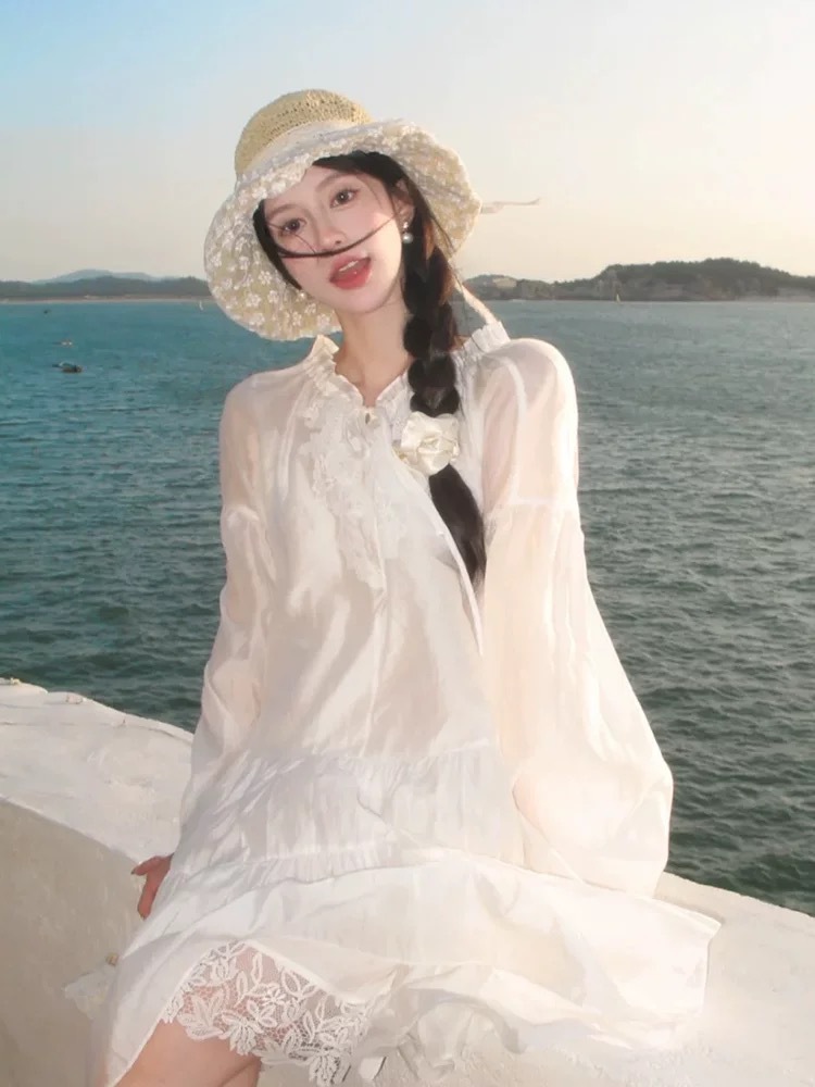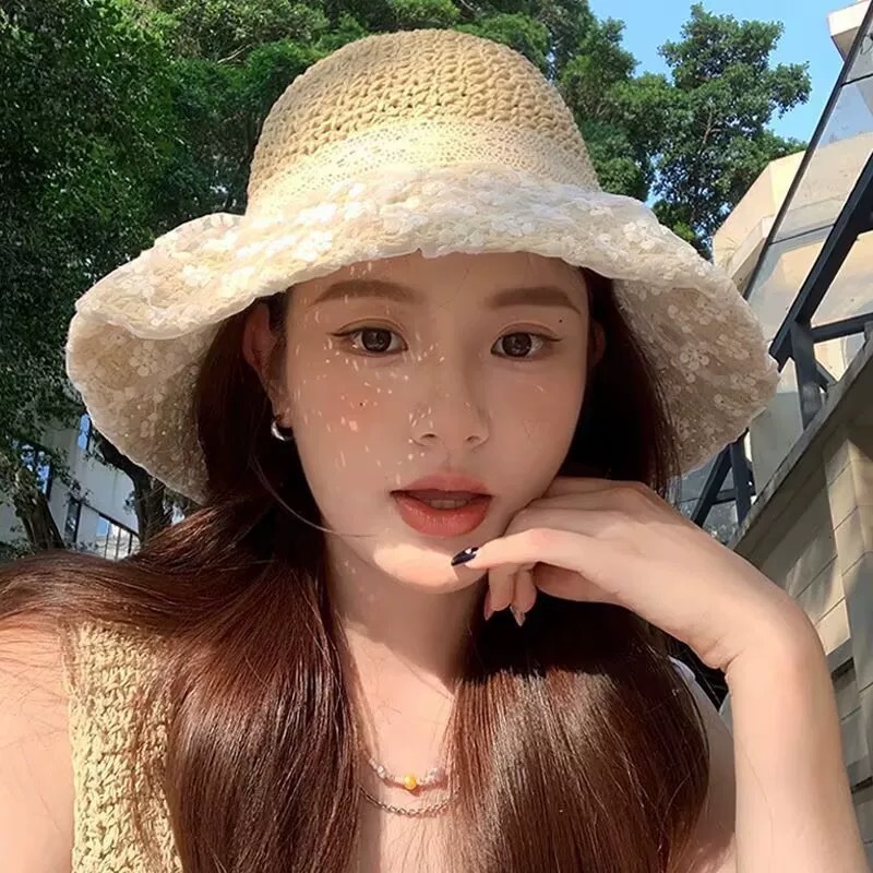 蕾丝花朵大草帽海边沙滩女士渔夫帽防晒防紫外线遮阳系带新款夏季