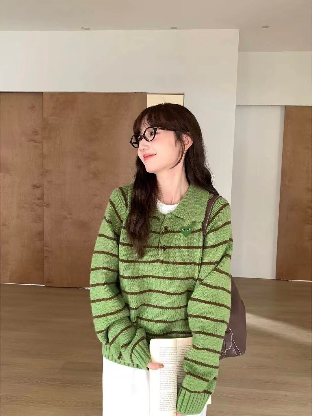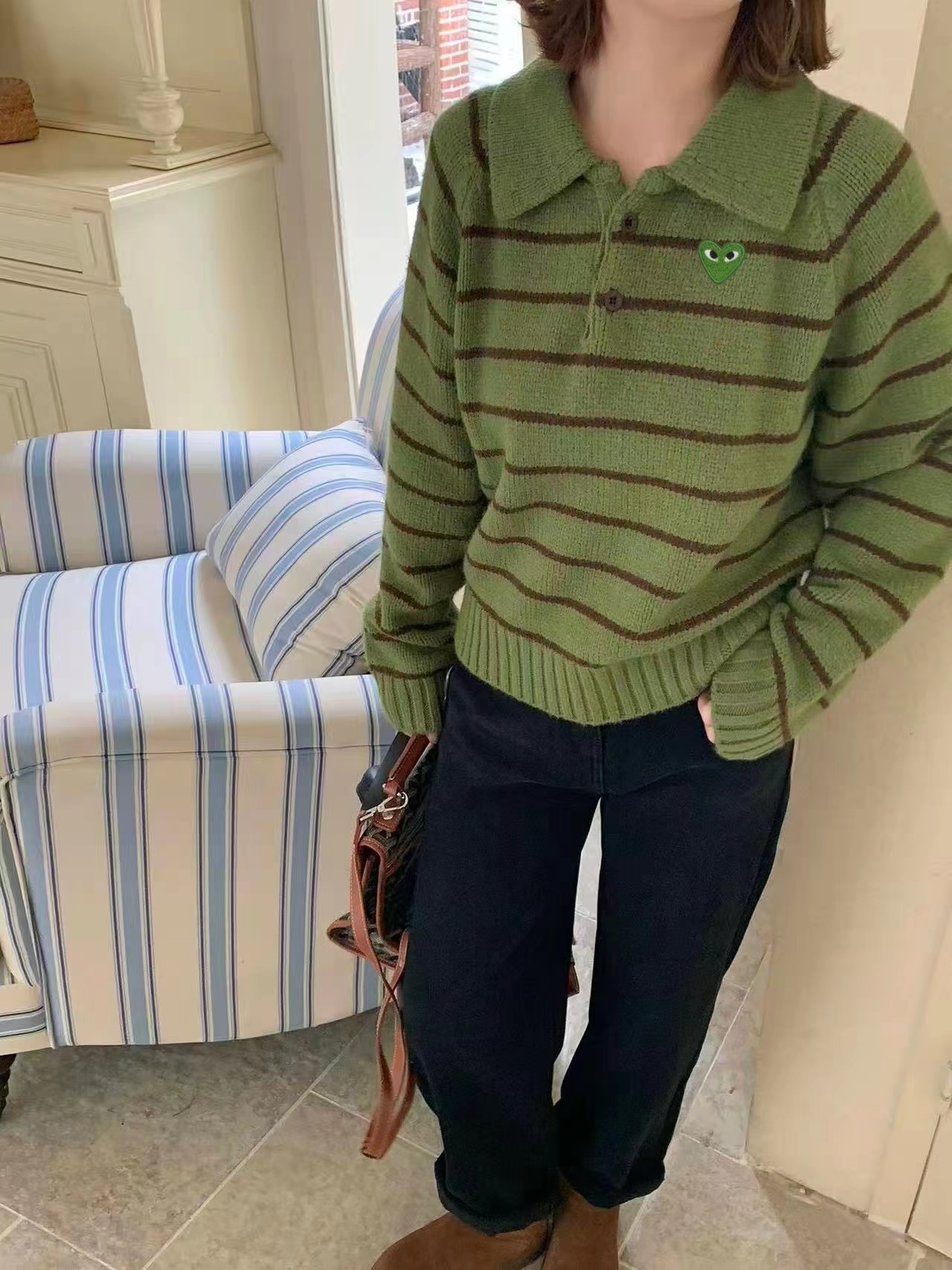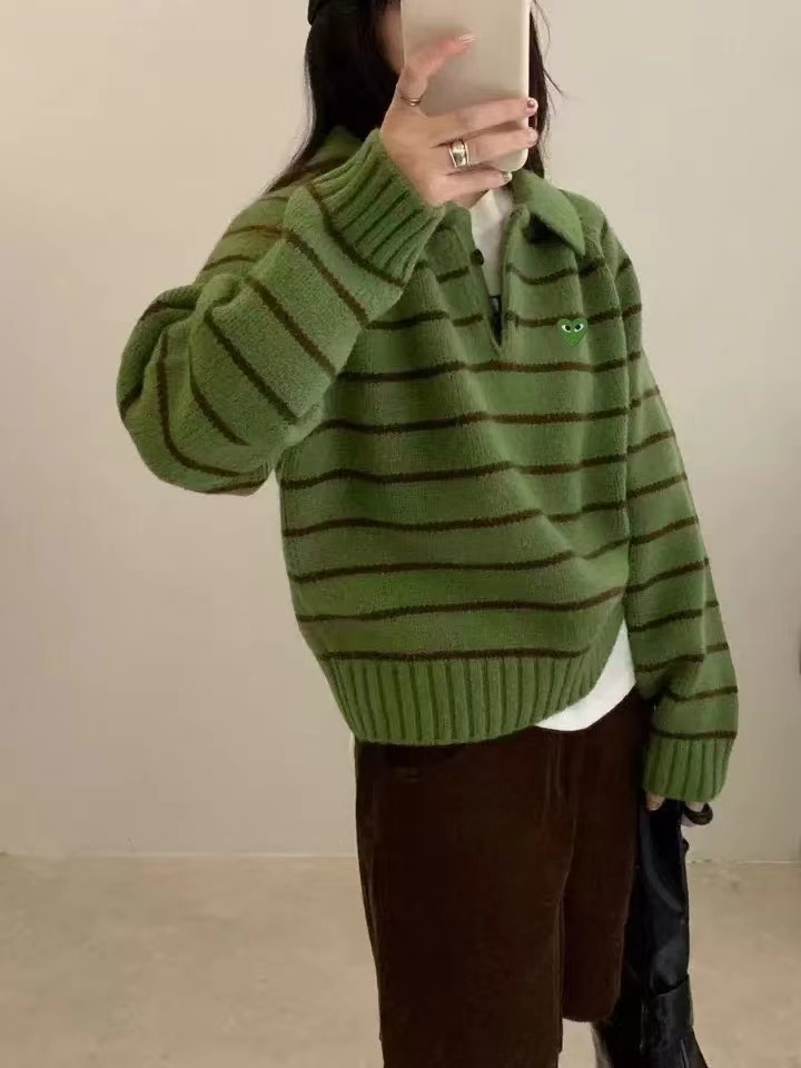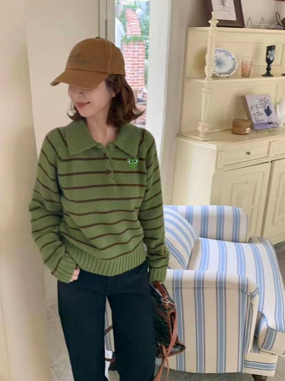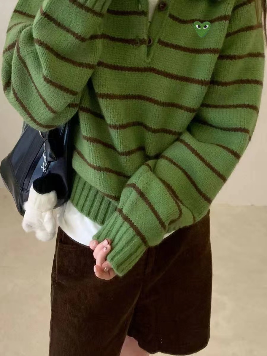 绿色+棕色条纹的针织Polo衫,整体风格是元气又可爱的韩系休闲感。版型是宽松微短款,上身会有点“oversize但不压个子”的效果,刚好能把腰线稍微提一点,搭配下装很显比例;设计是Polo领+半开襟小纽扣,带点复古运动风的调调,加上绿色底+深棕细条纹的配色,清新又有秋冬的温暖感;细节上有一个小绿心刺绣,和衣服主色呼应,增加了软乎乎的可爱感,面料是柔软的针织材质,看起来很亲肤;搭配上配了黑色垂感长裙,再加上棕色棒球帽,整体是活泼又不失温柔的日常穿搭,很适合通勤或者zhou末出门。