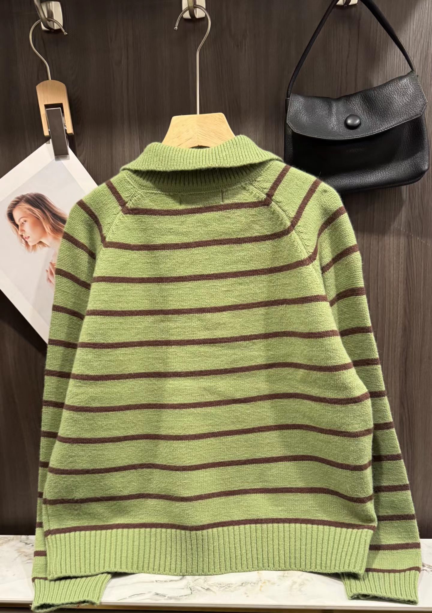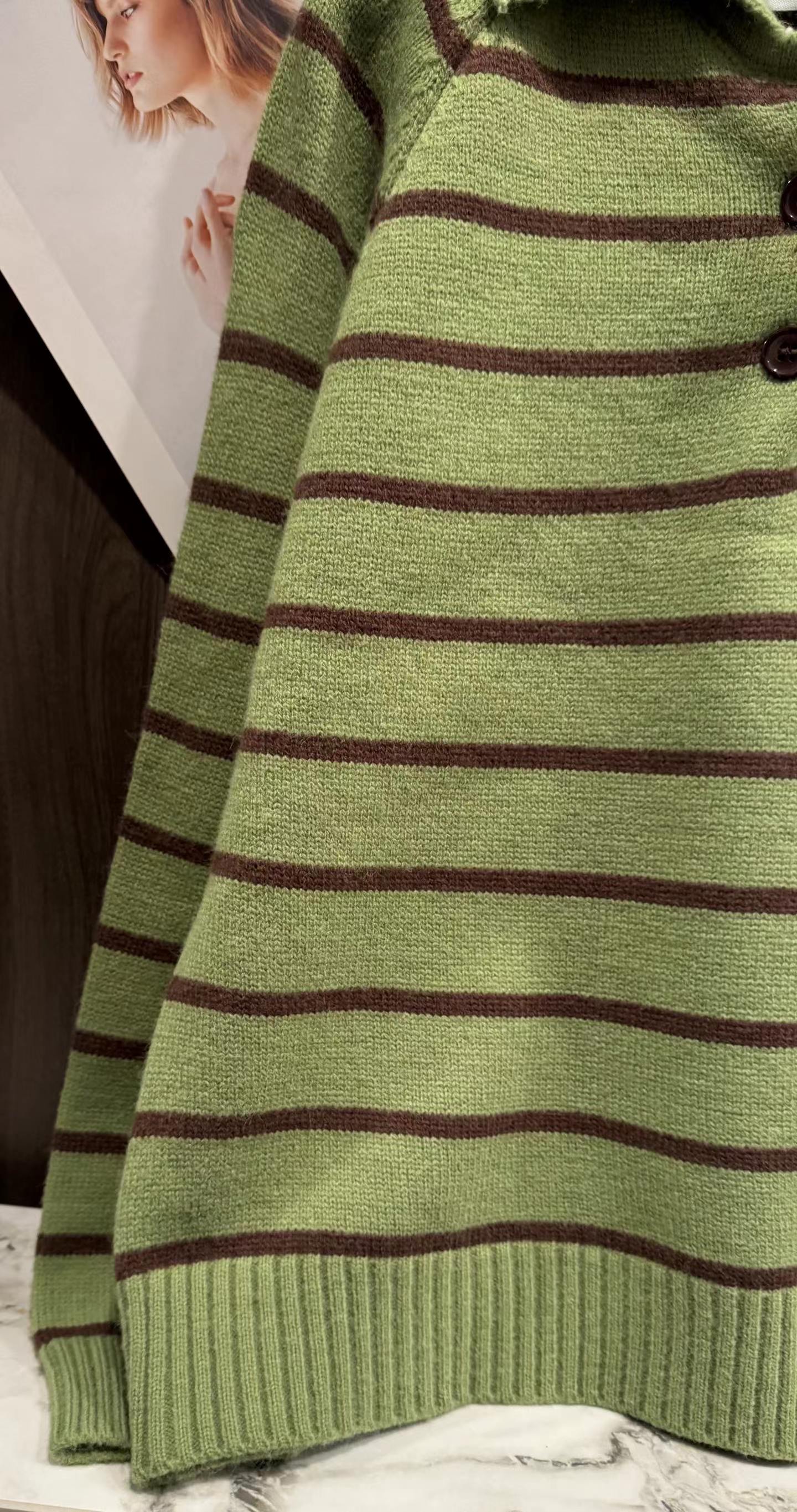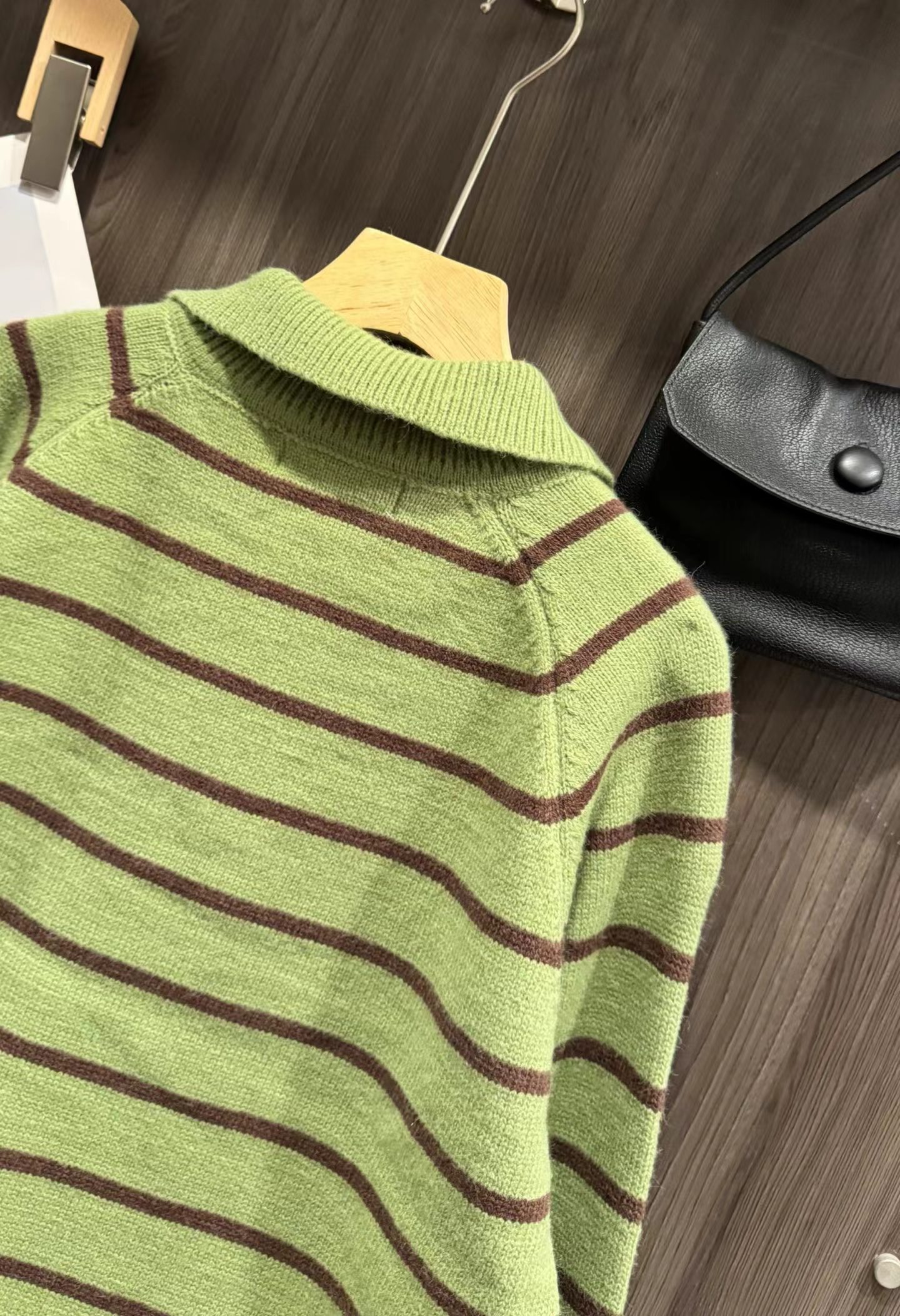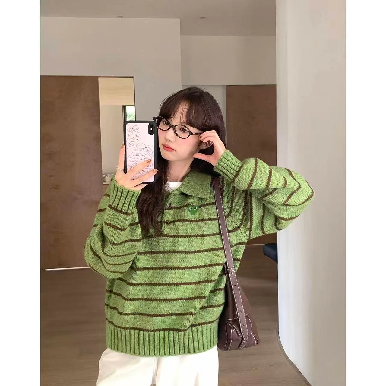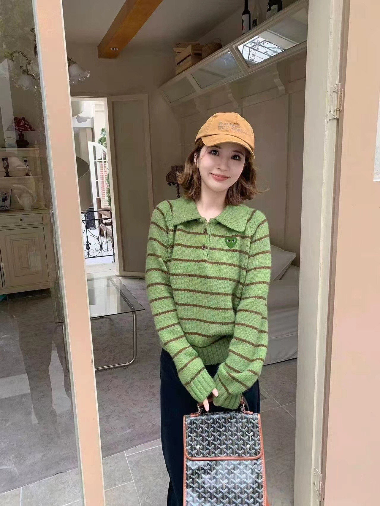 绿色+棕色条纹的针织Polo衫,整体风格是元气又可爱的韩系休闲感。版型是宽松微短款,上身会有点“oversize但不压个子”的效果,刚好能把腰线稍微提一点,搭配下装很显比例;设计是Polo领+半开襟小纽扣,带点复古运动风的调调,加上绿色底+深棕细条纹的配色,清新又有秋冬的温暖感;细节上有一个小绿心刺绣,和衣服主色呼应,增加了软乎乎的可爱感,面料是柔软的针织材质,看起来很亲肤;搭配上配了黑色垂感长裙,再加上棕色棒球帽,整体是活泼又不失温柔的日常穿搭,很适合通勤或者zhou末出门。