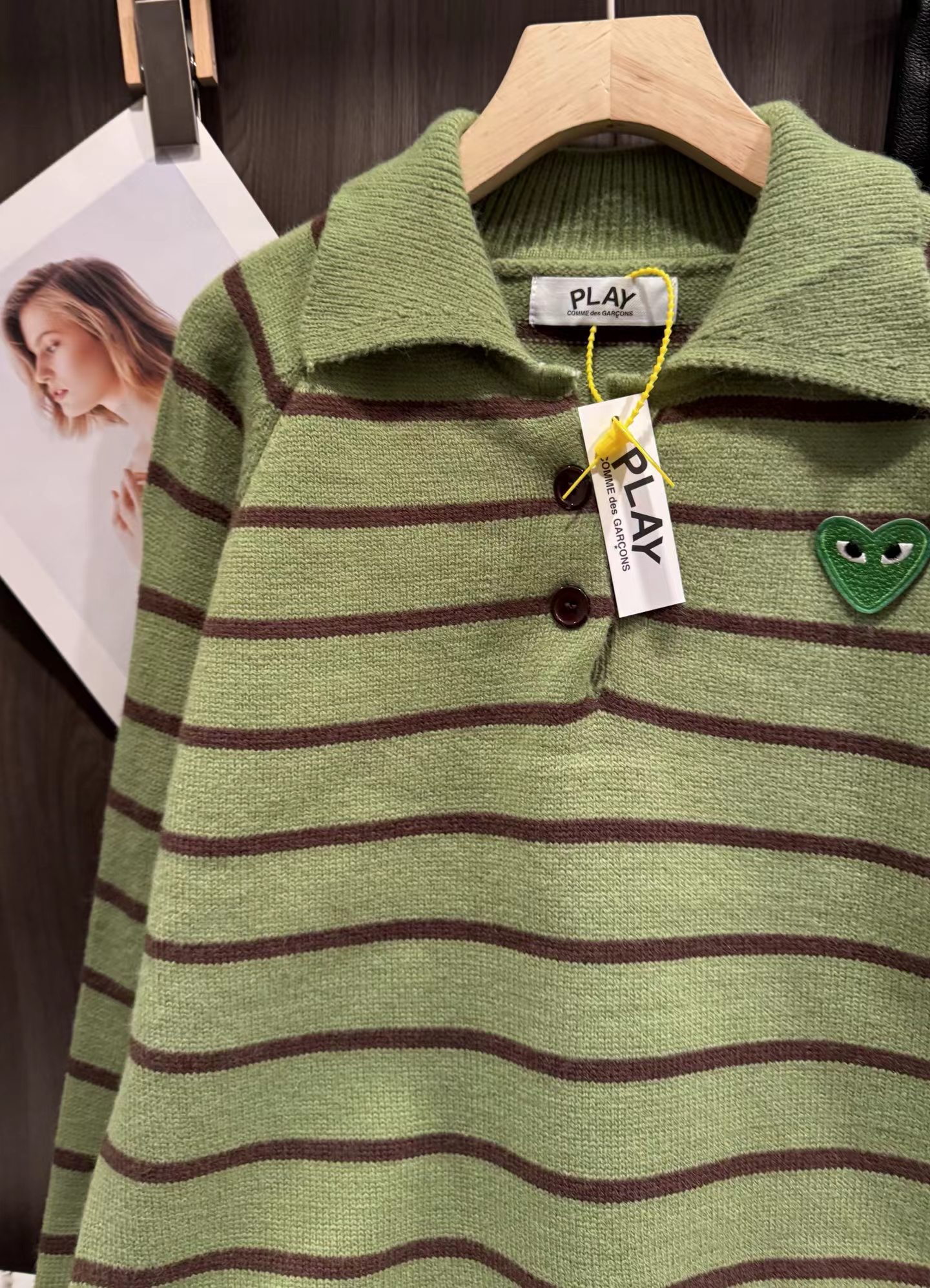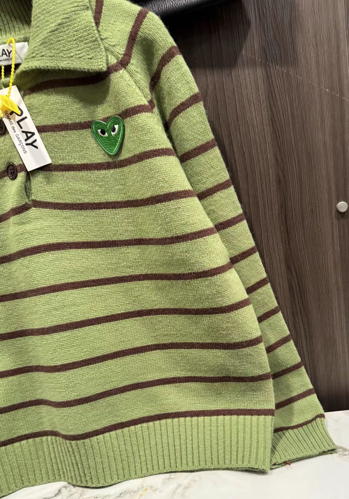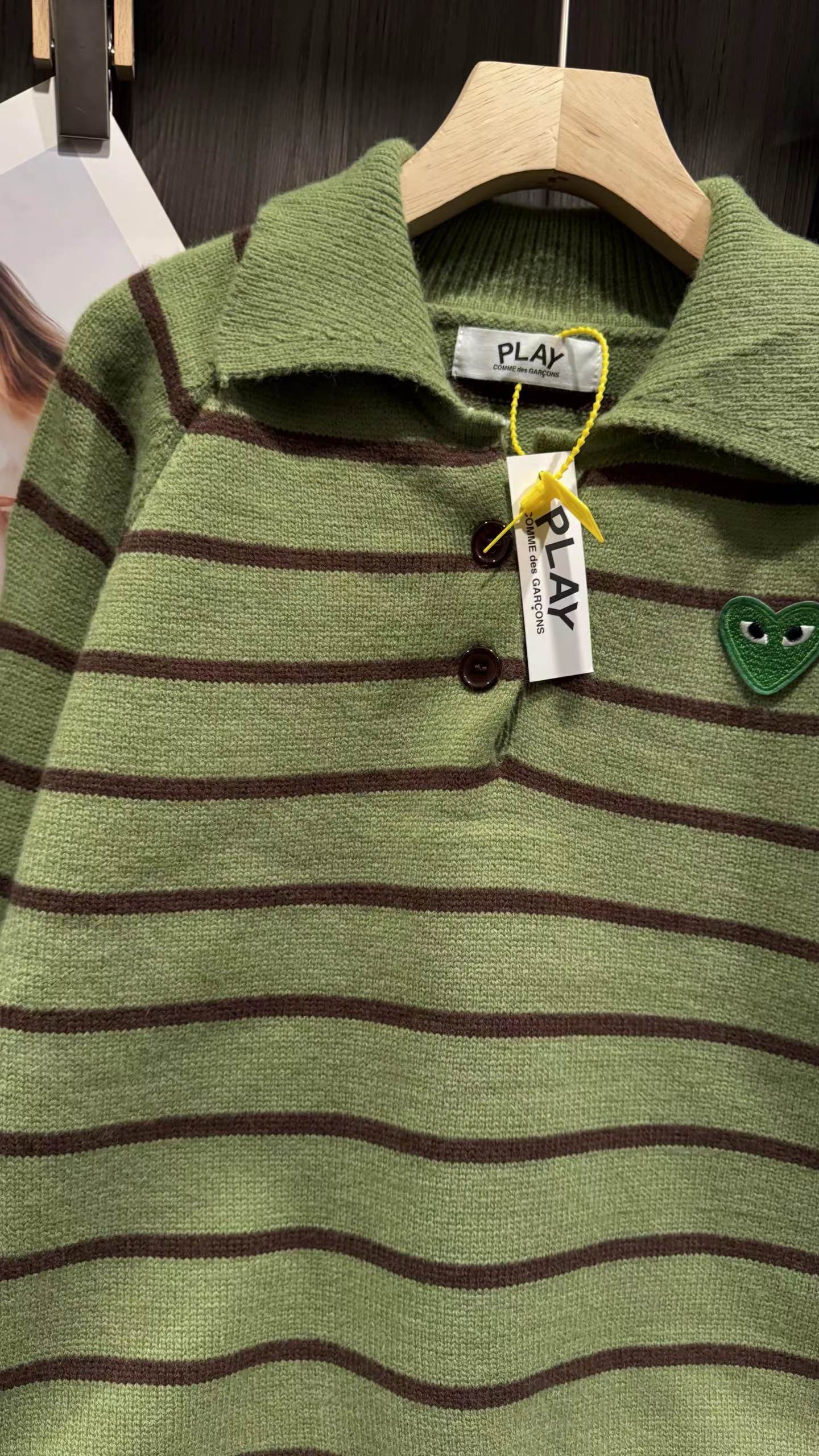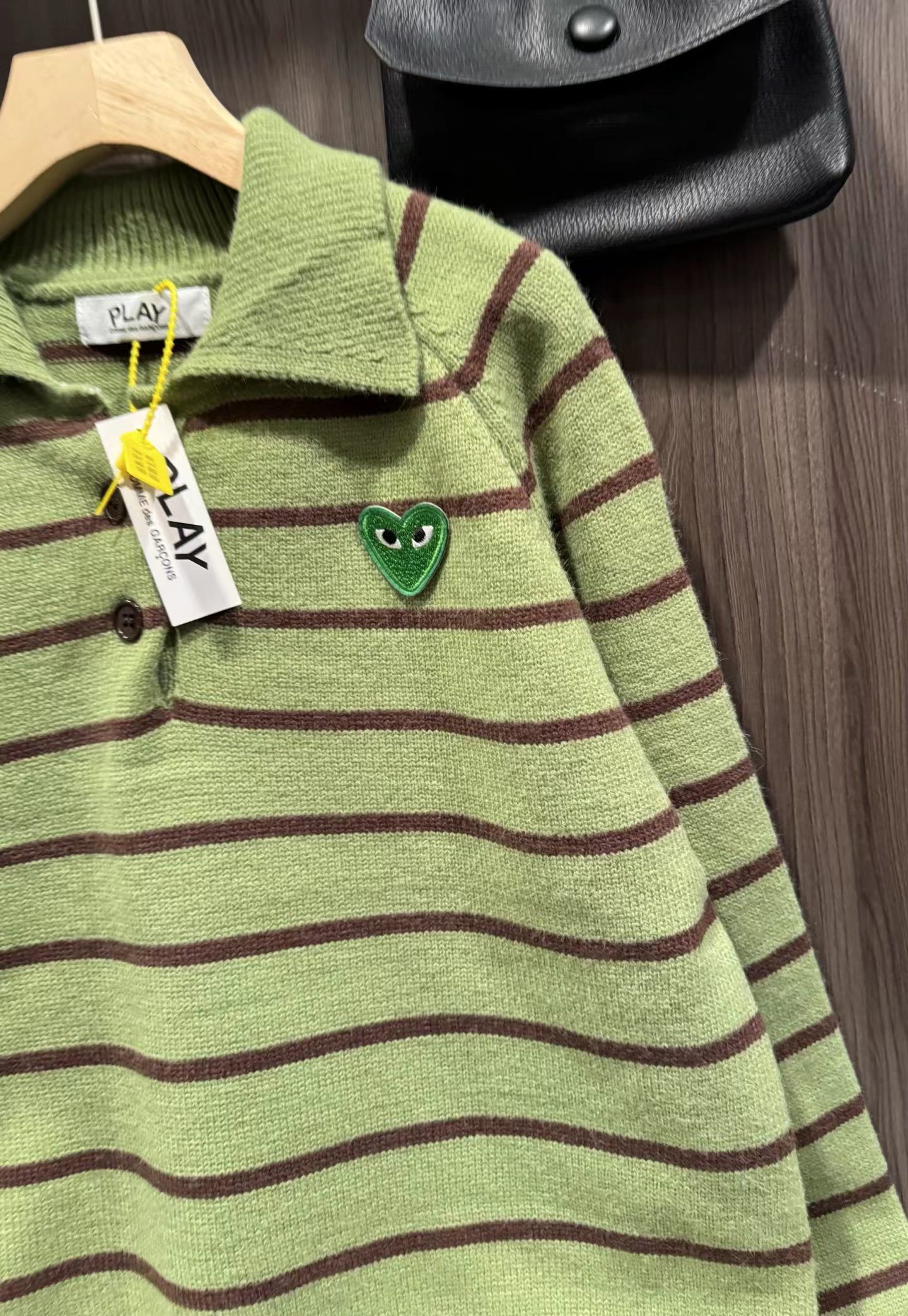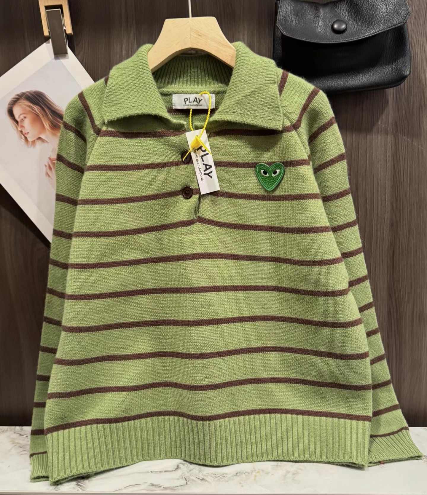 绿色+棕色条纹的针织Polo衫,整体风格是元气又可爱的韩系休闲感。版型是宽松微短款,上身会有点“oversize但不压个子”的效果,刚好能把腰线稍微提一点,搭配下装很显比例;设计是Polo领+半开襟小纽扣,带点复古运动风的调调,加上绿色底+深棕细条纹的配色,清新又有秋冬的温暖感;细节上有一个小绿心刺绣,和衣服主色呼应,增加了软乎乎的可爱感,面料是柔软的针织材质,看起来很亲肤;搭配上配了黑色垂感长裙,再加上棕色棒球帽,整体是活泼又不失温柔的日常穿搭,很适合通勤或者zhou末出门。