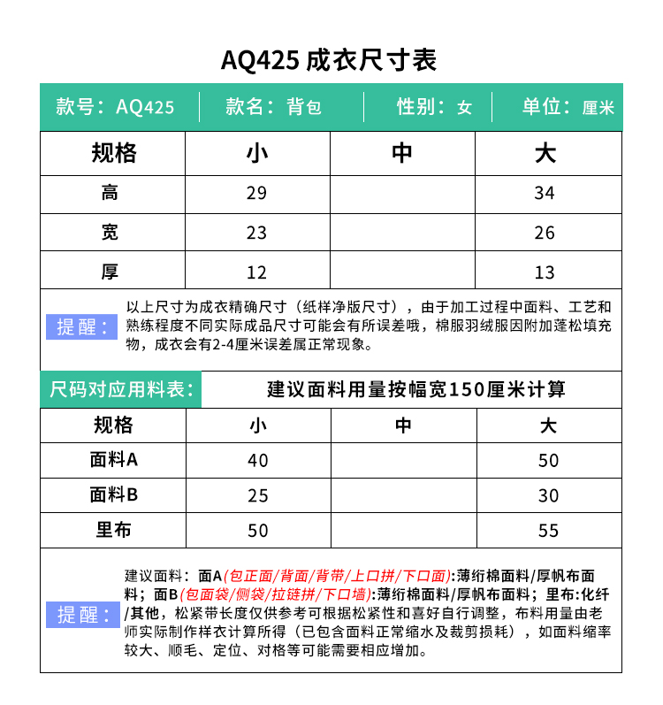 裁缝学苑AQ425幼儿园书包男女宝宝双肩包纸样撞色儿童背包样板