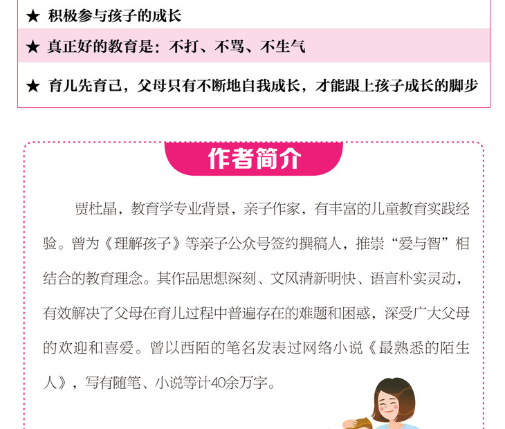 教育学专业背景,亲子作家,有丰富的儿童教育实践经验。曾为《理解孩子》等亲子公众号签约撰稿人,推崇“爱与智”相结合的教育理念。其作品思想深刻、文风清新明快、语言朴实灵动,有效解决了父母在育儿过程中普遍存在的难题和困惑,深受广大父母的欢迎和喜爱。曾以西陌的笔名发表过网络小说《最熟悉的陌生人》,写有随笔、小说等计40余万字。
