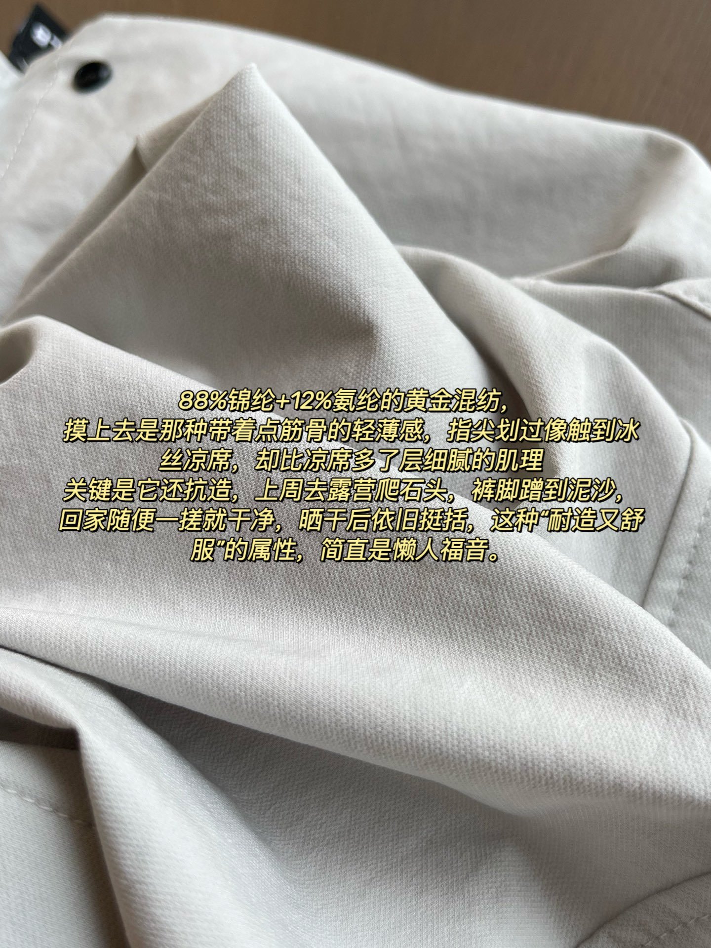摸上去是那种带着点筋骨的轻薄感,指尖划过像触到冰丝凉席,关键是它还抗造,露营爬石头,裤脚蹭到泥沙,回家随便一搓就干净,晒干后依旧挺括,这种“耐造又舒服”的属性,简直是懒人福音。