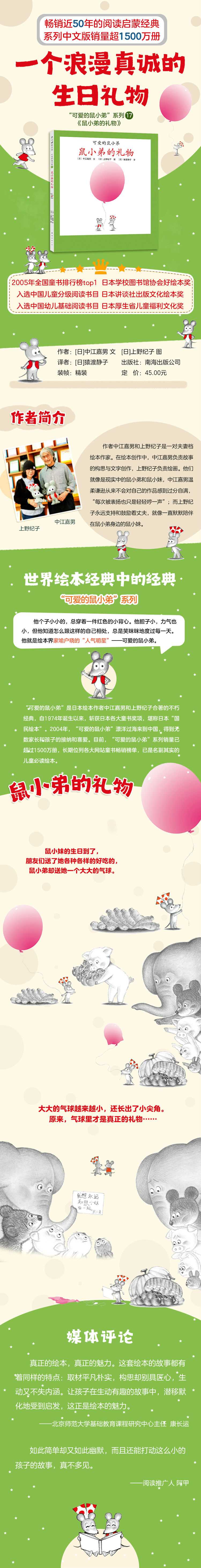 2004年,“可爱的鼠小弟”漂洋过海来到中国,被无数家长和孩子同时接纳和喜爱,2005年评为全国童书排行榜****,获得包括《人民日报》在内的诸多主流媒体、专业阅读推广机构的认可和推荐,入选中国儿童分级阅读书目、中国幼儿基础阅读书目等。目前,“可爱的鼠小弟”销量已超过1500万册,长期位列各大网站童书榜单,已是名副其实的儿童必读绘本。