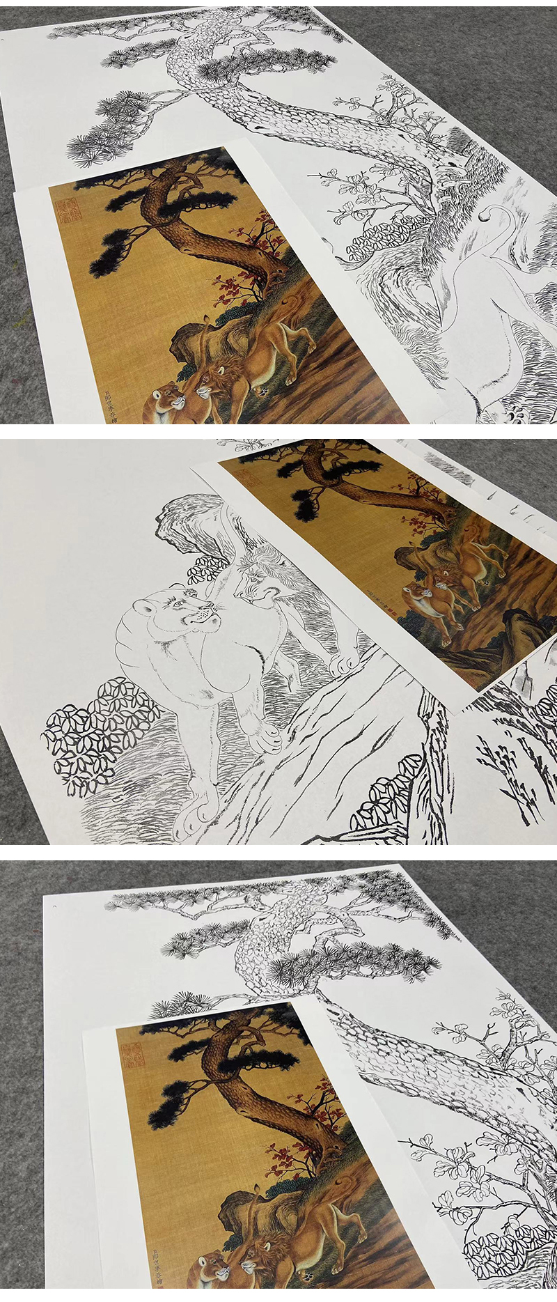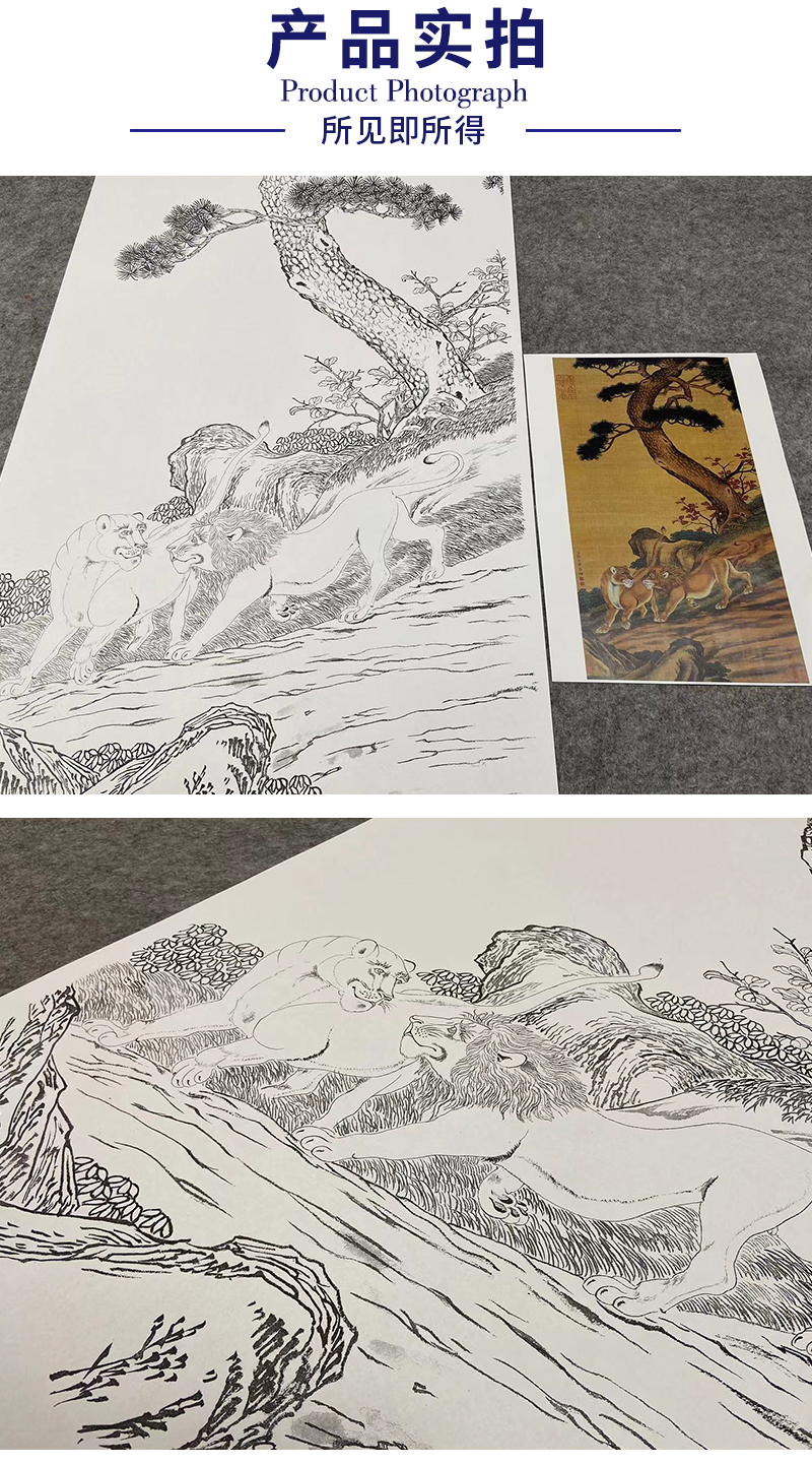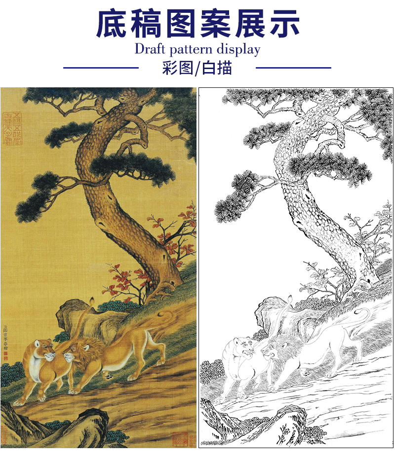 【大彩图】郎世宁工笔画白描底稿《双狮图》狮子临摹勾线高清打印稿LS15