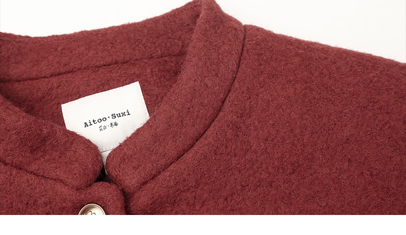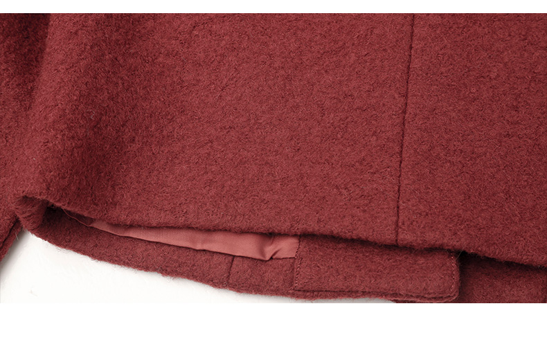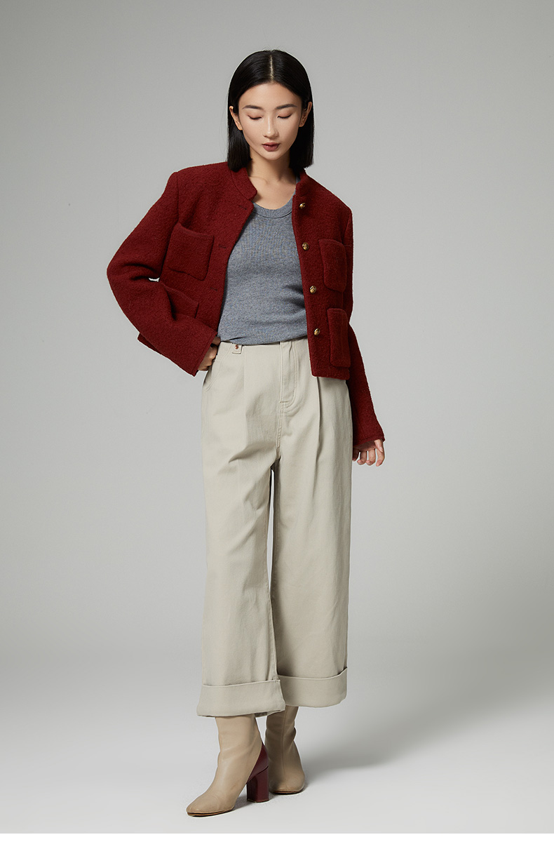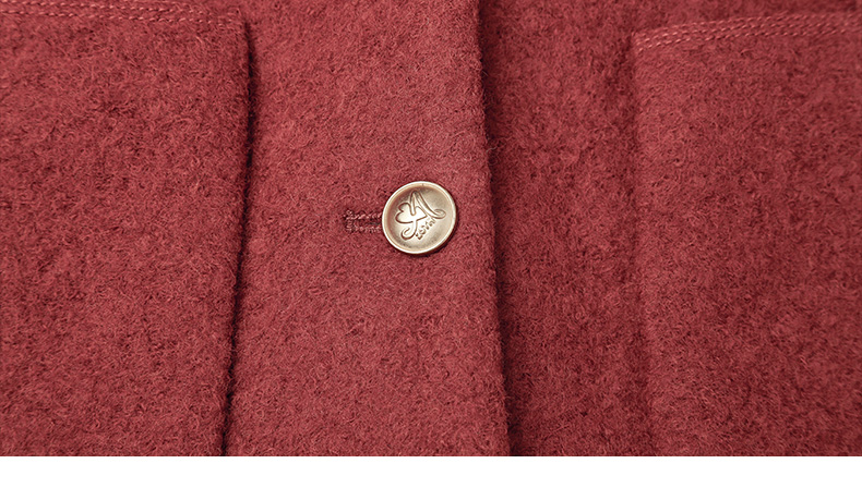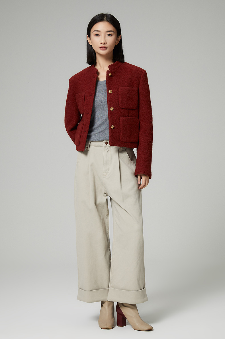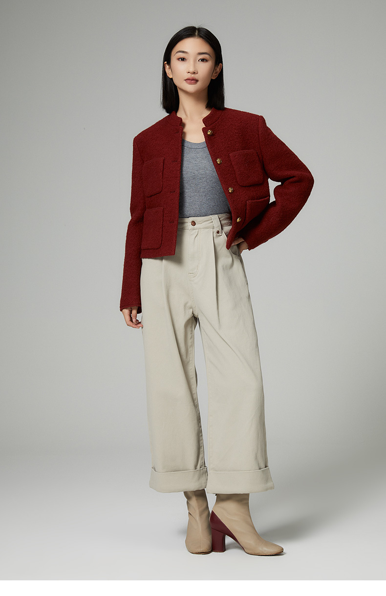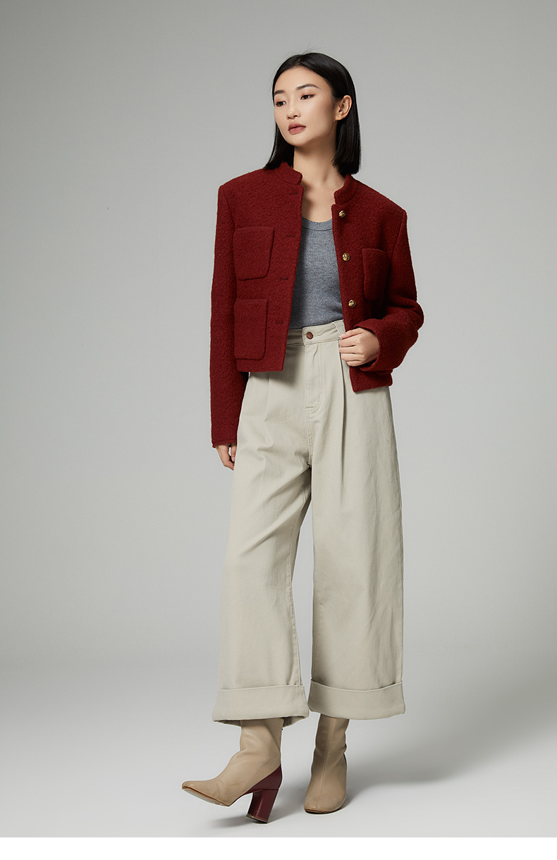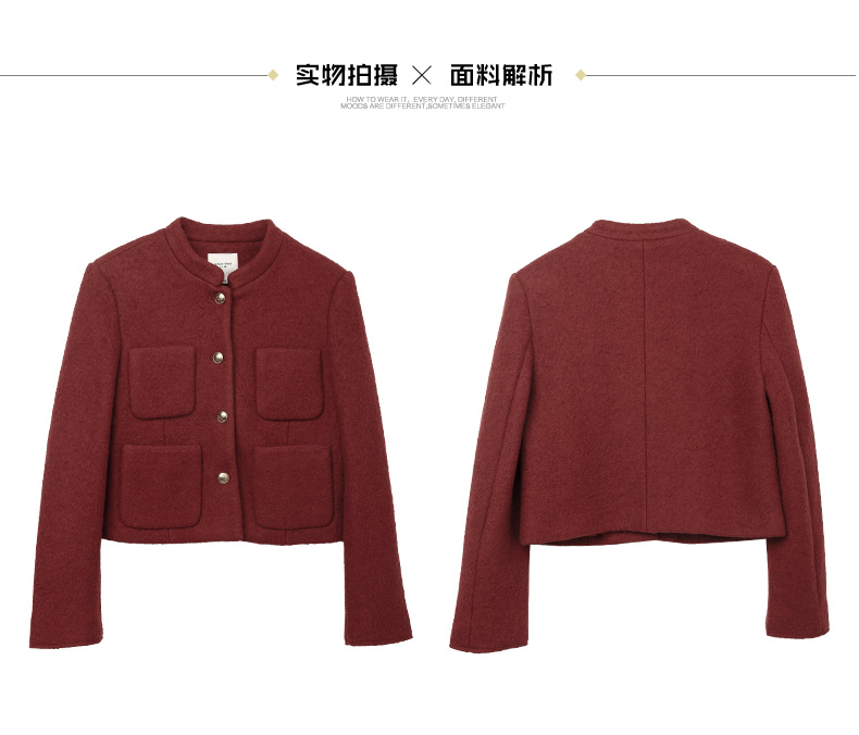 酒红色立领多口袋毛呢短外套 复古风单排扣显瘦上衣 秋冬质感百搭女式夹克