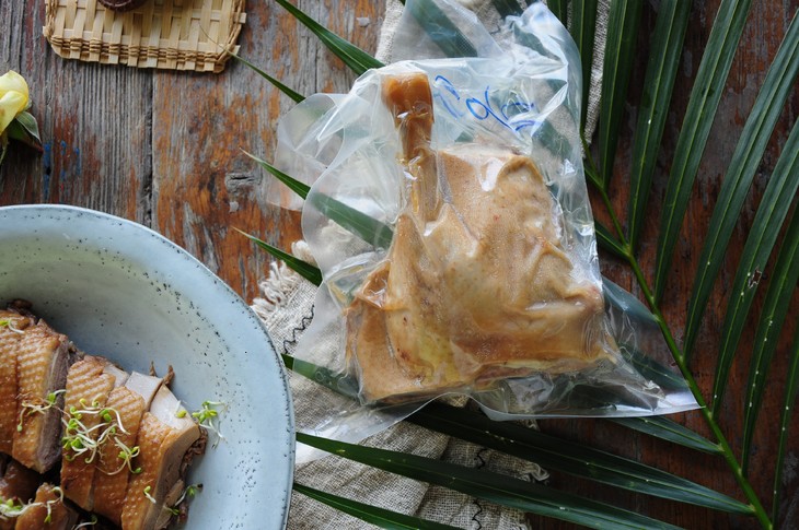 农场生态养殖130天以上的鸭,经过人工去毛处理后,在方野的老卤汤里低温浸泡40分钟左右即可。没有很浓烈的大料的味道,更多保留了鸭子的原味,一口下去满嘴都是鸭肉的鲜嫩多汁。