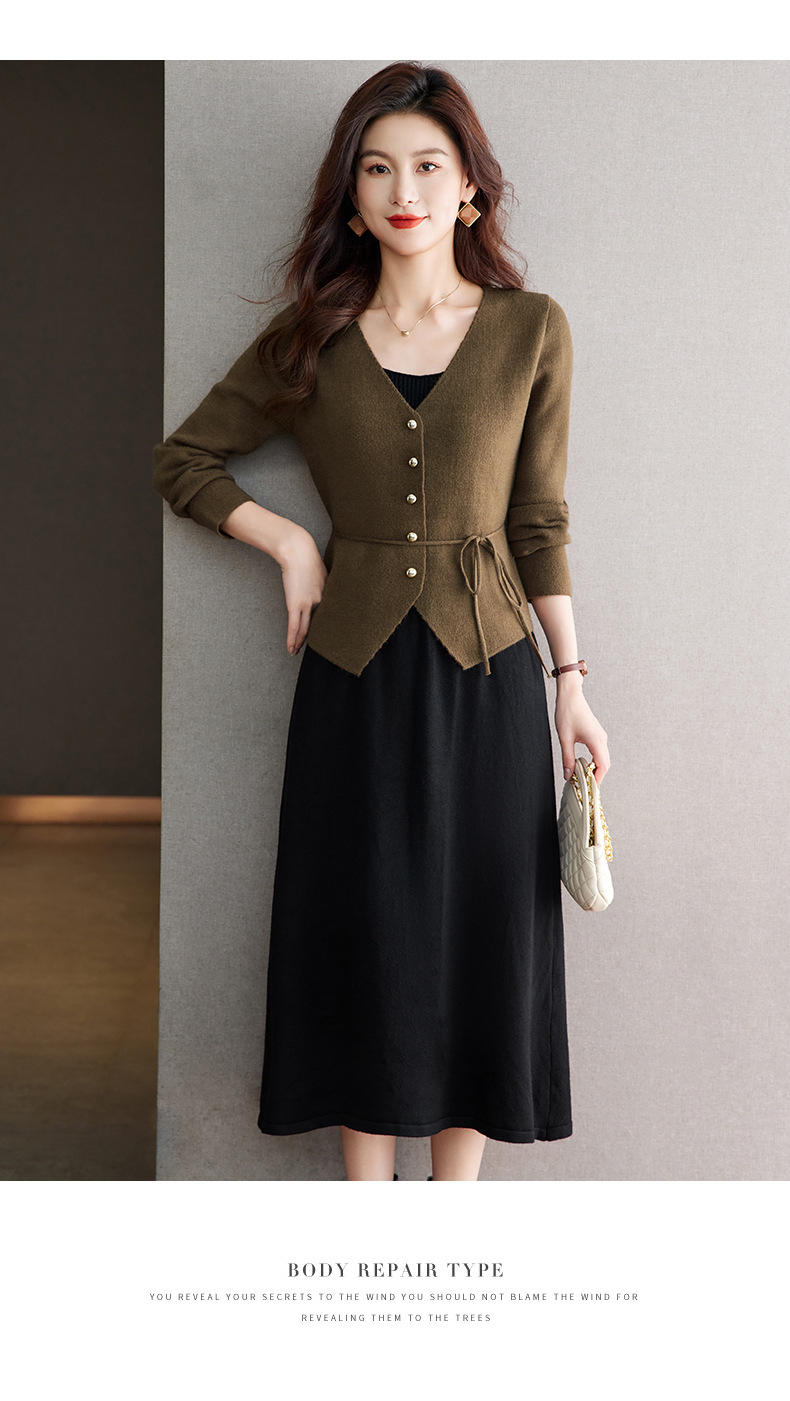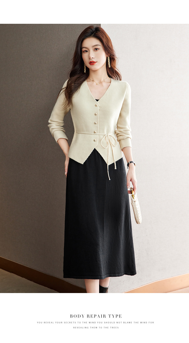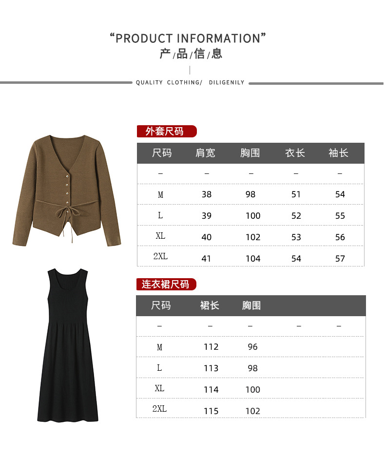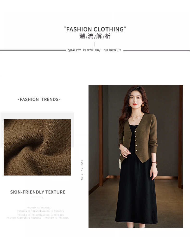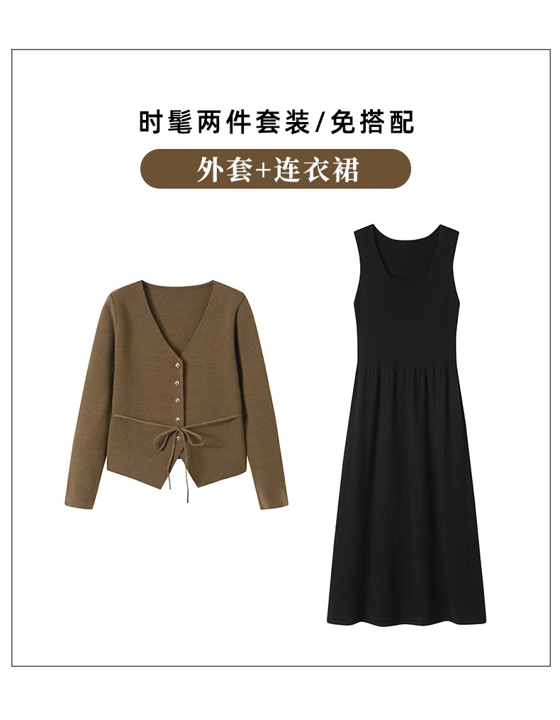 时尚套装V领针织开衫,搭配修身收腰连衣裙两件套CC&22-1307