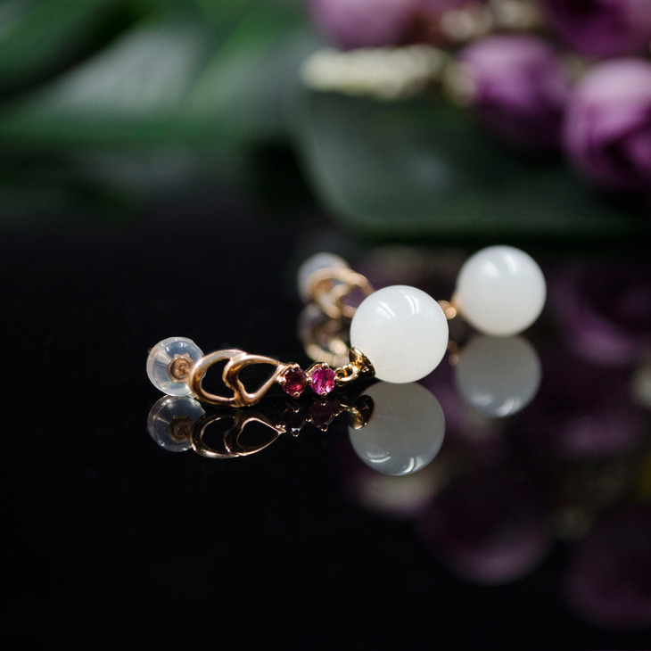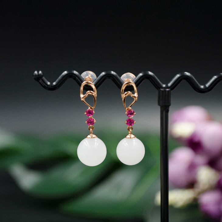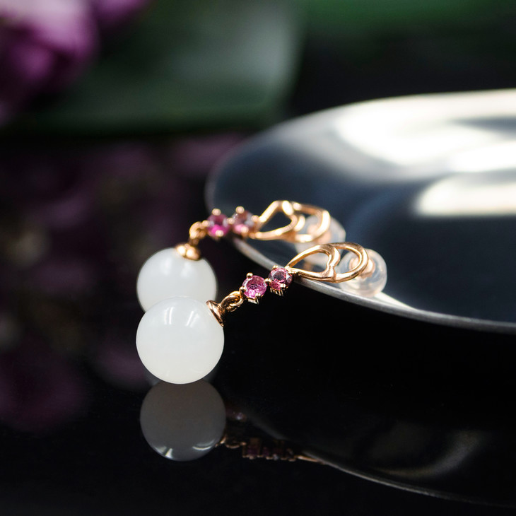 18K玫瑰金和田玉(白玉)玉珠耳饰