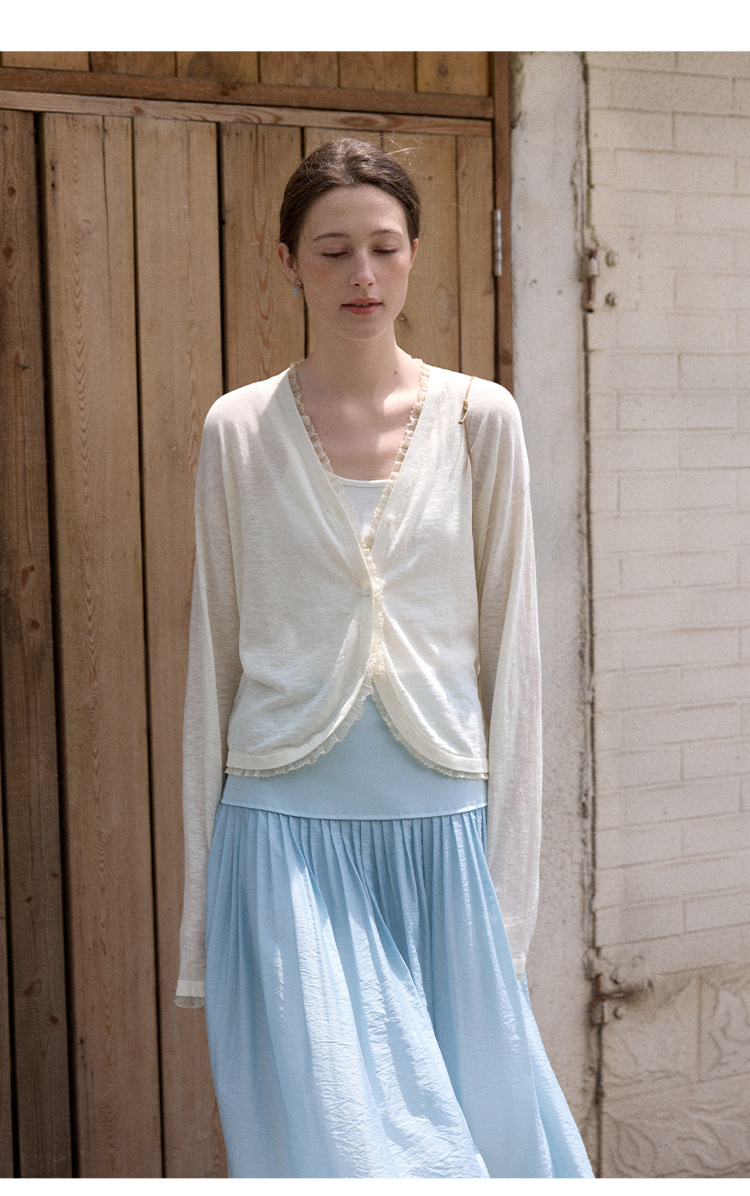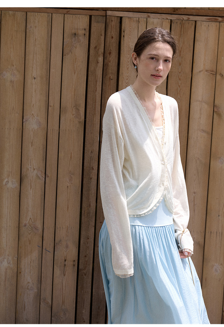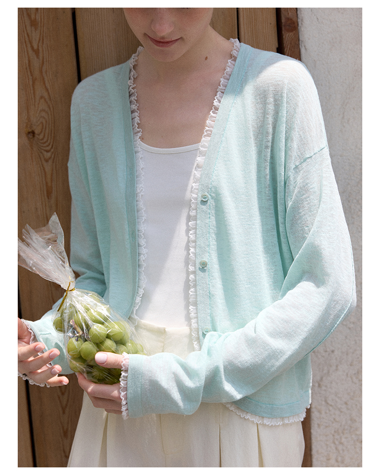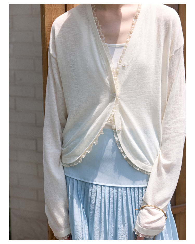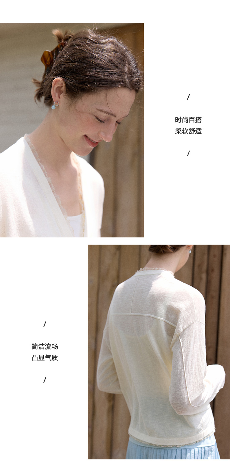 Even Vintage | 棉亚麻混纺 弧形下摆宽松百搭长袖防晒花边开衫