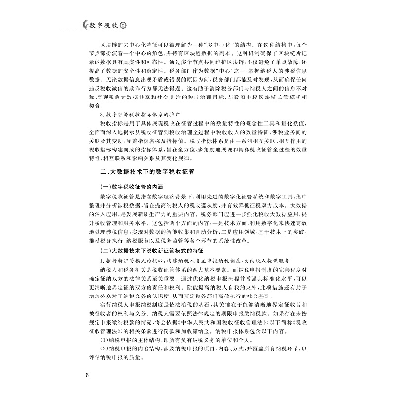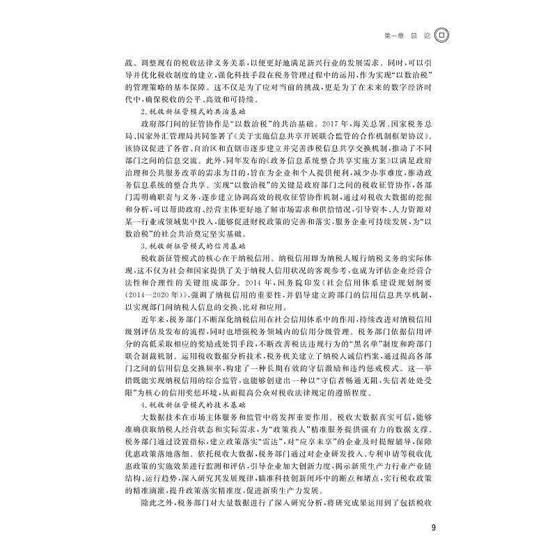 本教材全面阐述了我国大数据与数字税收发展的理论与实务,内容新颖,体例整严,与其他同类教材相比,具有如下突出的特色与创新。教材瞄准国家战略需求,围绕国家大数据战略、深化税收征管改革等新型热点,紧跟新一轮财税体制改革,展开一系列数字税收相关教学。教材满足互联网时代学习特性需求,提供了丰富的教学资源,突显学科核心素养,注重学生的参与感、体验感、获得感,搭建线上互动教学平台,积极探索新文科建设背景下的教学策略变革。教材准确把握教材定位、课程标准、学术要求,文体简练,反映最新科研理论成果和时代趋势,适合高校师生进行教学工作。在坚持理论高度的基础上,通过实际案例解读、延伸阅读、相关知识链接等,将晦涩难懂的学术文字与生动形象的生活情景联系在一起,在扩大学生知识面的同时,降低学习难度,增添学习趣味,既有一定的理论高度,又尽量生动有趣;同时,除复习思考题之外,在每章节的后面均增添了课堂思政,坚持“贴近生活、贴近实际、贴近学生”的思路,积极引导专业学生进行探究式和个性化学习。