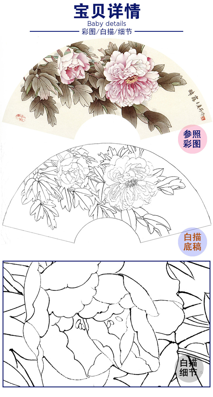 工笔花鸟白描底稿-牡丹扇面小品-王庆升《醉露》-多种白描尺寸可选-SL12