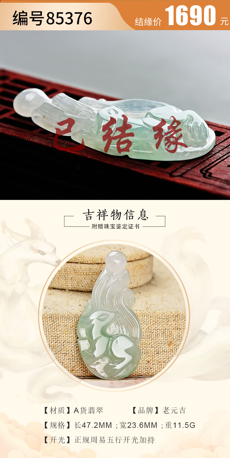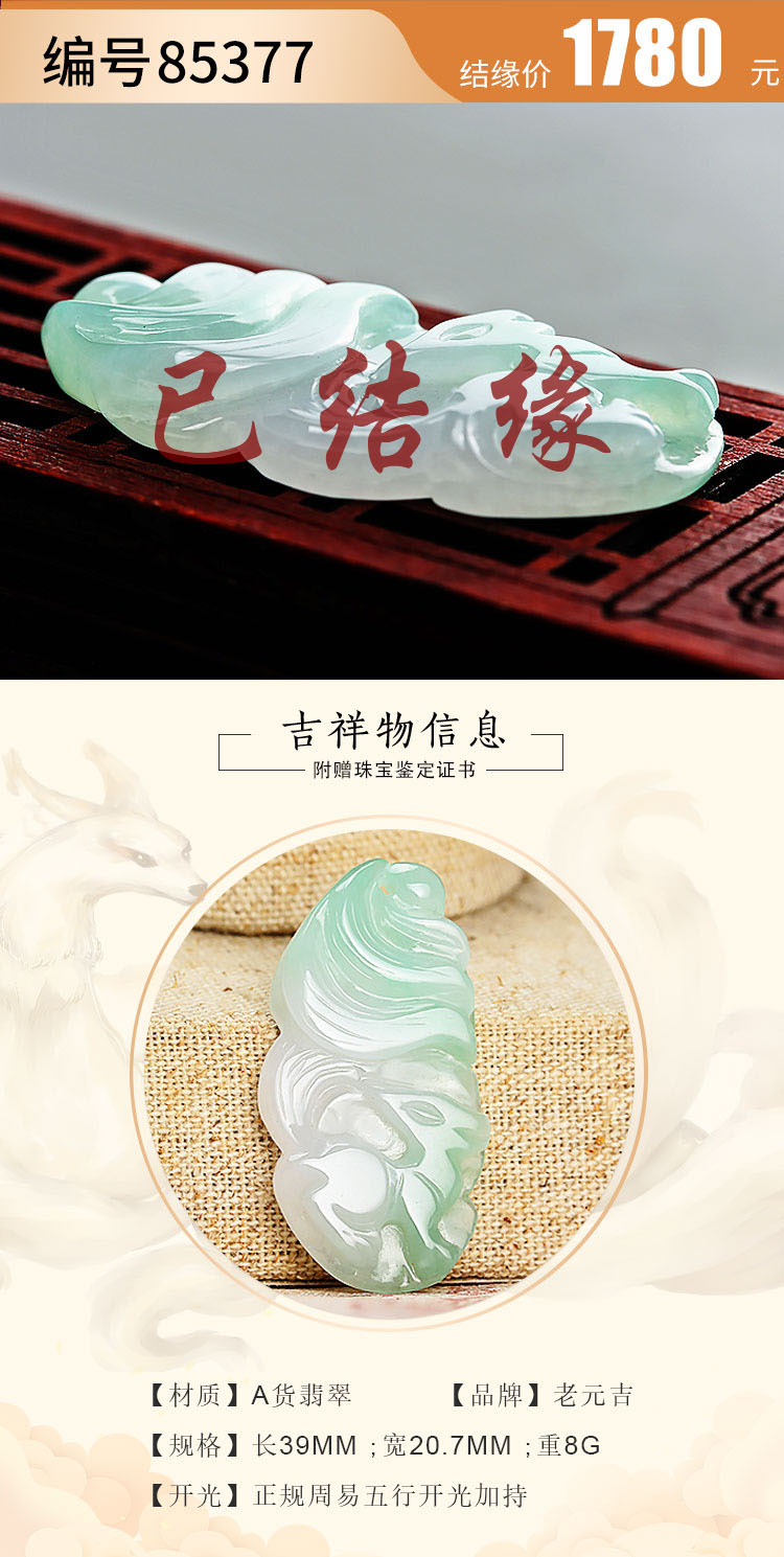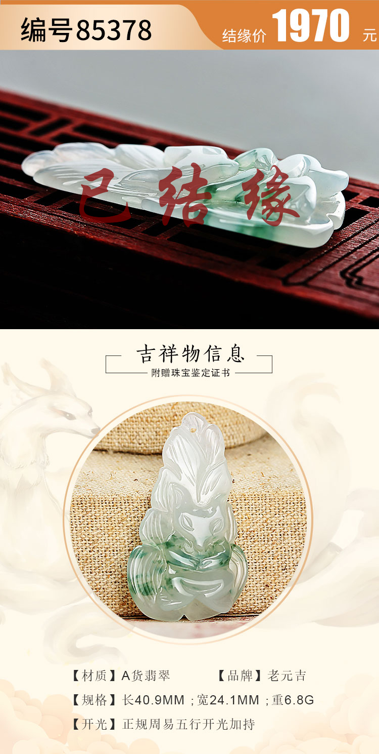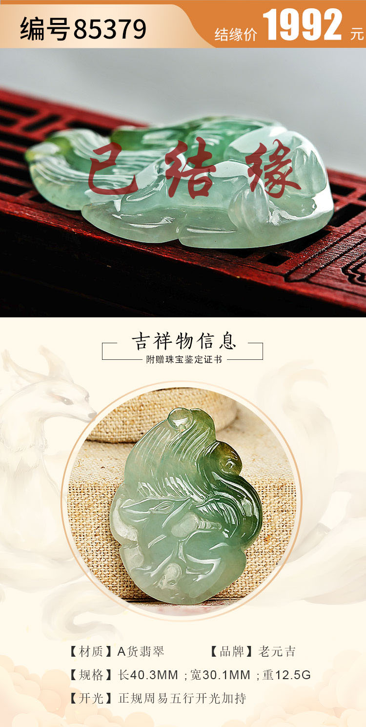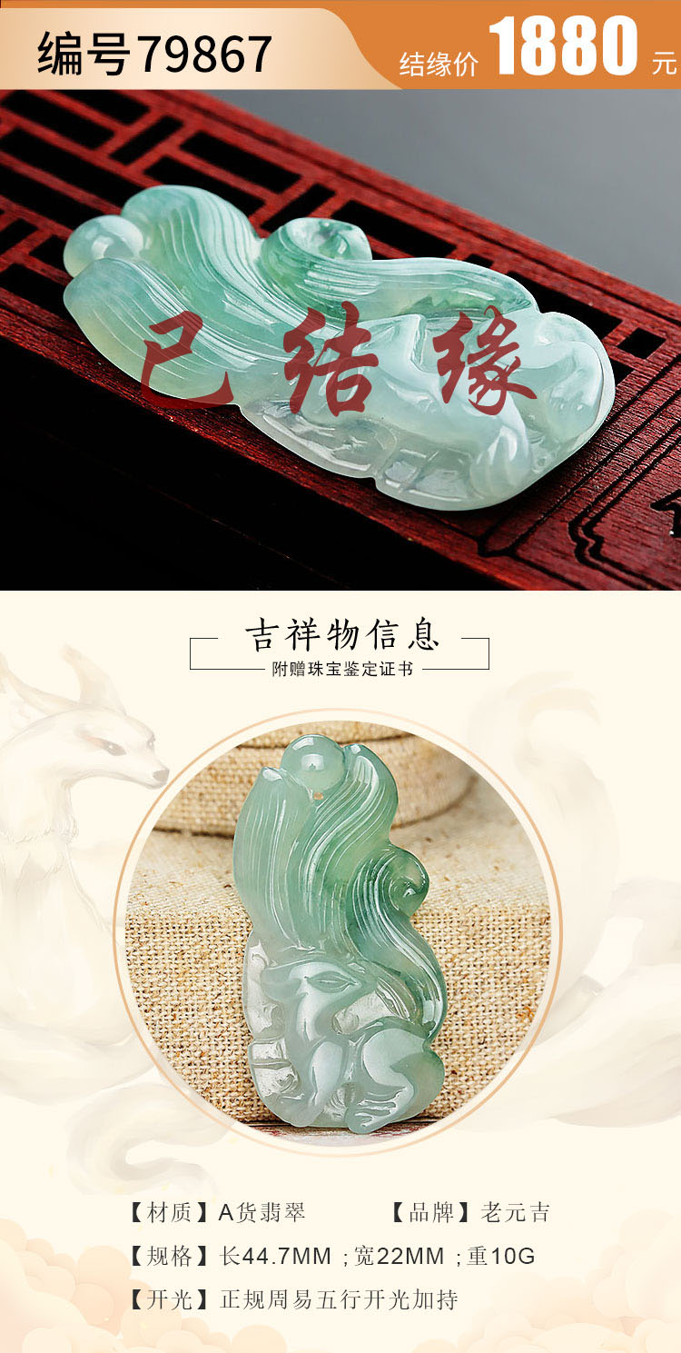 老元吉A货【翡翠九尾狐】吊坠玉石雕刻件
