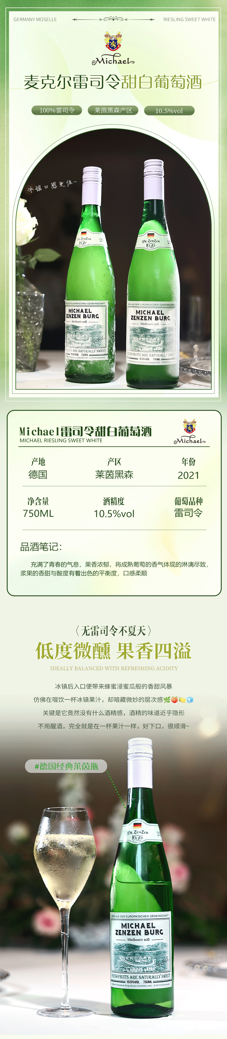 热卖中!!1919全球酒水连锁专柜款!【德国原瓶进口】麦克尔Michael雷司令甜白葡萄酒 10.5度甜型 750m/瓶