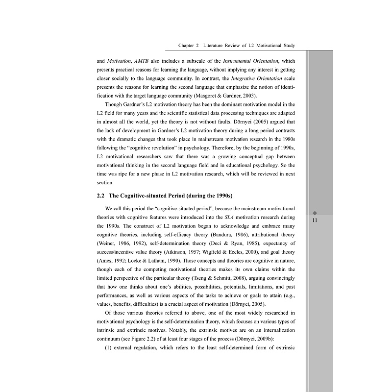 首先在对目前zuixin的二语动机理论——“二语动机自我系统”理论在中国学习者中的效度进行了探讨,然后在中国英语学习者中做了实证调查和实验研究。实证调查研究发现,在二语动机自我系统要素对二语学习动机贡献强度与学习者的二语水平密切相关。本研究结果对“二语动机自我系统”理论有局部拓展,并具有一定教学启示。实验研究发现基于提升“二语自我”为核心的教学干预对二语学习动机及二语成绩有显著影响。