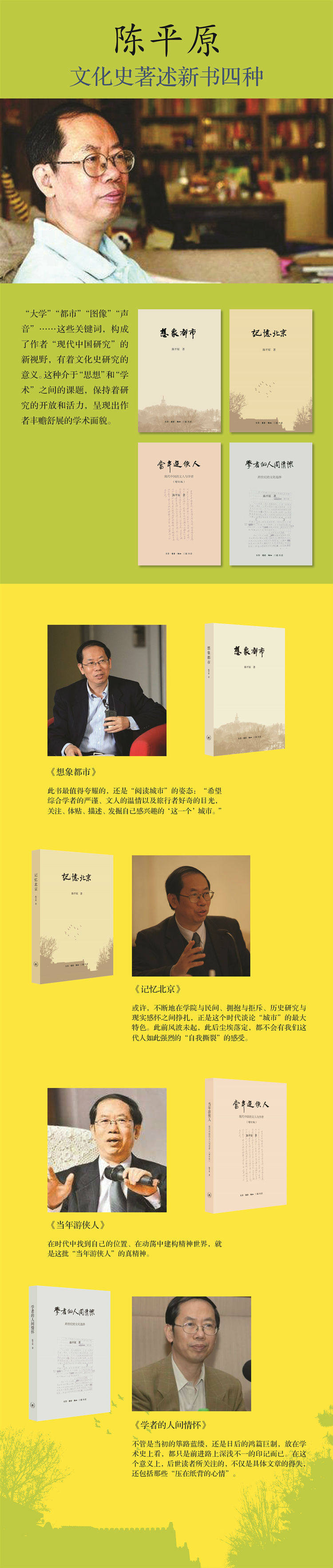 学者的人间情怀——跨世纪的文化选择》各篇文章,写作时间从1991年至2007年不等,内容涉及学术研究心得、学科关系考量、新的技术发展下的学术发展路径等内容,是作者在学术研究和教学生活中的随笔偶得,是作者的学术自况与人生感悟,可谓亮出陈平原底牌之作。阅读中可了解到陈平原作为文学研究大家,在世纪之交前后二十年间,对巨变的社会及学术文化的独到思考,展现了一位学者的文化担当和社会关怀,对于读者应有许多启迪意义。