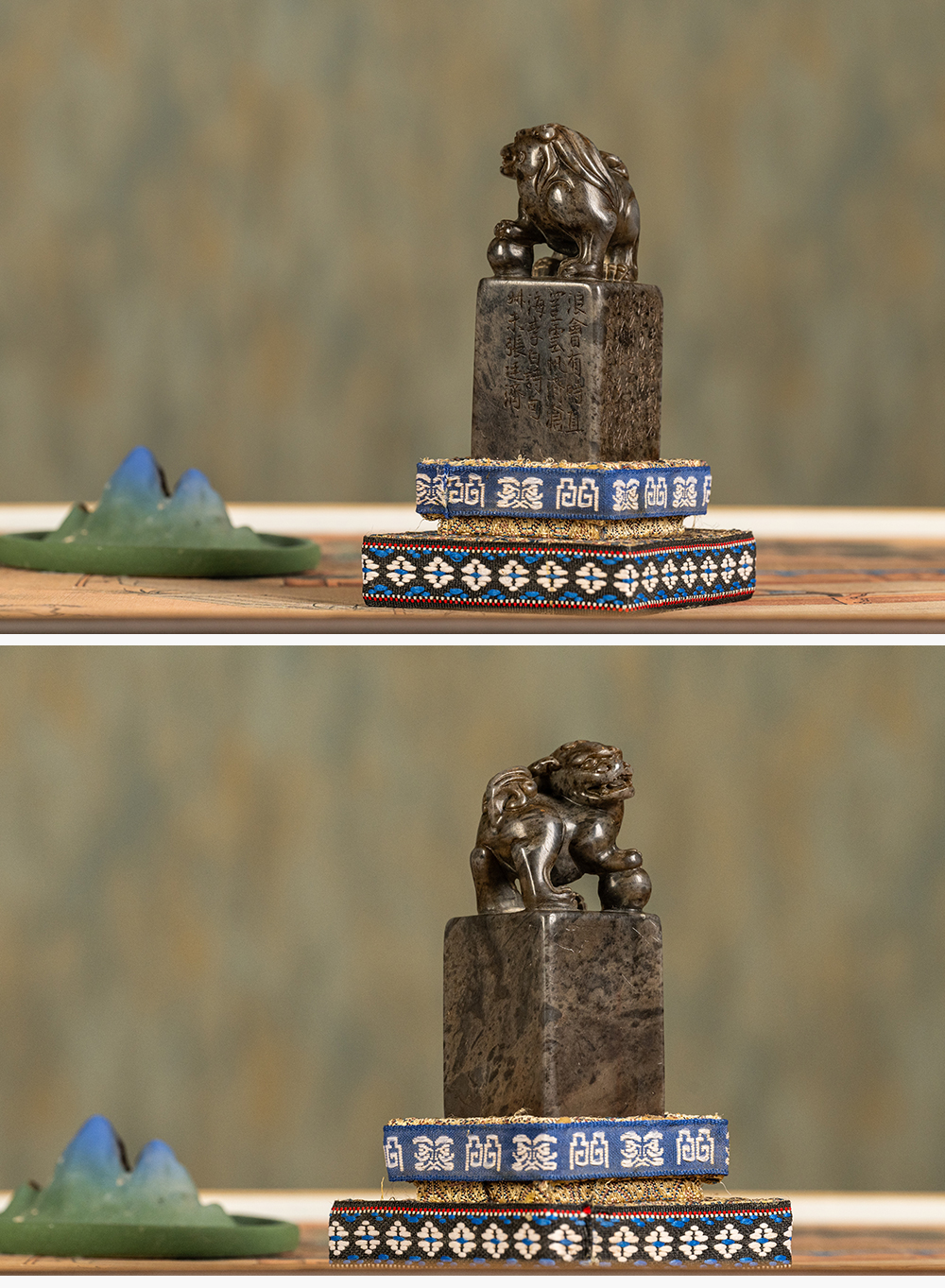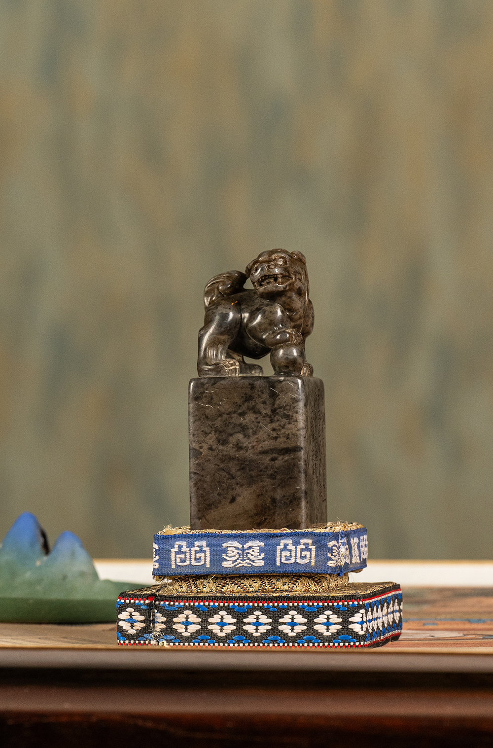 清 沈景修款端石狮纹辟雍砚(红木天地盖)