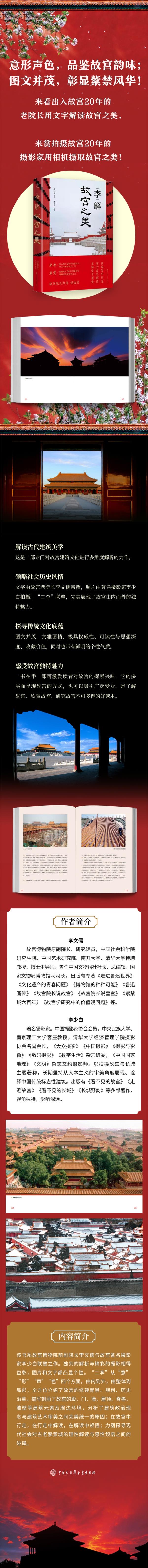 该书系故宫博物院前副院长李文儒与故宫著名摄影家李少白联璧之作。独到的解析与精彩的摄影相得益彰,图片和文字都凸显个性。“二李”从“意” “形” “声” “色”四个方面,由内到外,由整体到局部,全方位介绍了故宫的修建背景、规划、历史沿革,描写刻画了故宫的殿、门、墙、屋顶、脊兽、雕塑等建筑元素及周边环境,分析了建筑政治理念与建筑艺术审美之间完美统一的原因;在故宫中行走,在行走中解读,在解读中领悟;力图探寻现代社会对古老紫禁城的理性解读与感性领悟之间的碰撞。