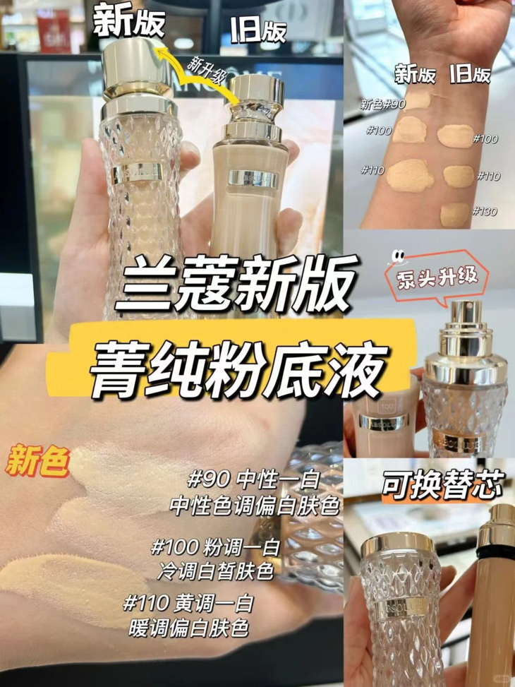 👑兰蔻菁纯粉底液(2025) ✨全新兰蔻菁纯粉底液,更奢润,更饱满,更持色! 💎一瓶粉底塑造中式气韵骨相妆感 🌟低调又贵气,让脸由内而外透亮饱满、气血感🔝 🌹高浓玫瑰水加乘抗氧维E,24H持色不暗沉 💚86%菁纯精华入妆,上妆即养肤 🥰带妆整日不拔干,出油不斑驳,补妆不搓泥 ✅️#90:自然白,适合中性色调偏白肤色 ✅️#100:粉一白,适合冷调白皙肤色 ✅️#110:自然白,适合暖调偏白肤色