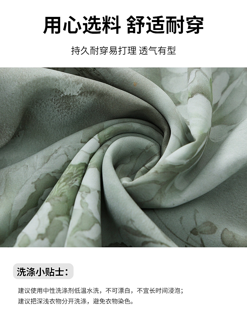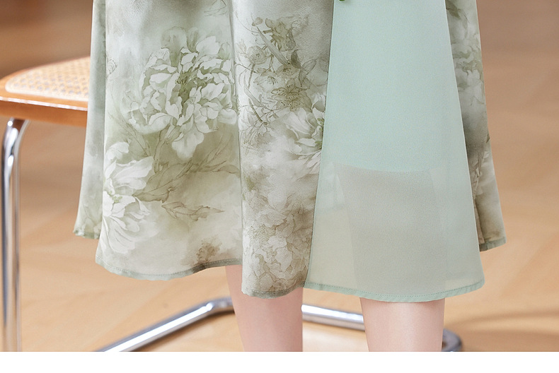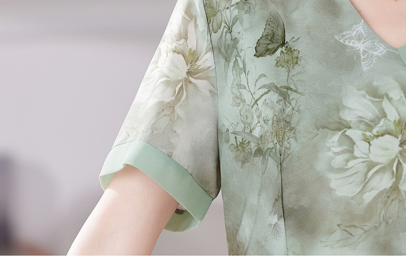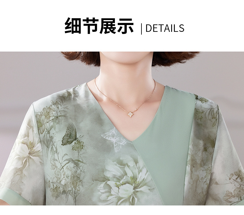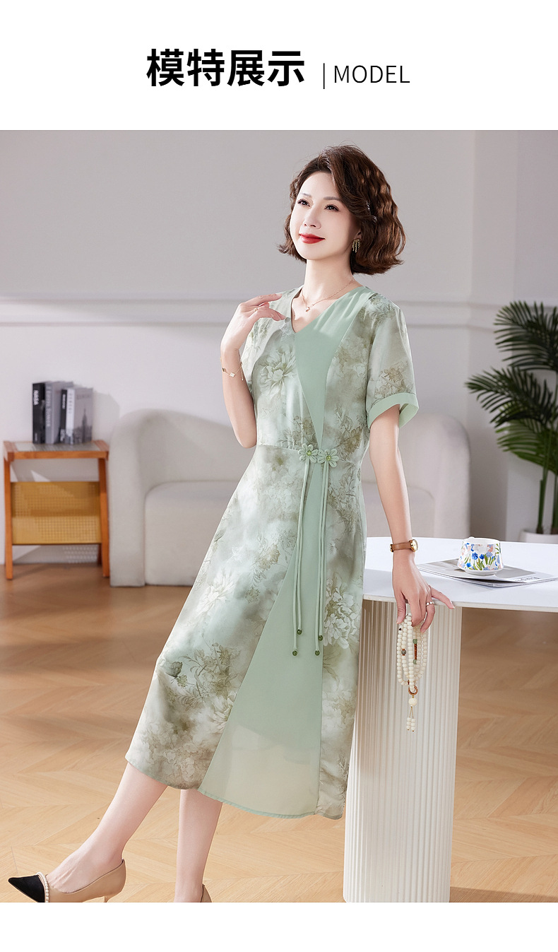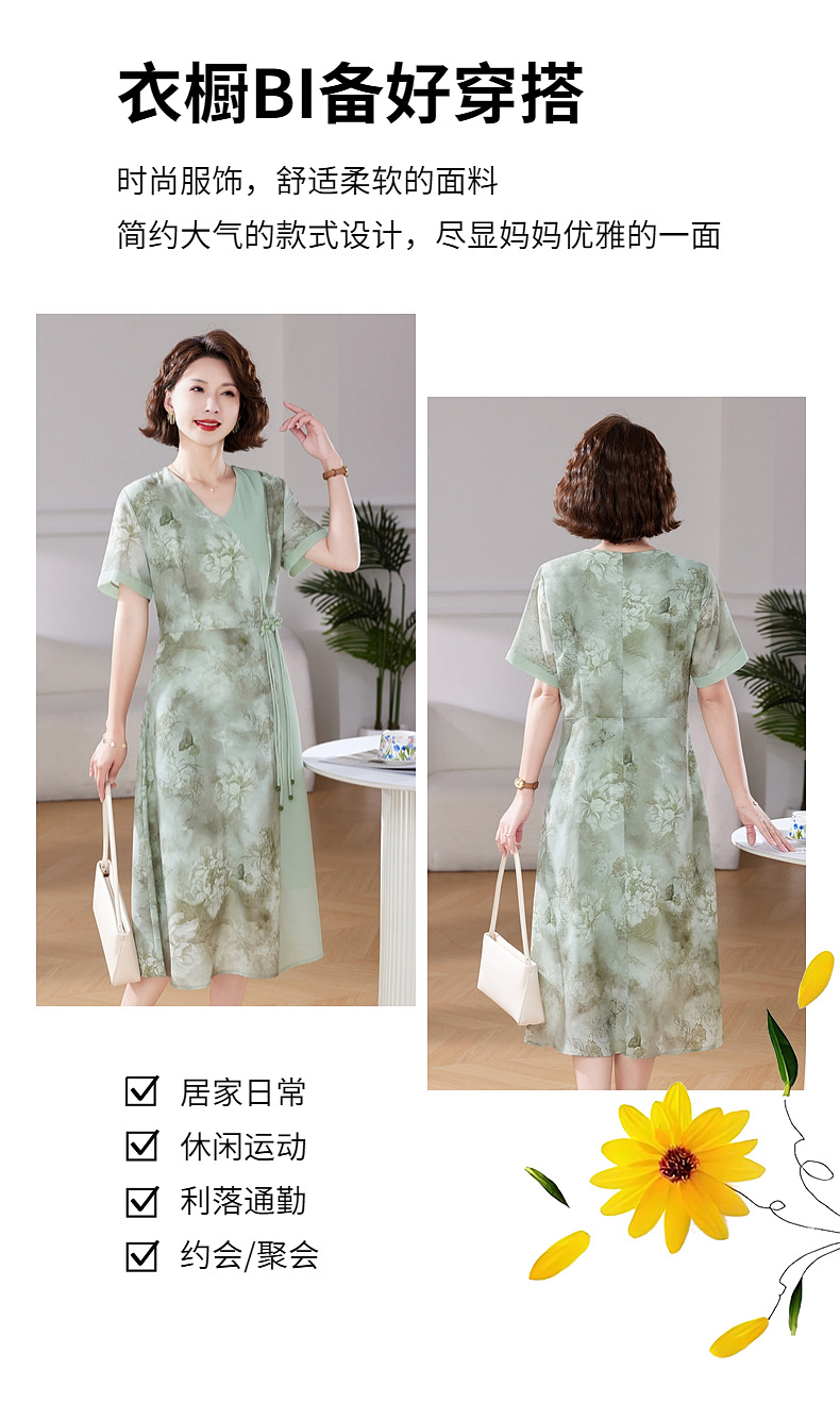 C2830新中式妈妈夏装连衣裙雪纺过膝中老年人女士短袖裙子遮肚显瘦洋气
