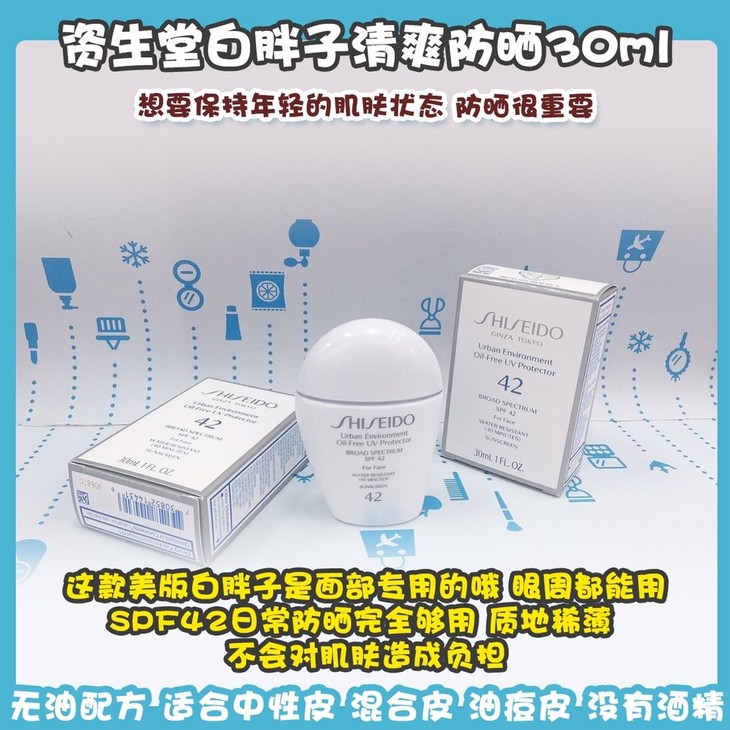 资生堂白胖子清爽防晒30ml👍想要保持年轻的肌肤状态,防晒很重要☀!这款美版白胖子是面部专用的哦,眼周都能用👀,SPF42日常防晒完全够用。质地稀薄,不会对肌肤造成负担🙅。有一定防水性,稍有提亮效果✨,擦上会给人一种自然白皙好肤色的感觉,适合一年四季日常使用✔。无油配方!适合中性皮、混合皮、油痘皮。没有酒精❌,敏感皮也无压力!不闷痘不闷痘不闷痘,重要的事情说三遍‼️