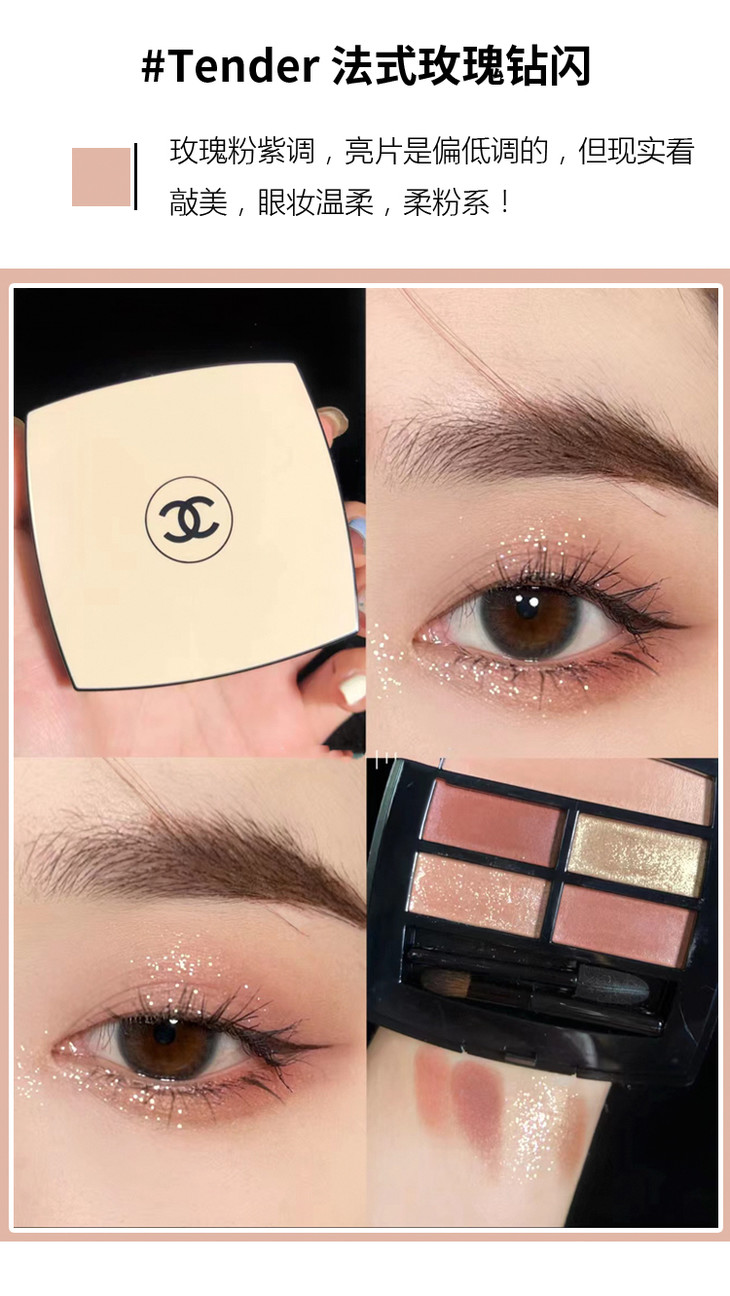 👑CHANEL四色眼影#TENDER 👍玫瑰粉紫调,#TENDER玫瑰粉棕盘真的是温柔的代名词🌷~ 🎀粉质细腻,亮片是偏低调的,但现实看敲美,温柔眼妆,柔粉系💗! 🌺粉嫩色调叠加玫瑰色加深,妥妥的人间富贵花,又纯又欲又富✨~ 👉日常用它又甜又乖,基本没什么很重的配色,黄皮大胆入也不怕✔