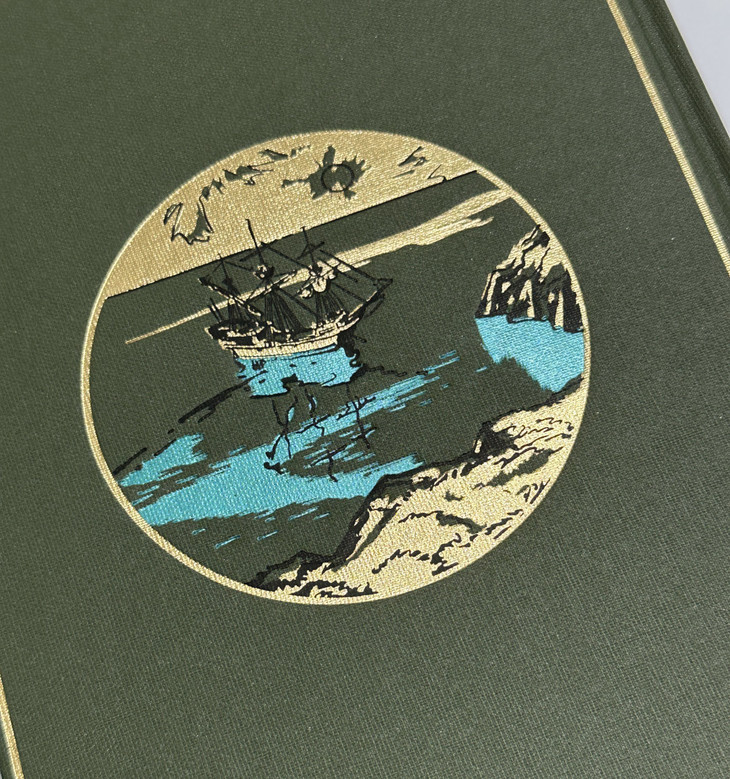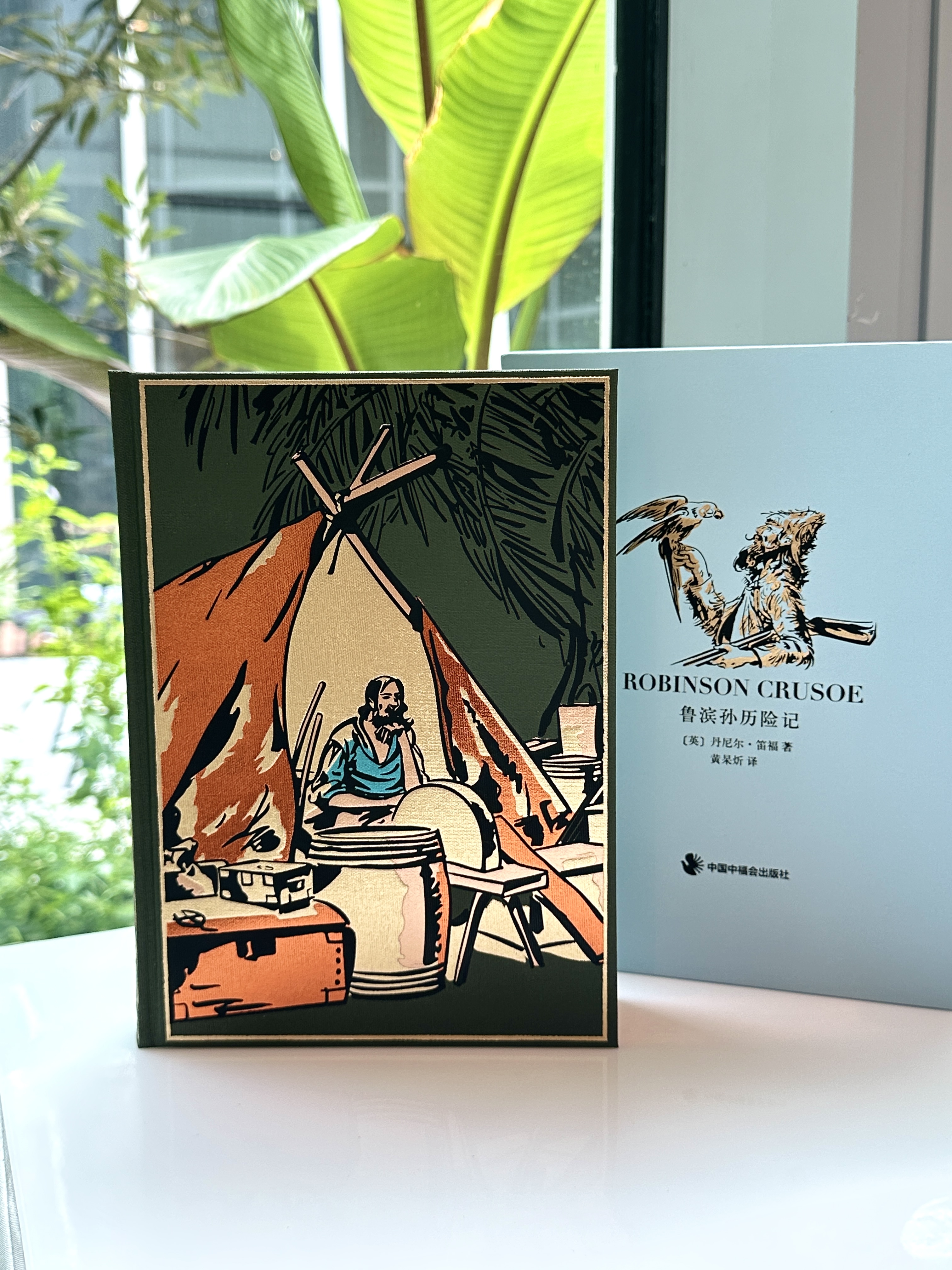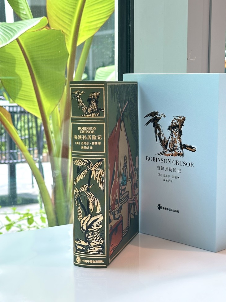 书匣采用充皮纸,用蓝金配色描绘鲁滨孙与手中鹦鹉对视的一刻。