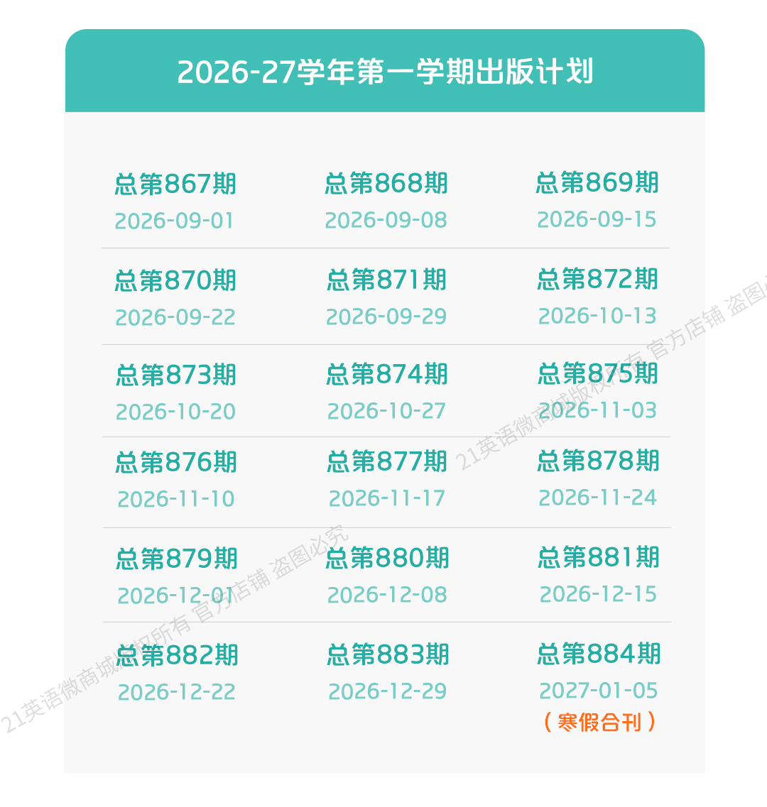 本学年出版计划共包含2期合刊,1期为暑假合刊,定价9元,出版日期为2026年6月30日。1期为寒假合刊,定价9元。出版日期为2027年1月5日。