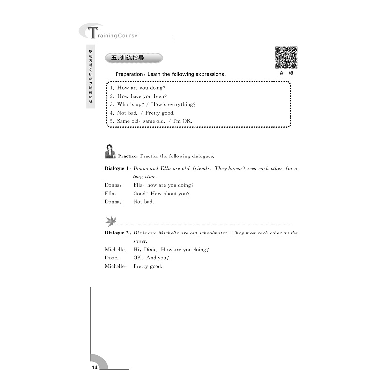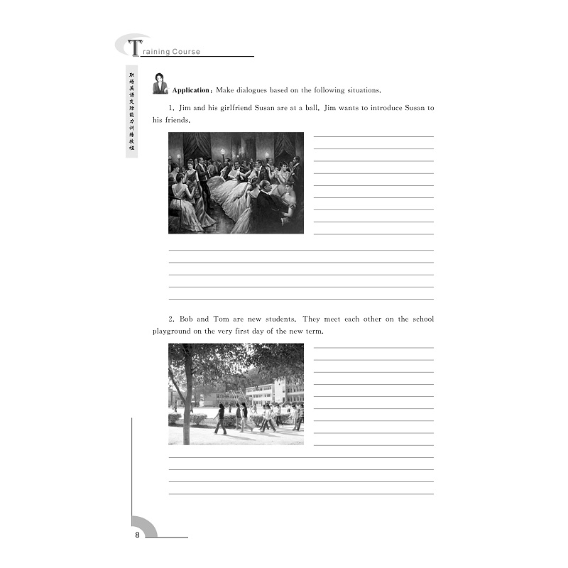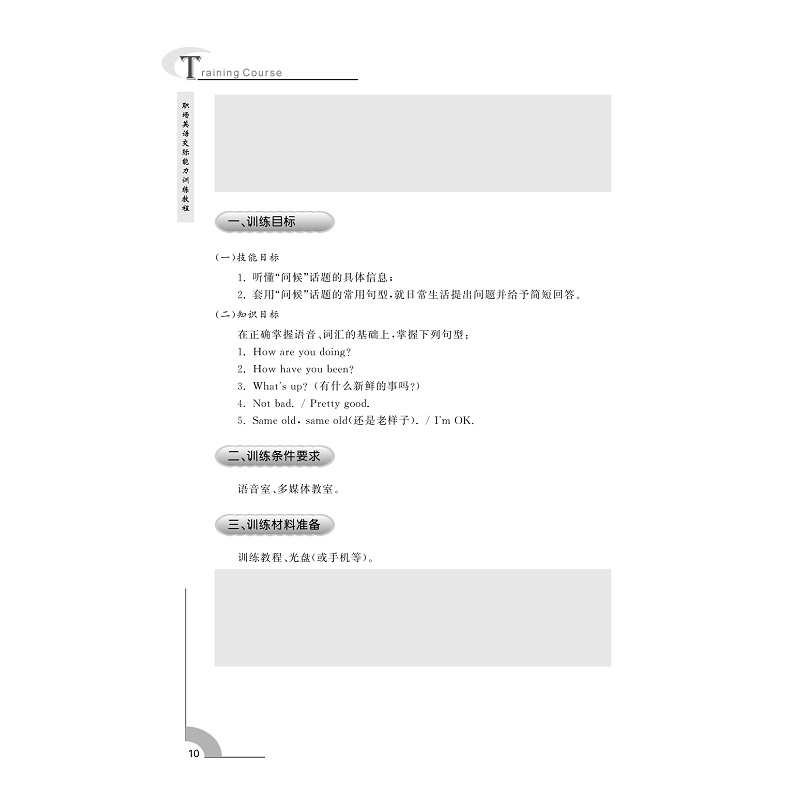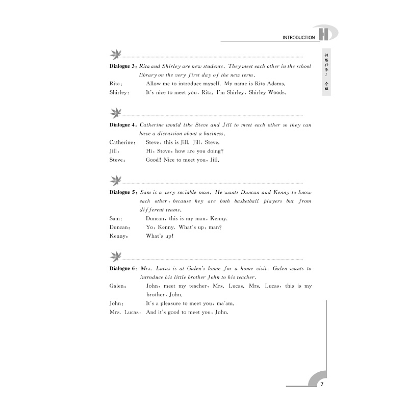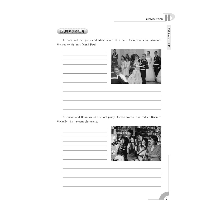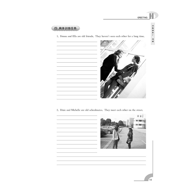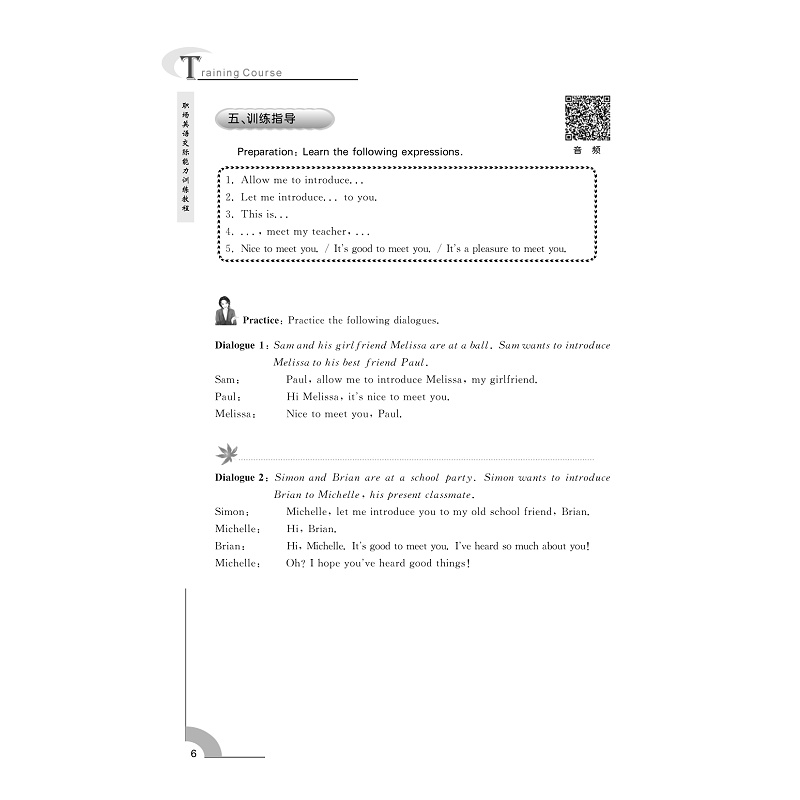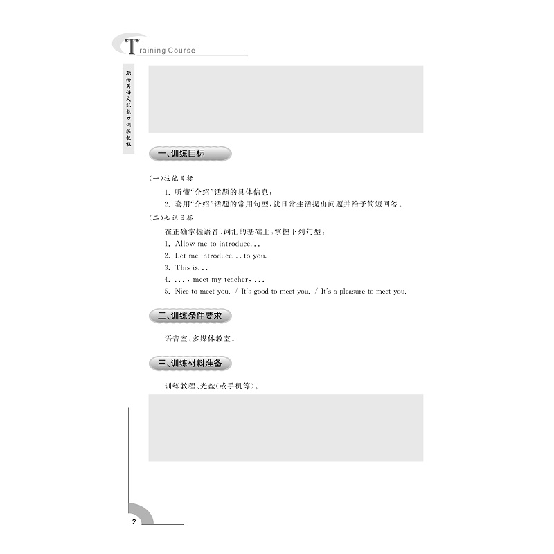 教材把语言实训任务分成“日常活动”(1-11单元)和“商务活动”(12-18单元)两大区域,共18个工作主题,每个主题都是学生在以后涉外活动中可能遇到的工作任务,“日常活动”包括介绍、问候、感谢、致歉、道别、指路、天气、学习、爱好、饮食、健康等主题;“商务活动”包括迎送、安排日程与活动、安排住宿、宴请与迎送会、陪同购物、游览及就诊、面试、介绍公司、工厂等主题。